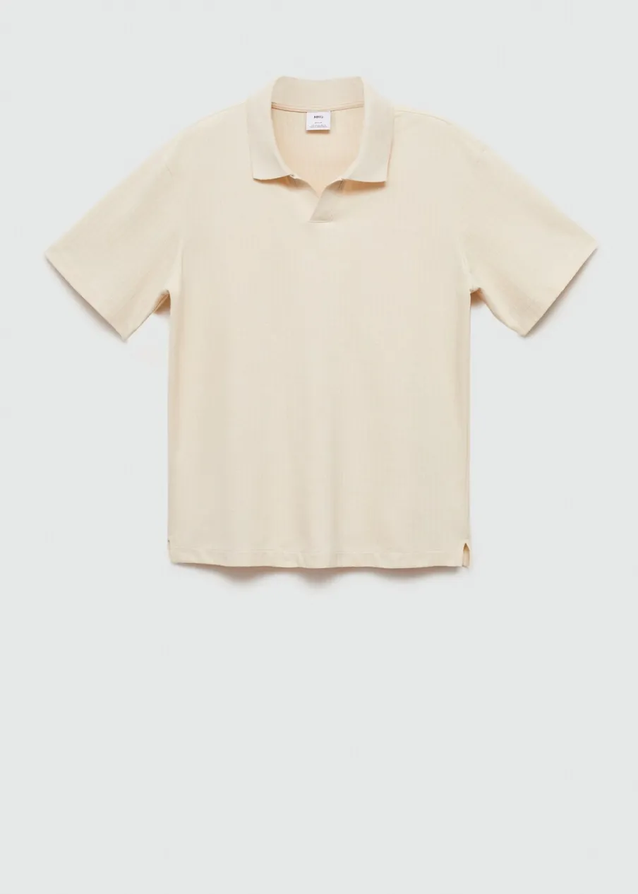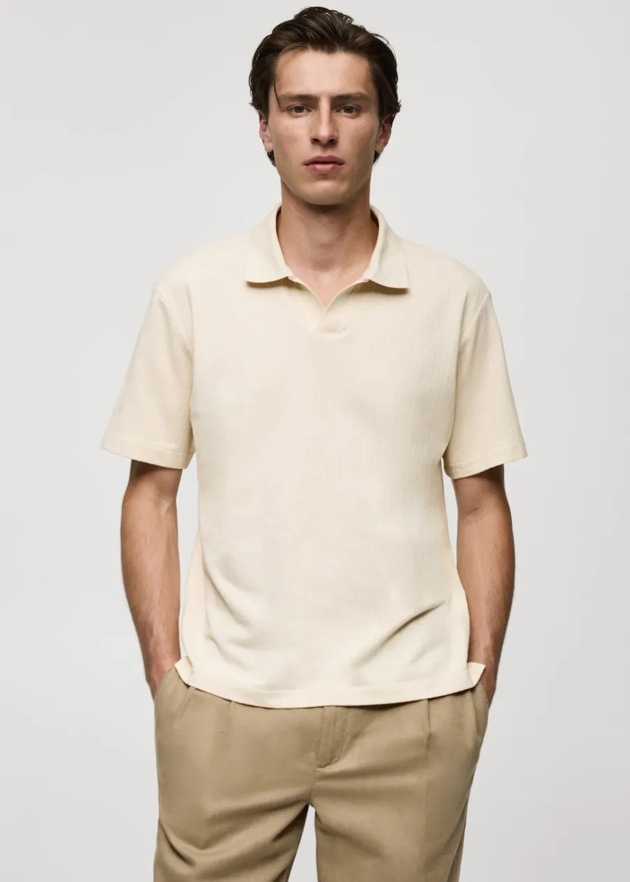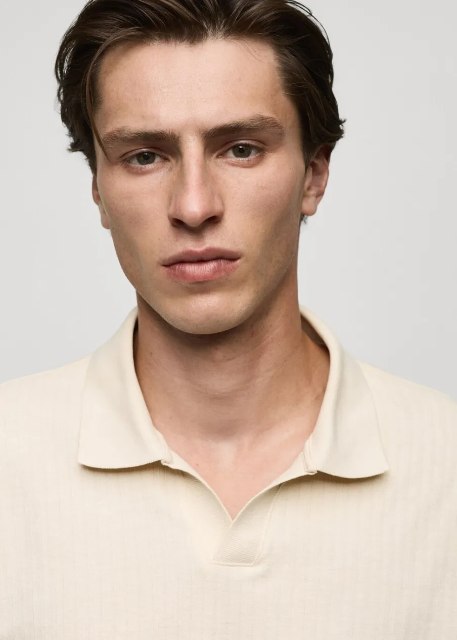 Krój regular. Tkanina mieszanka bawełny. Model ściągaczowy. Kołnierzyk polo z prążkowanej dzianiny z dekoltem w serek. Krótki rękaw. Prosty dół. Model ma 187 cm wzrostu i nosi rozmiar M.