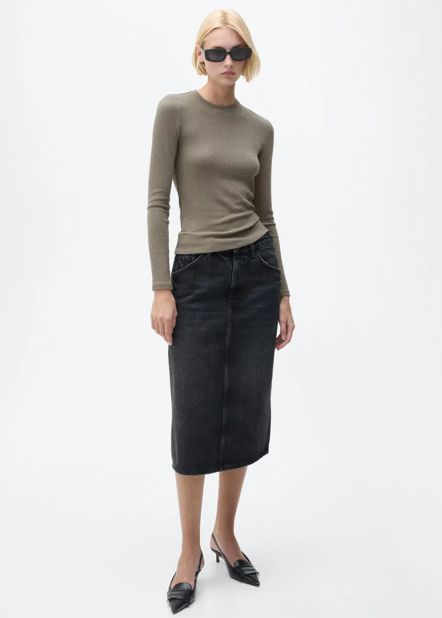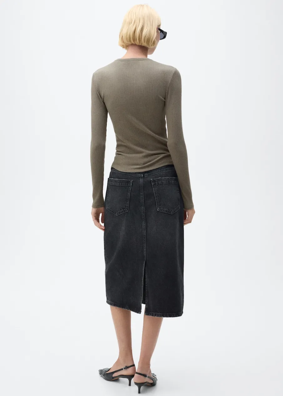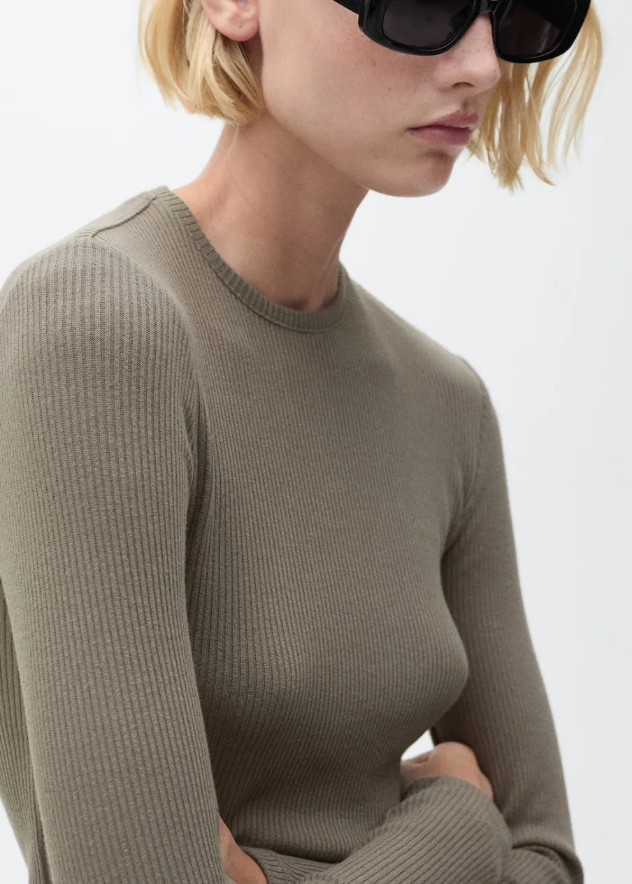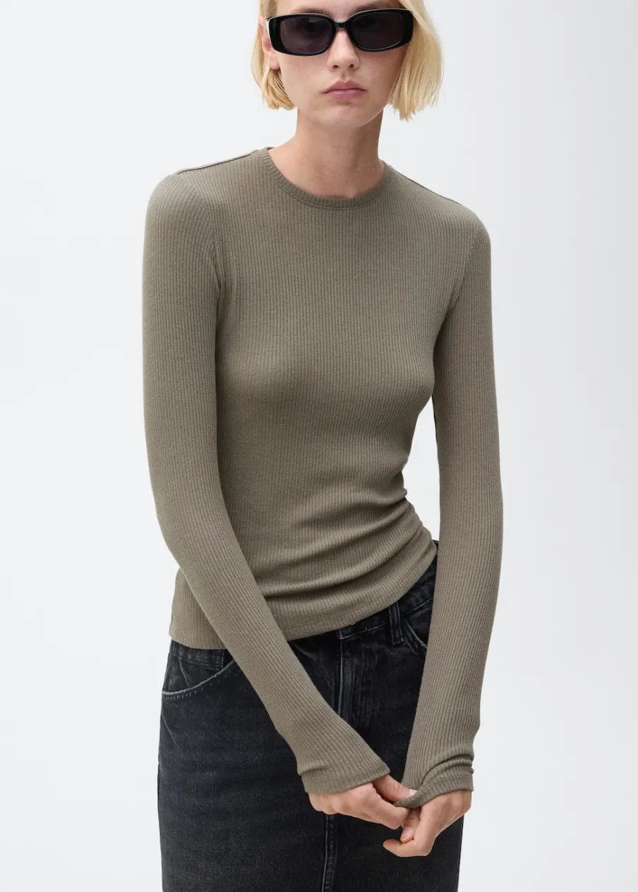 Tkanina ze ściągaczowej dzianiny. Cienka tkanina. Model standardowy. Krój regular. Okrągły dekolt. Długi rękaw. Bez zapięcia.
