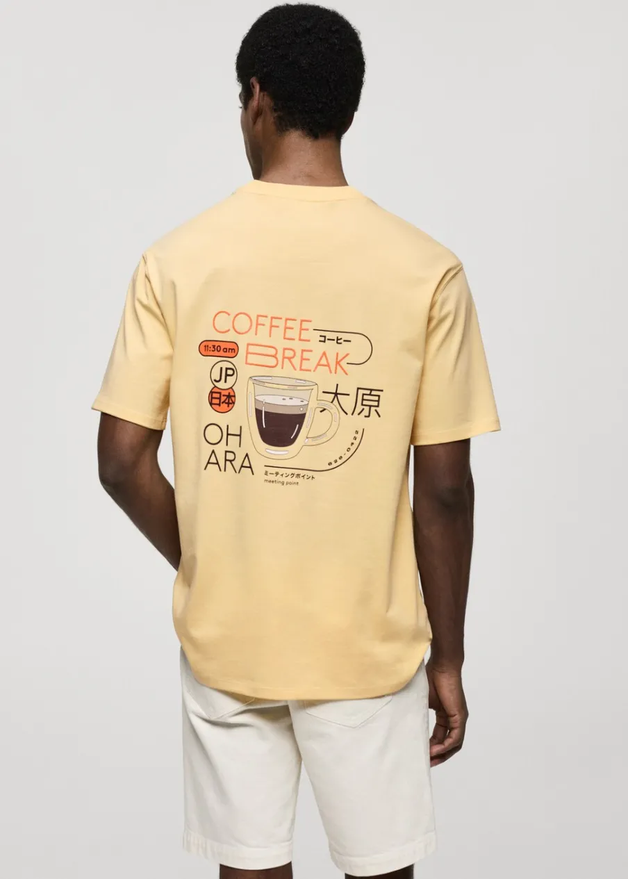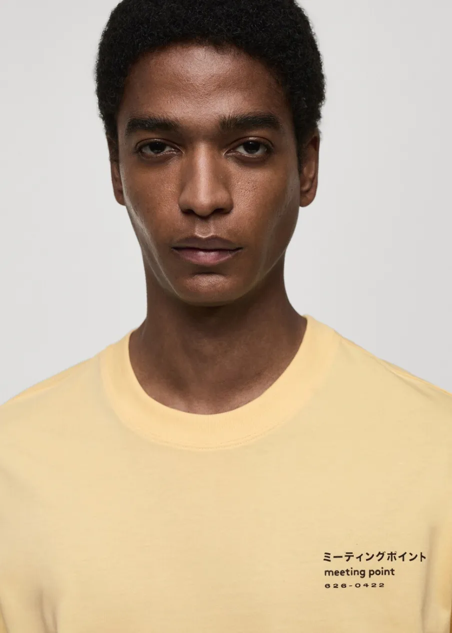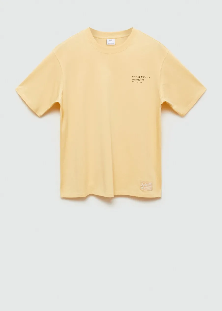 Okrągły dekolt w kontrastowe prążki. Krótki rękaw. Wypukły napis nadrukowany na piersi. Ozdobna łatka. Prosty dół. Model ma 185 cm wzrostu i nosi rozmiar M. Wypukły nadruk z tyłu. Naszywka u dołu. Tkanina z 100% bawełny.