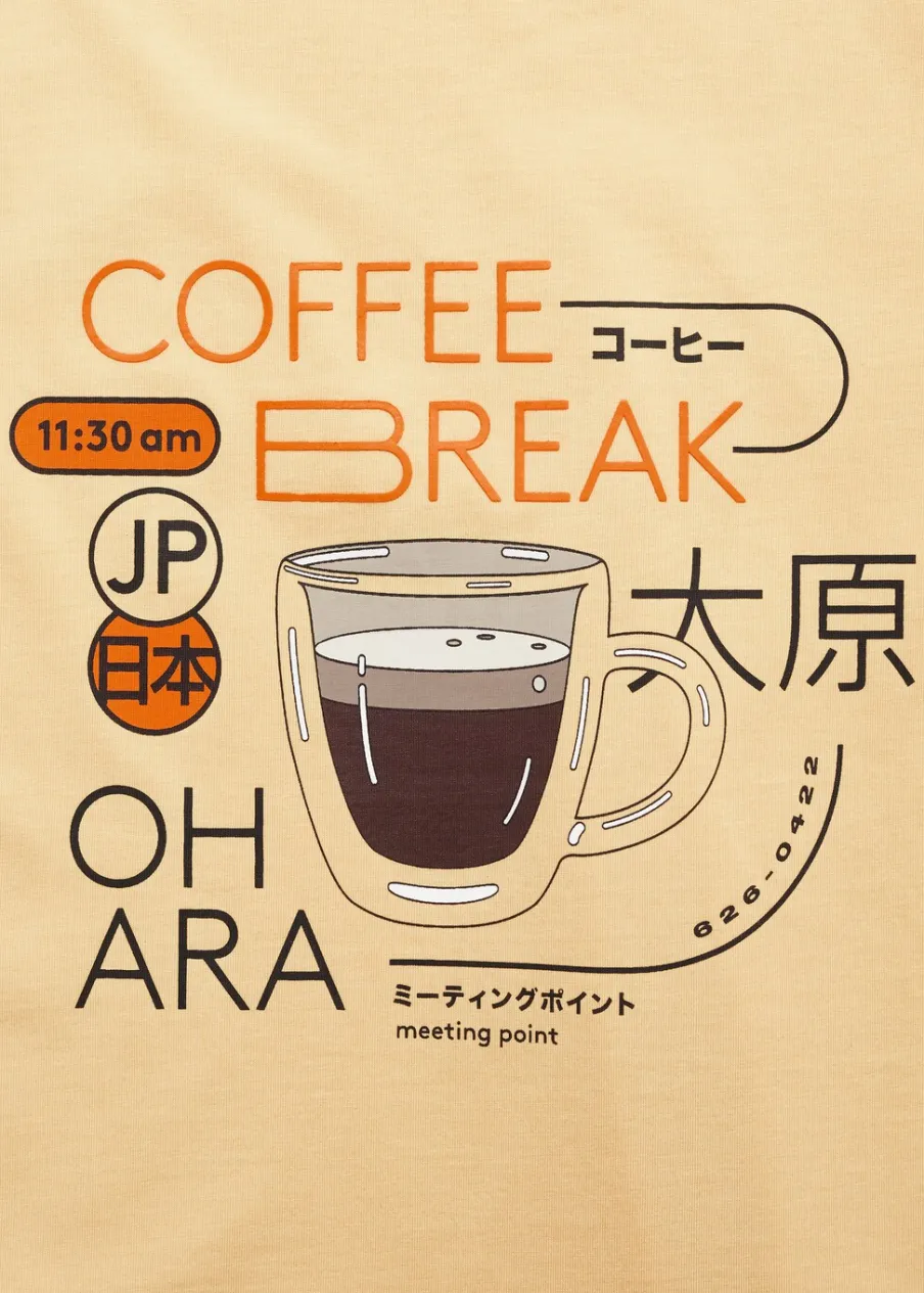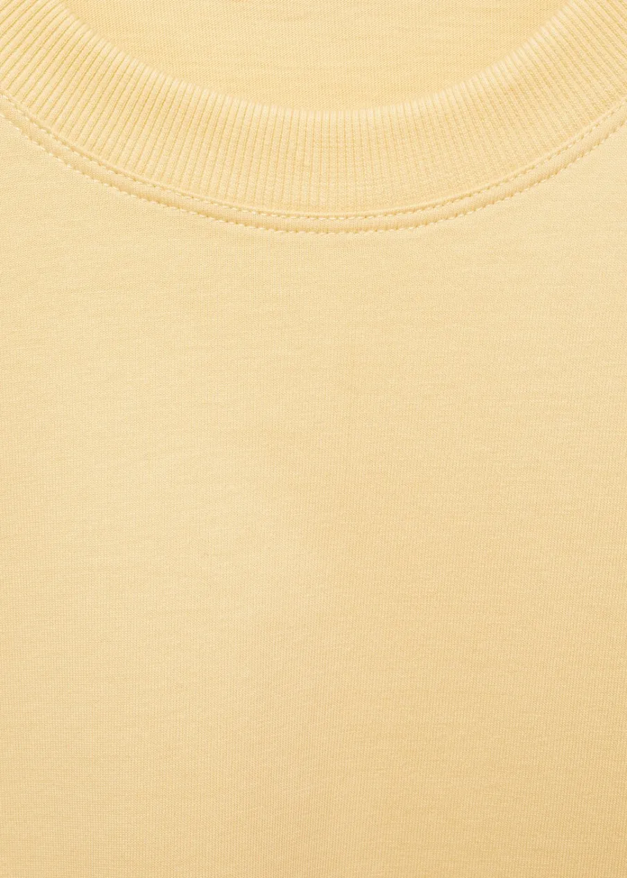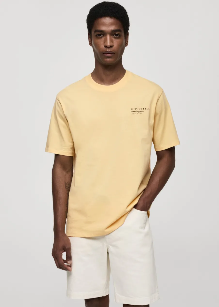 Okrągły dekolt w kontrastowe prążki. Krótki rękaw. Wypukły napis nadrukowany na piersi. Ozdobna łatka. Prosty dół. Model ma 185 cm wzrostu i nosi rozmiar M. Wypukły nadruk z tyłu. Naszywka u dołu. Tkanina z 100% bawełny.