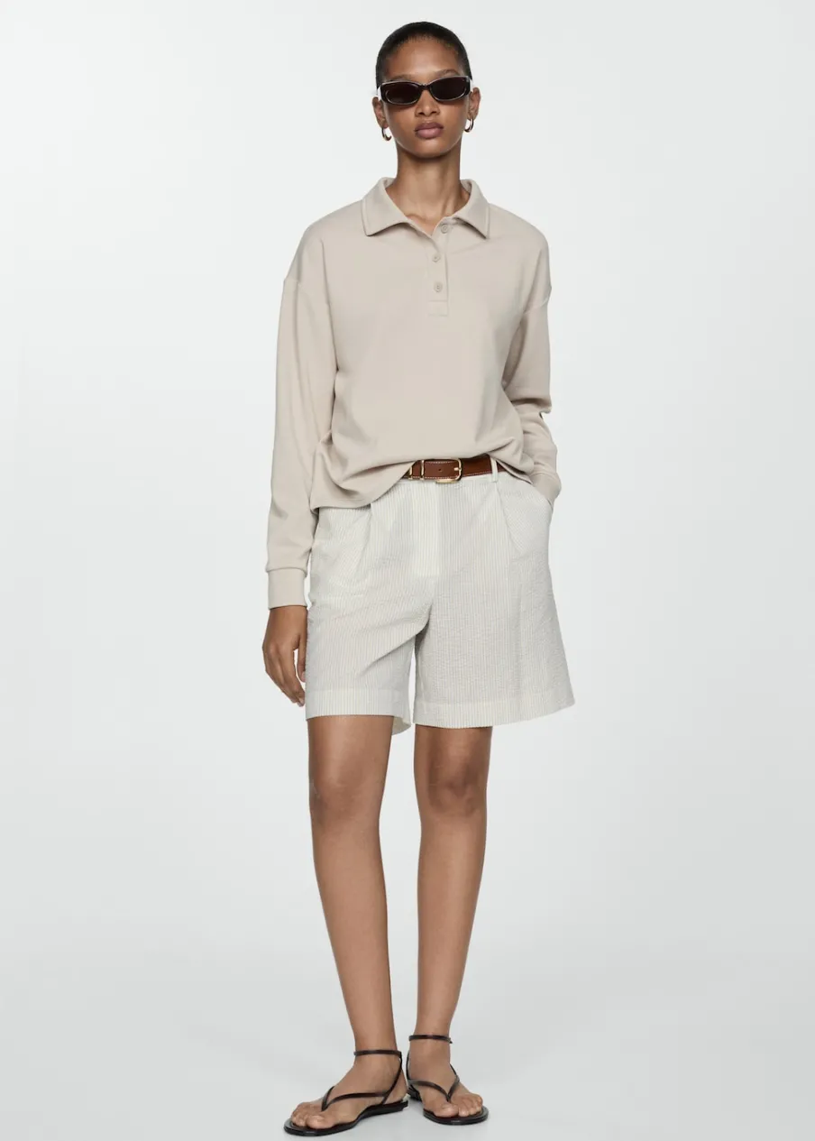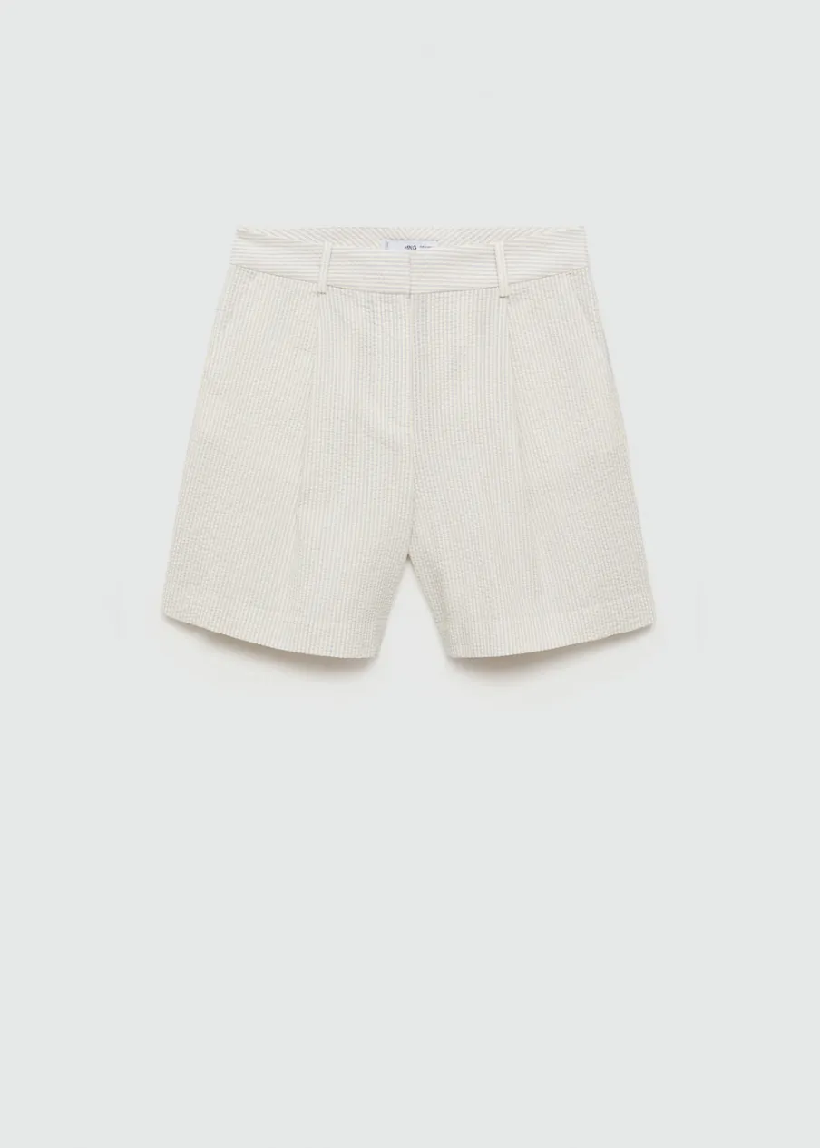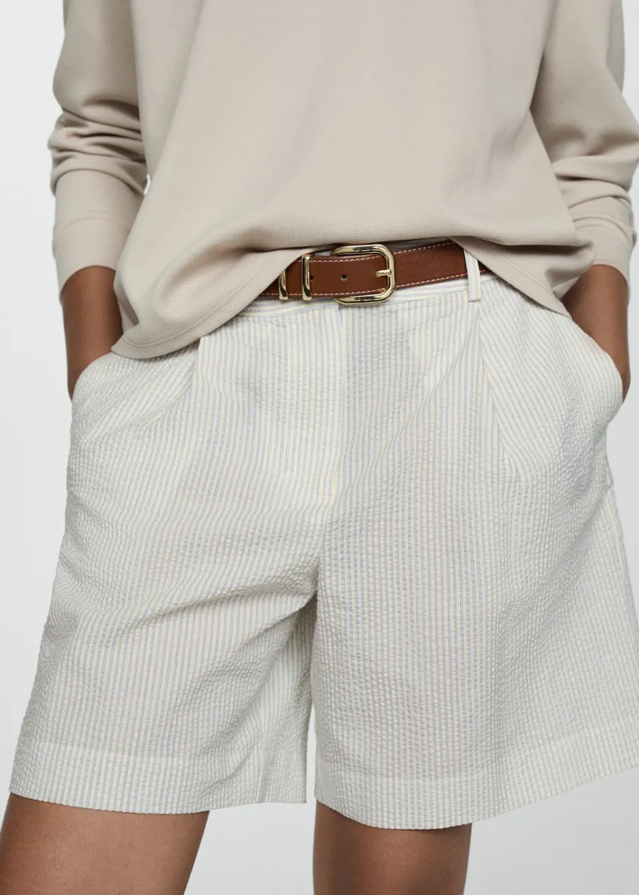 OpisModel prosty. Krótki krój. Wzór w pasy. Dwie kieszenie boczne. Dwie wpuszczane kieszenie z tyłu. Szlufki. Kryte …