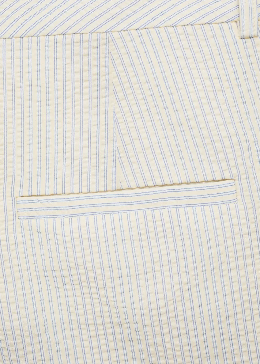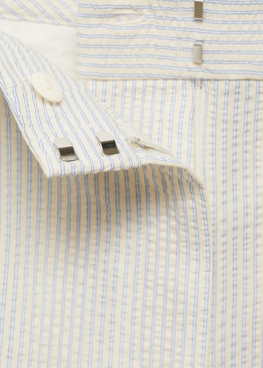 Model prosty. Krótki krój. Wzór w pasy. Dwie kieszenie boczne. Dwie wpuszczane kieszenie z tyłu. Szlufki. Kryte zapięcie na guzik, haftkę i suwak. Tkanina z 100% bawełny.