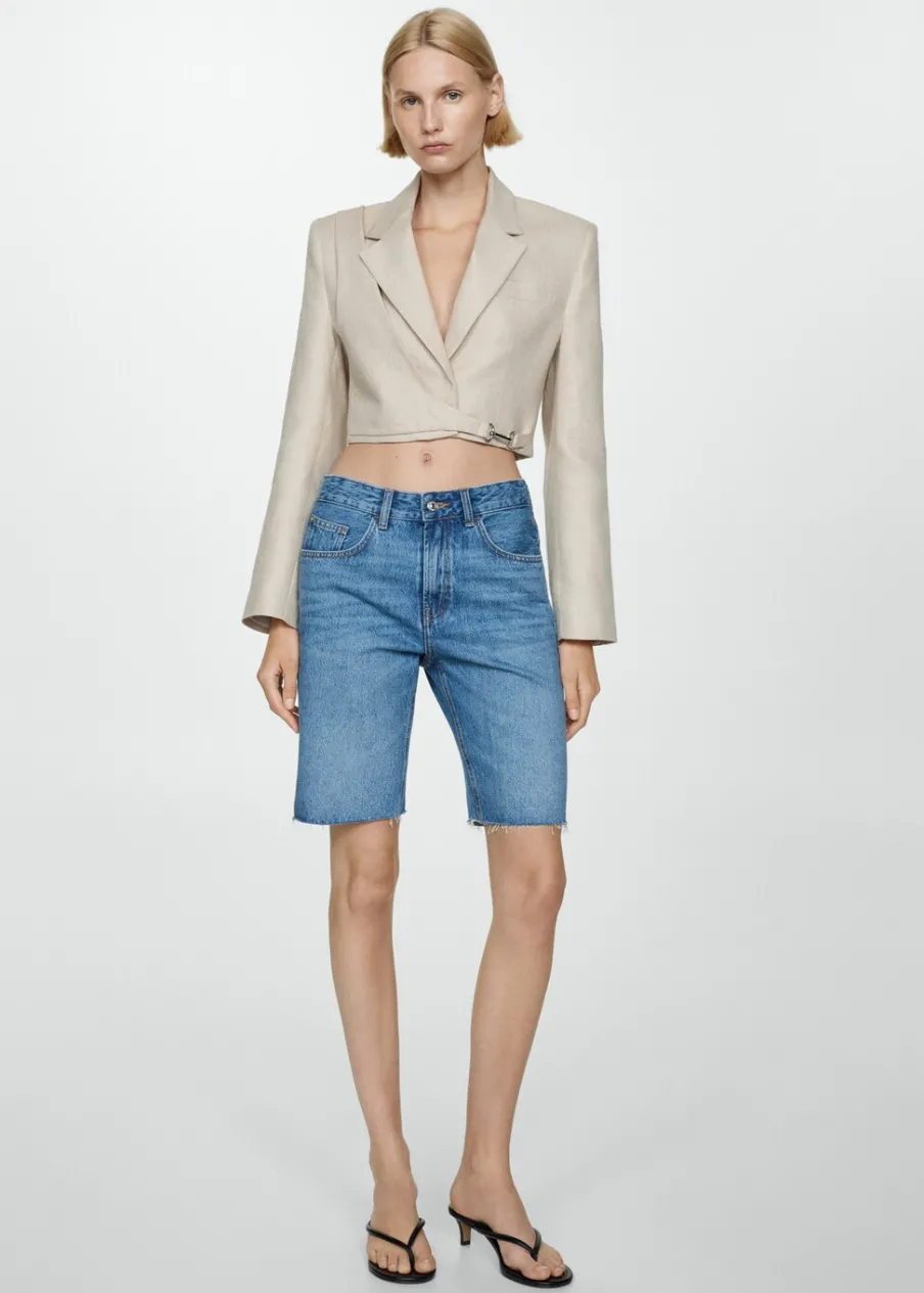 Tkanina bawełniana w dżinsowym stylu. Średni stan. Model prosty. Dwie kieszenie z przodu. Kieszeń na bilon. Dwie kieszenie nakładane z tyłu. Szlufki. Postrzępione nogawki. Zapięcie na zamek i guzik z przodu.