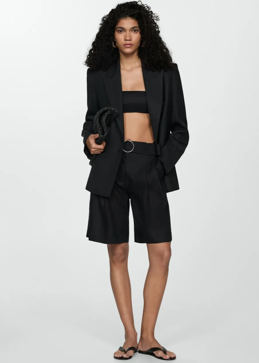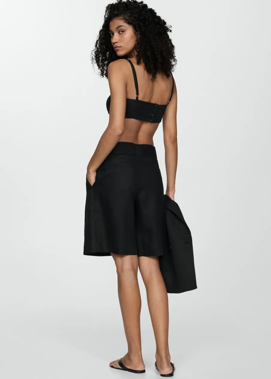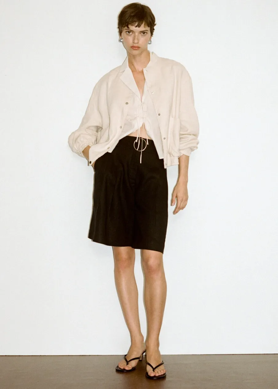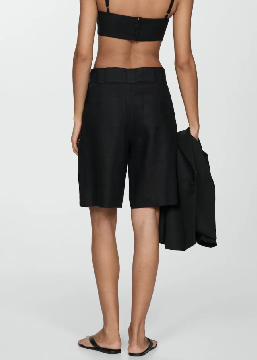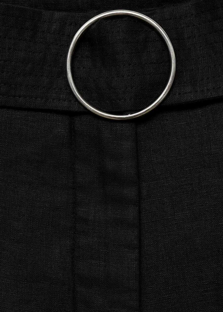 Tkanina z 100% lnu. Podwyższony stan. Model prosty. Krótki krój. Dwie kieszenie boczne. Szlufki. Kryte zapięcie na guzik, haftkę i suwak. Dekoracyjny pasek.