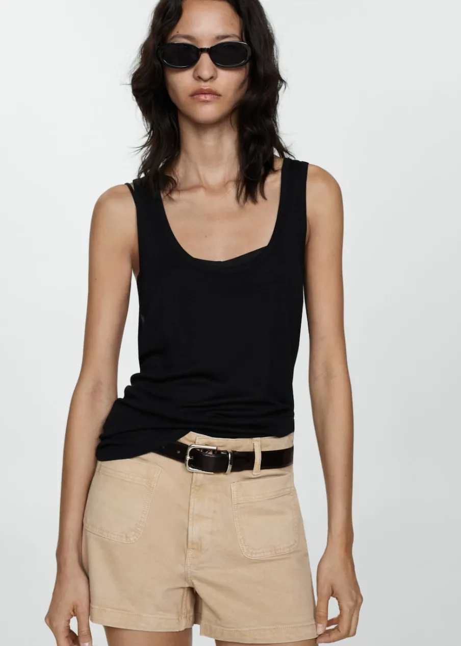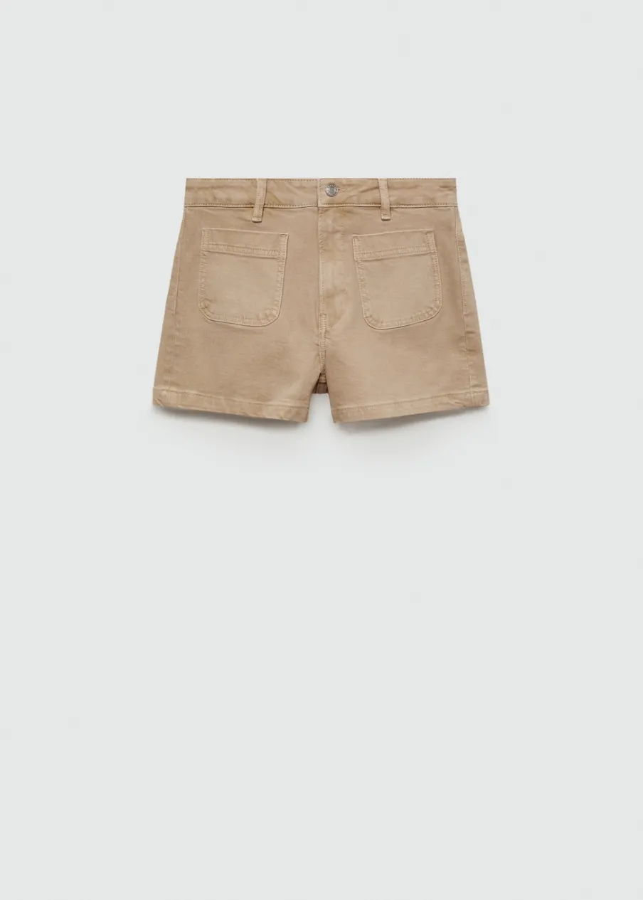 Tkanina bawełniana w dżinsowym stylu. Podwyższony stan. Model prosty. Krótki krój. Dwie kieszenie nakładane z przodu. Dwie kieszenie nakładane z tyłu. Szlufki. Zapięcie na zamek i guzik z przodu.