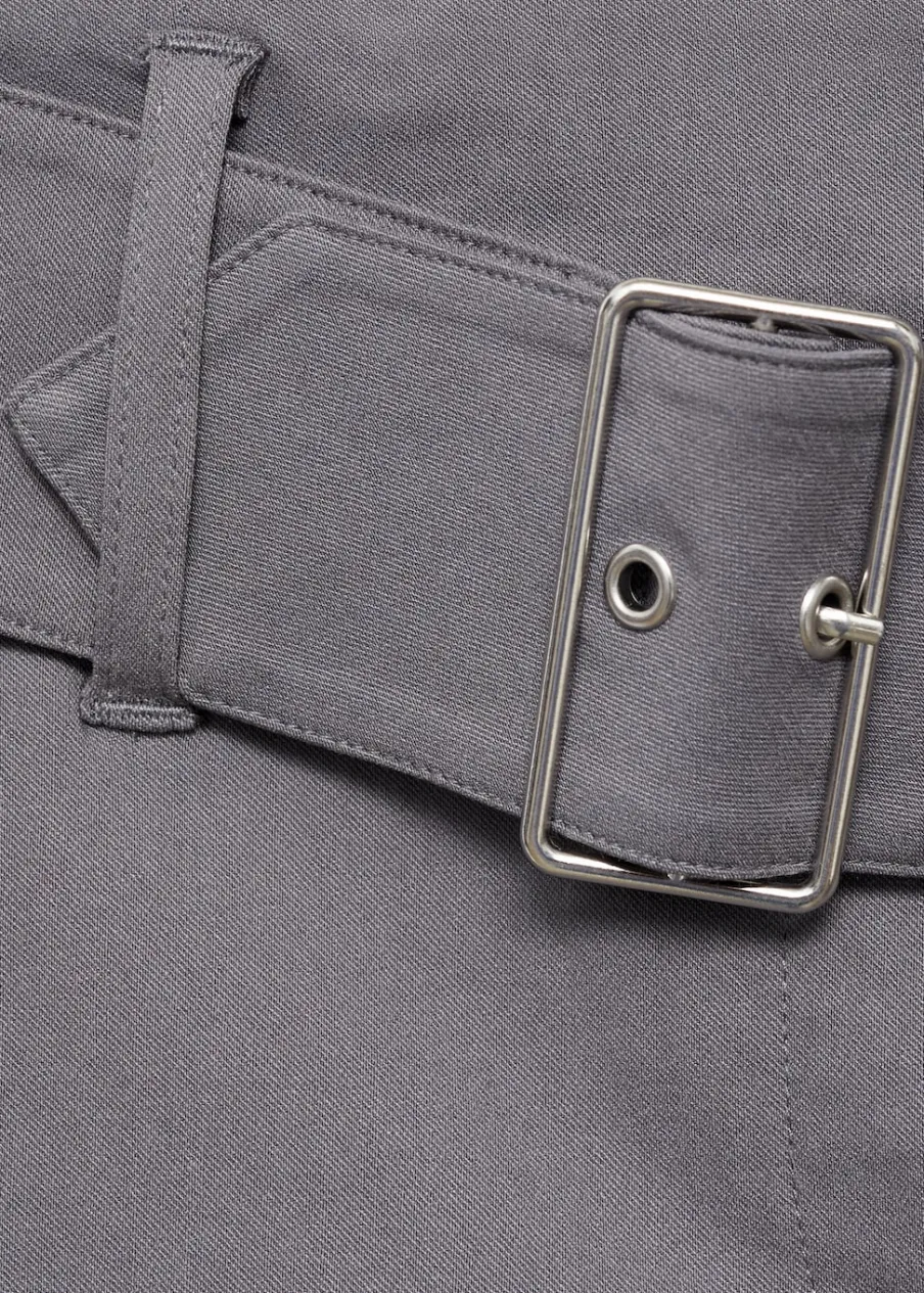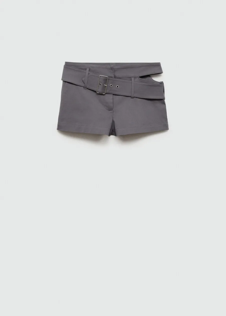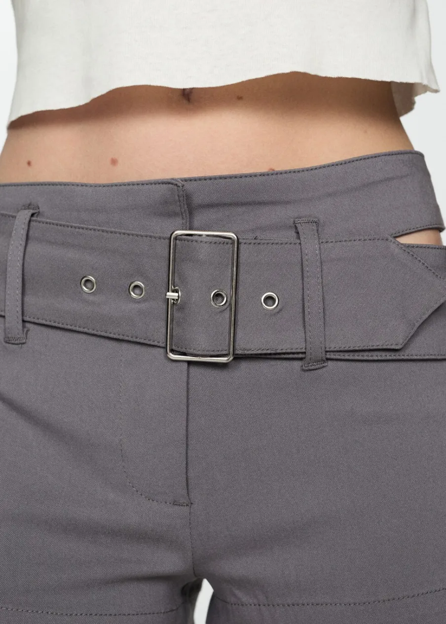Niski stan. Krótki krój. Szlufki. Kryte zapięcie na guzik, haftkę i suwak. Detal z rozcięciem. Dekoracyjny pasek. Model wcięty.