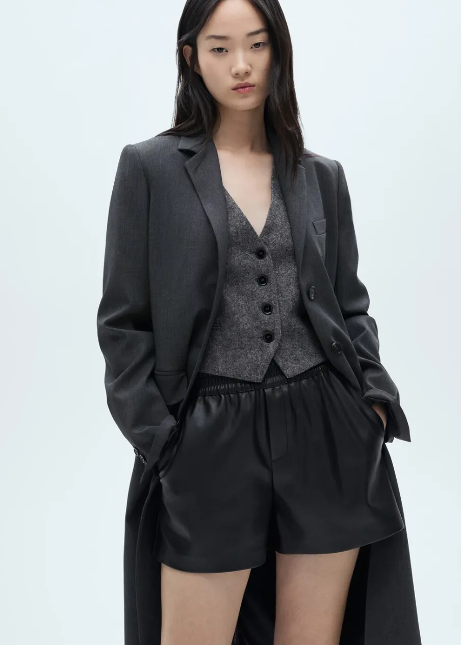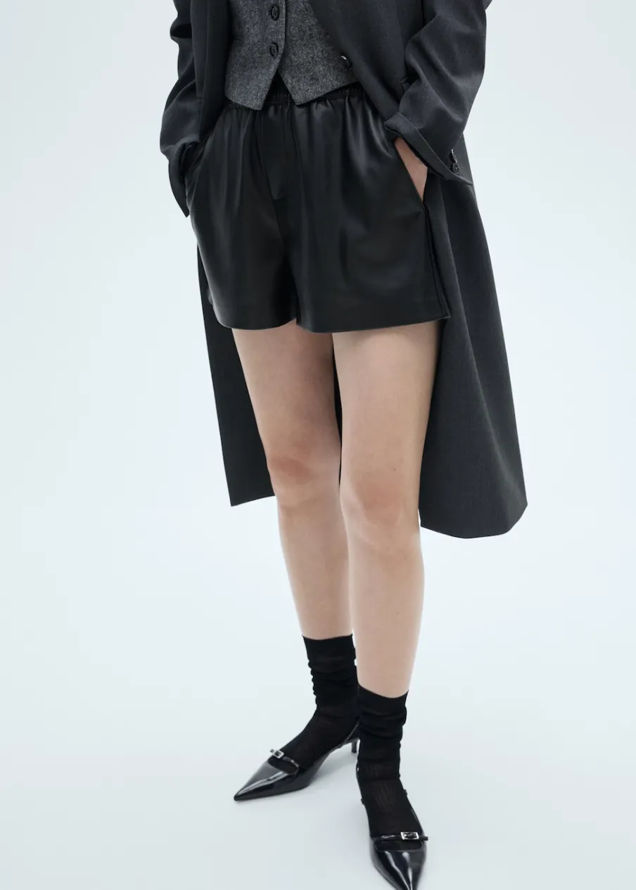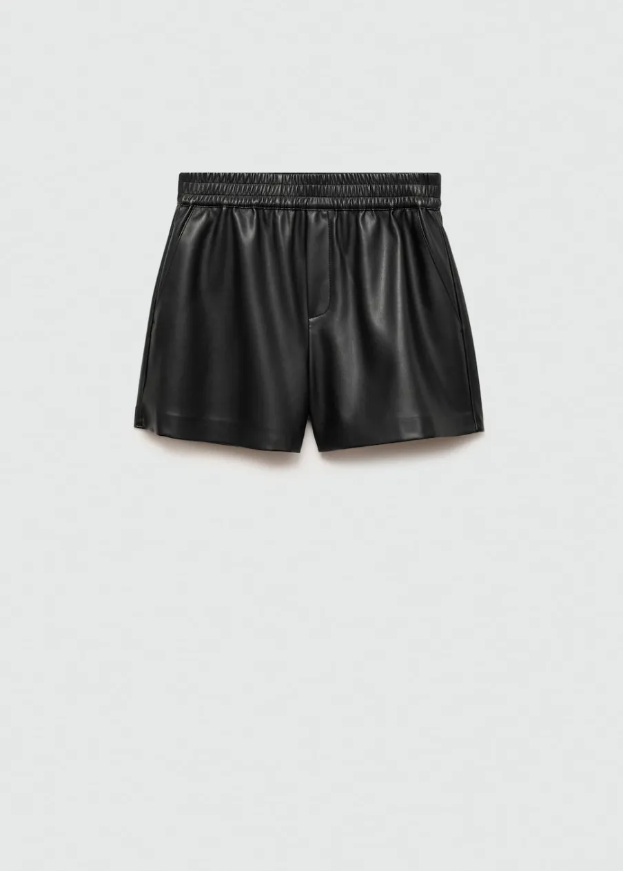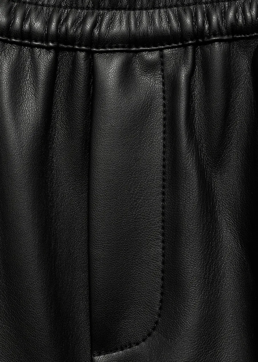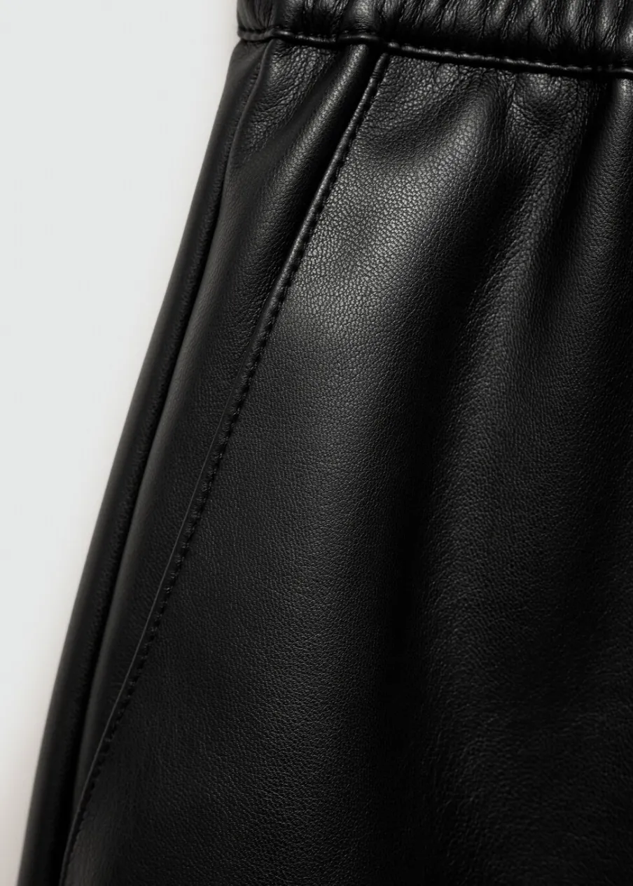 Efekt skóry. Model prosty. Krótki krój. Średni stan. Elastyczny pas. Bez zapięcia. Modelka ma 175 cm wzrostu i nosi rozmiar S/36. Kolekcja wizytowa. Kieszenie boczne. Dwie wpuszczane kieszenie z tyłu.