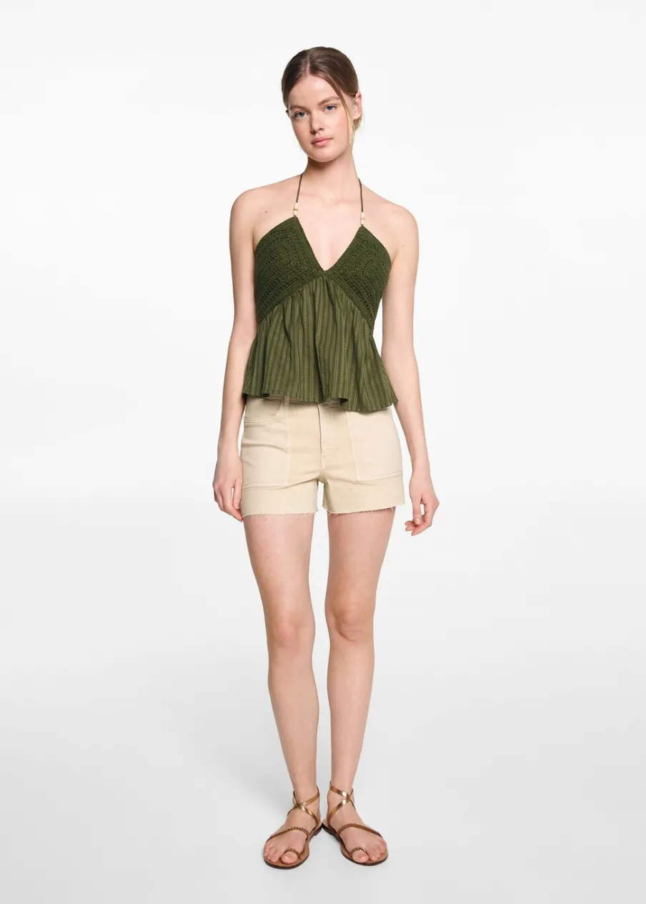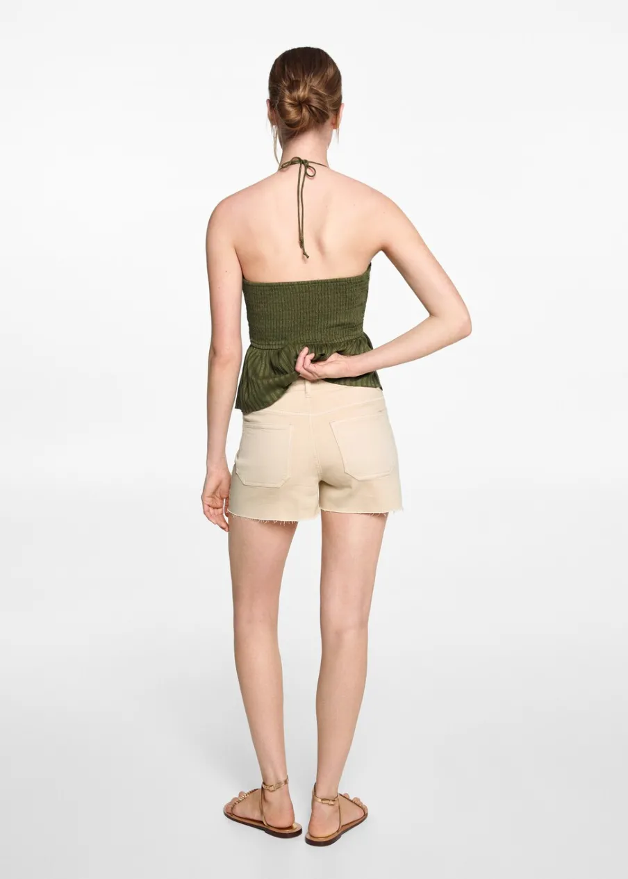 OpisTkanina bawełniana. Model prosty. Krótki krój. Średni stan. Dwie kieszenie z przodu. Zapięcie na suwak i guzik.