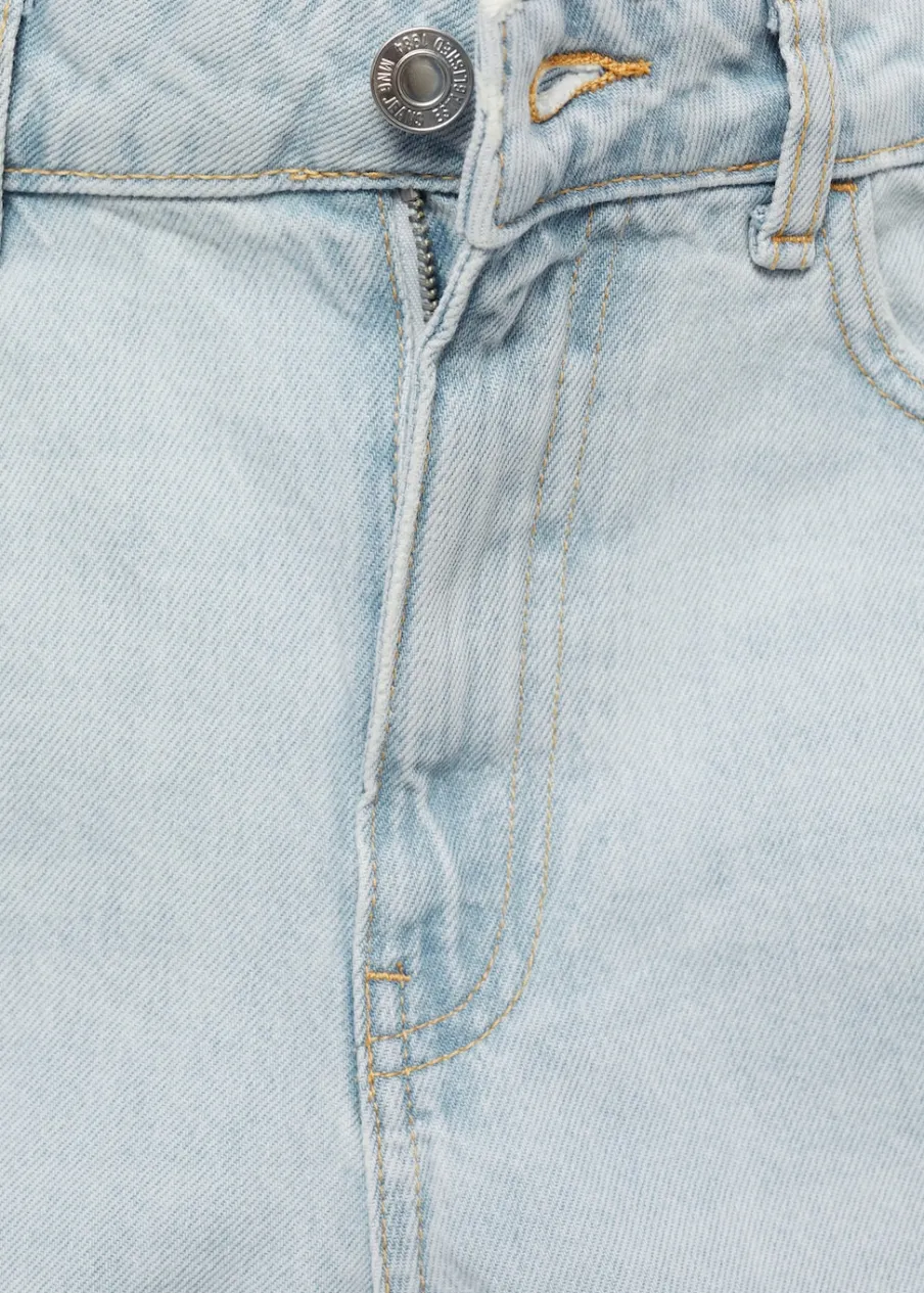 Tkanina bawełniana w dżinsowym stylu. Krótki krój. Mom-fit. Podwyższony stan. Szlufki. Pięć kieszeni. Zapięcie na suwak i guzik. Wywinięte nogawki.