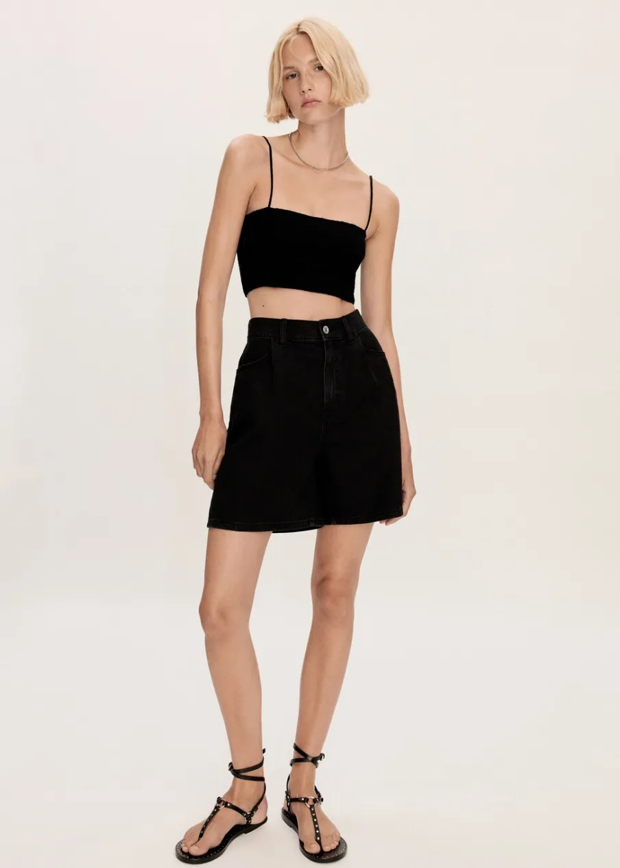 Tkanina bawełniana w dżinsowym stylu. Podwyższony stan. Krótki krój. Model prosty. Dwie kieszenie z przodu. Dwie kieszenie nakładane z tyłu. Szlufki. Zapięcie na zamek i guzik z przodu.