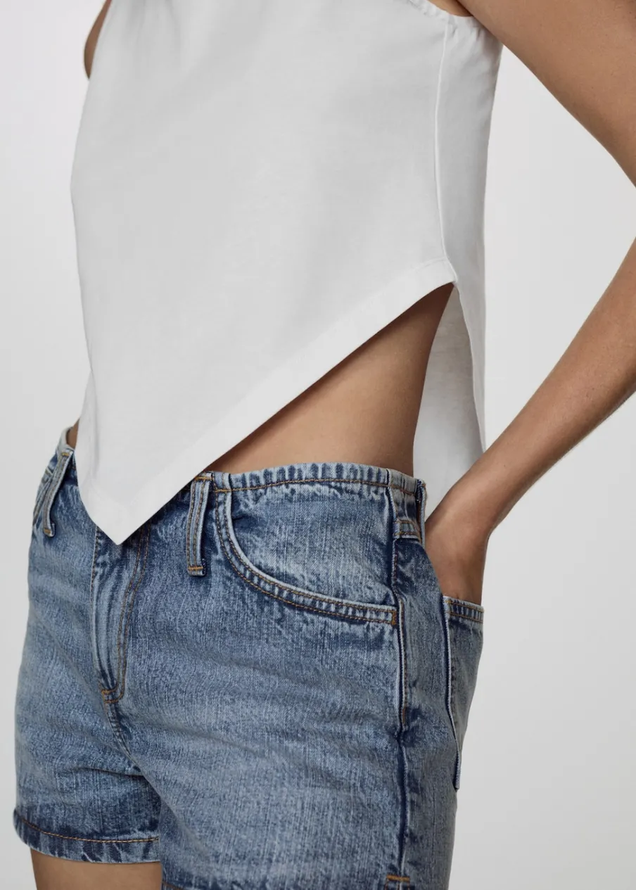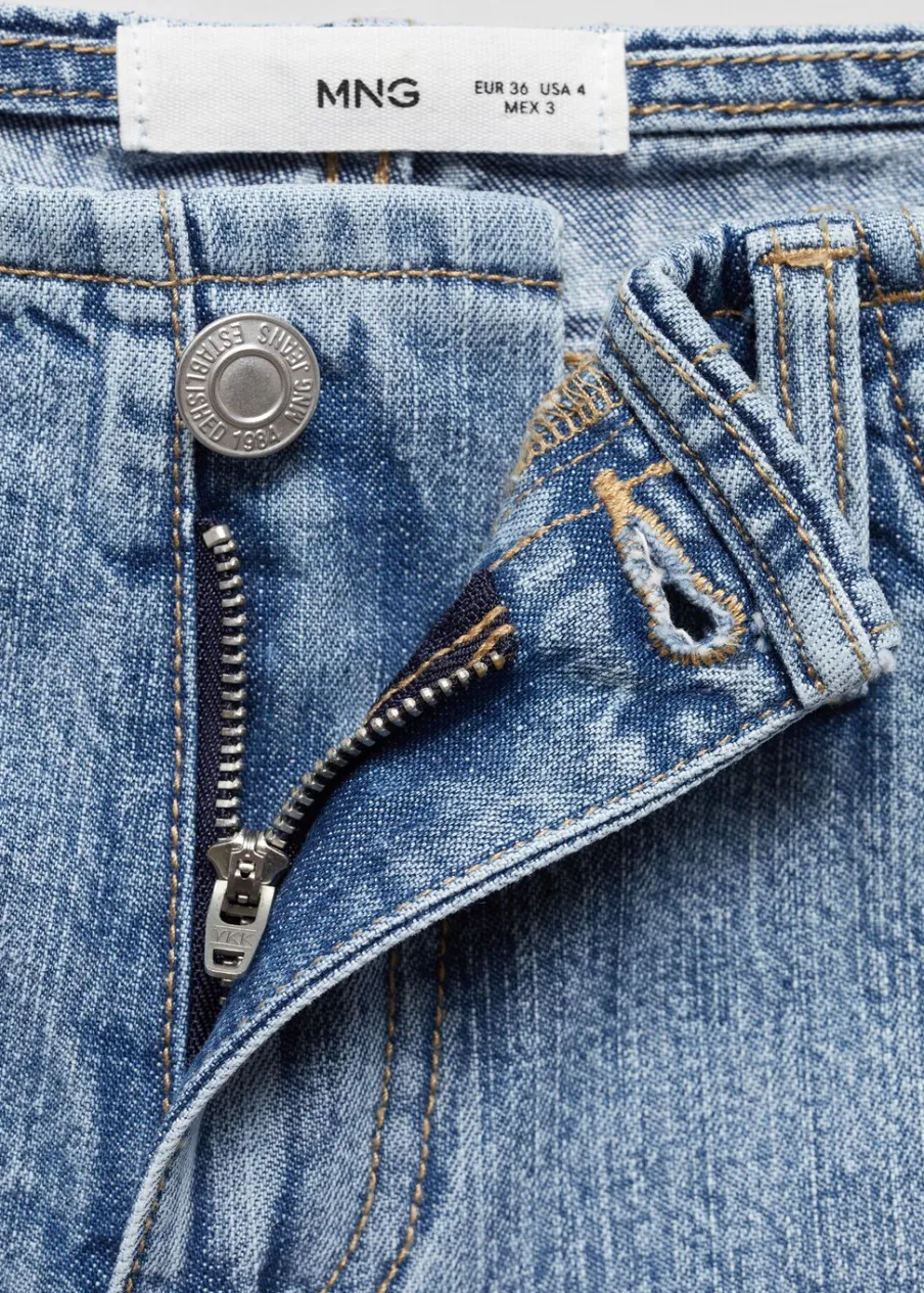Niski stan. Model prosty. Krótki krój. Pięć kieszeni. Zapięcie na zamek i guzik z przodu. Tkanina z 100% bawełny.