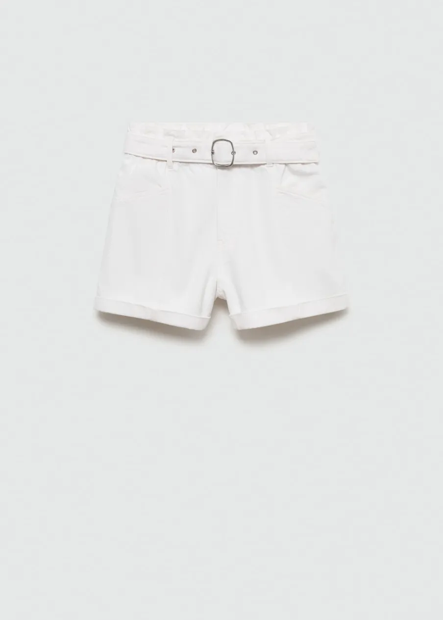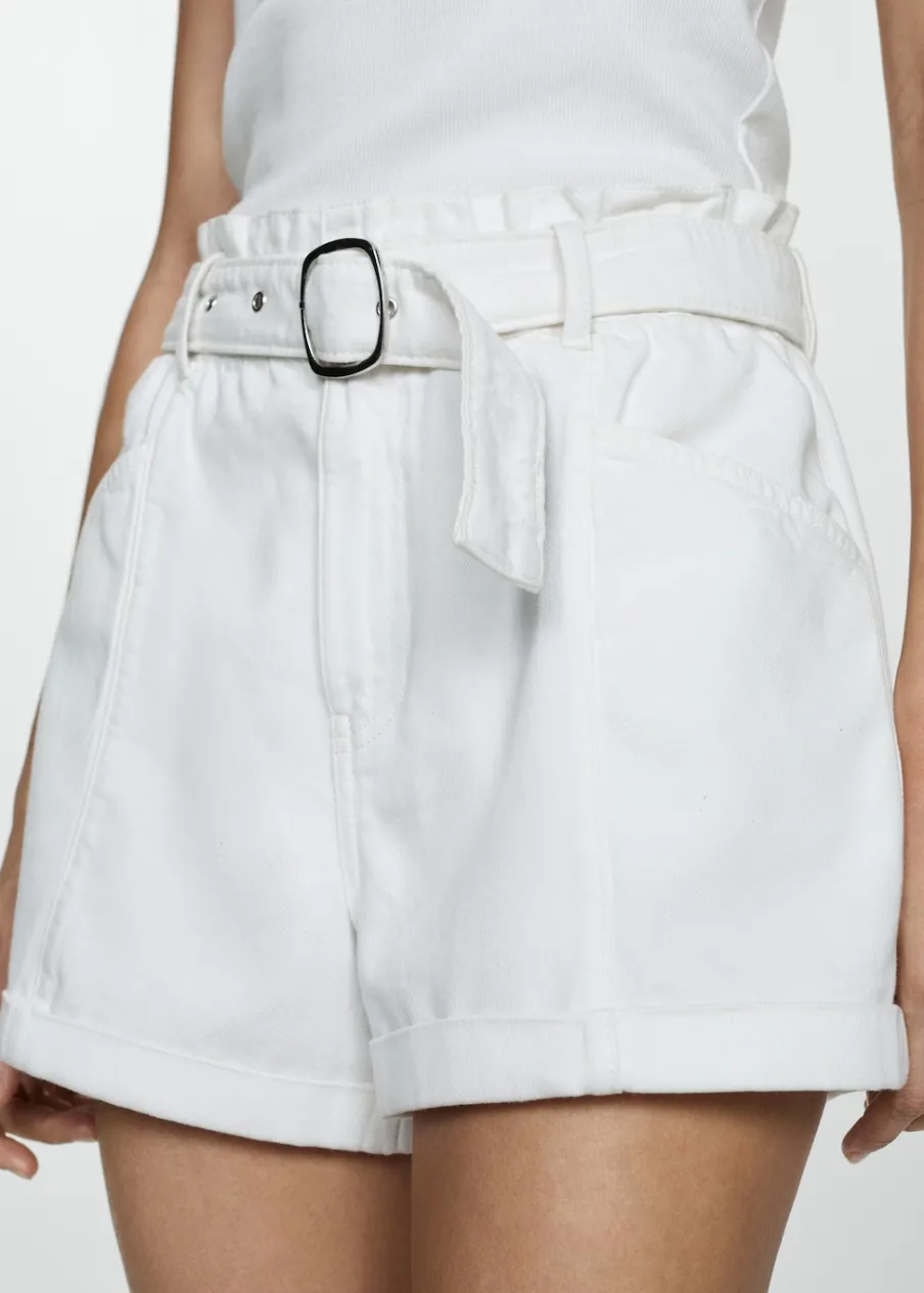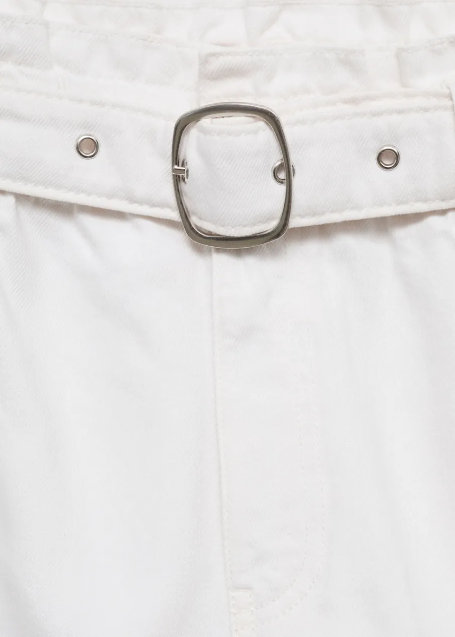 Tkanina bawełniana w dżinsowym stylu. Krótki krój. Model prosty. Podwyższony stan. Paperbag. Dwie kieszenie z przodu. Dwie kieszenie nakładane z tyłu. Szlufki. Pasek zapinany na klamrę. Zapięcie na zamek i guzik z przodu.