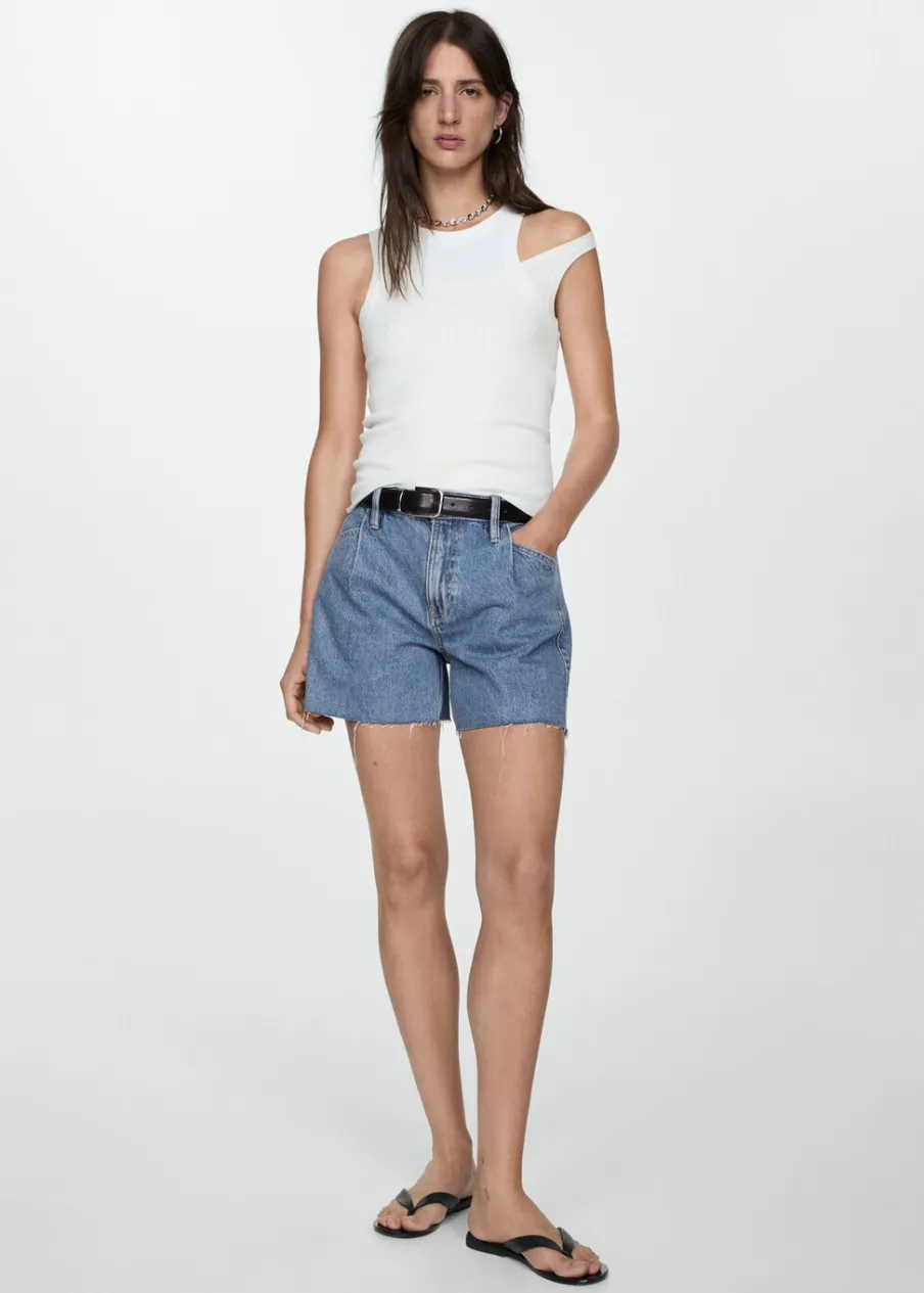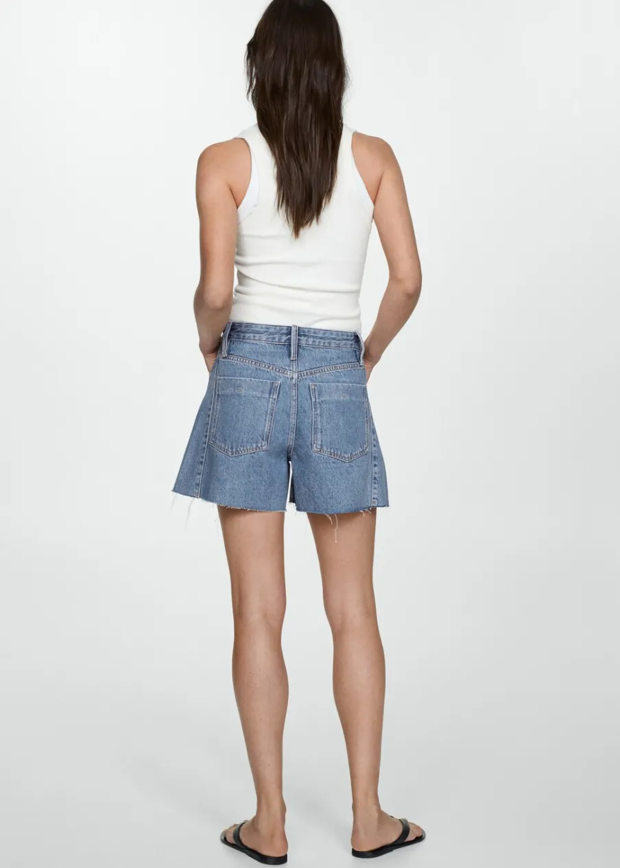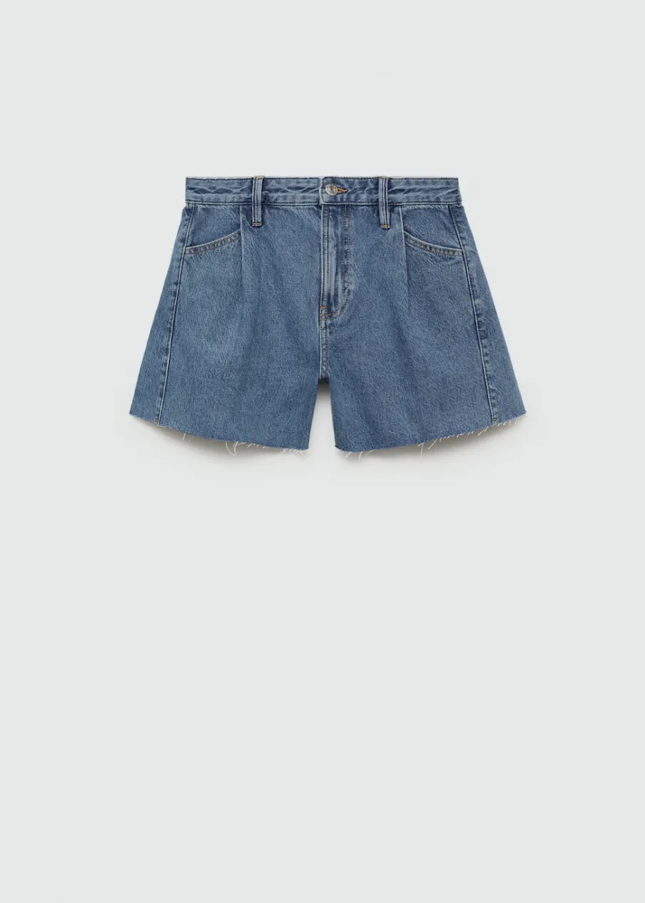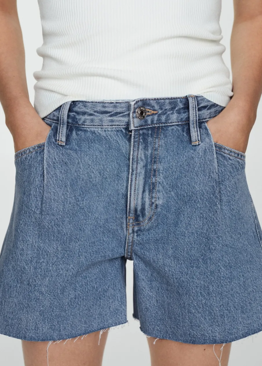 Tkanina bawełniana w dżinsowym stylu. Model prosty. Krótki krój. Dwie kieszenie z przodu. Dwie kieszenie nakładane z tyłu. Szlufki. Detal z zakładkami. Postrzępione nogawki. Zapięcie na zamek i guzik z przodu.