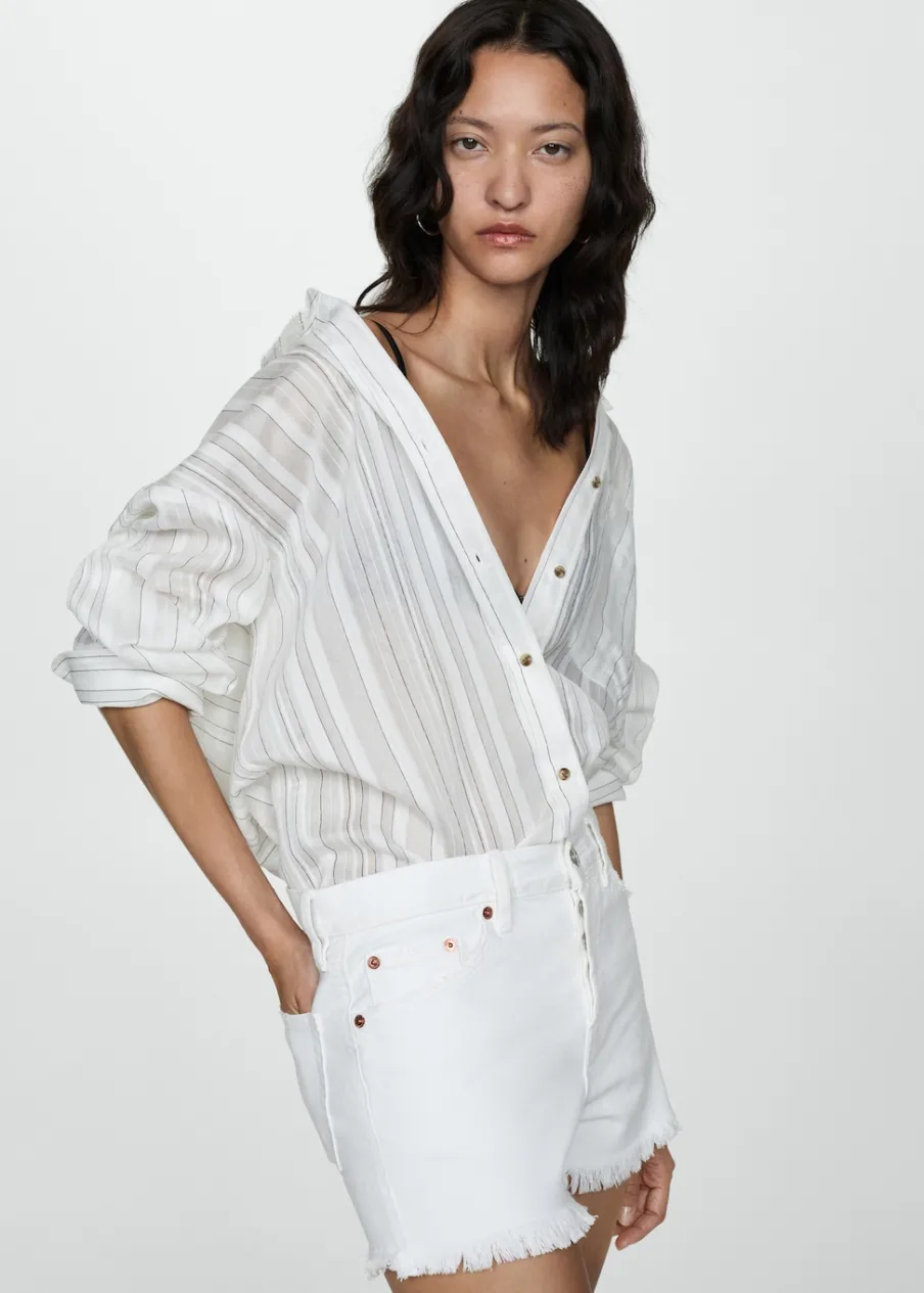 Tkanina bawełniana w dżinsowym stylu. Krótki krój. Model prosty. Dwie kieszenie z przodu. Kieszeń na bilon. Dwie kieszenie nakładane z tyłu. Szlufki. Postrzępione nogawki. Zapięcie na guziki z przodu.