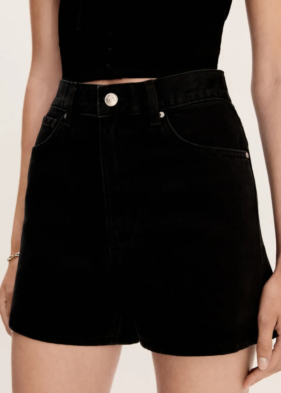 Tkanina bawełniana w dżinsowym stylu. Krótki krój. Model prosty. Podwyższony stan. Dwie kieszenie z przodu. Kieszeń na bilon. Dwie kieszenie nakładane z tyłu. Szlufki. Zapięcie na zamek i guzik z przodu.