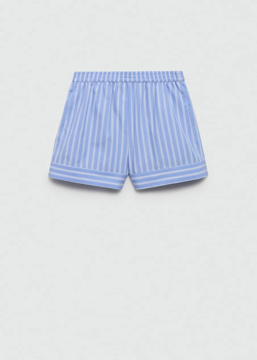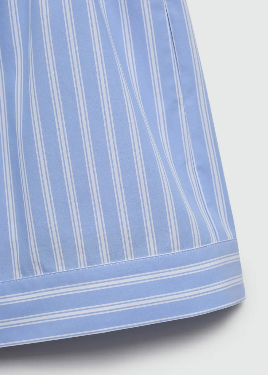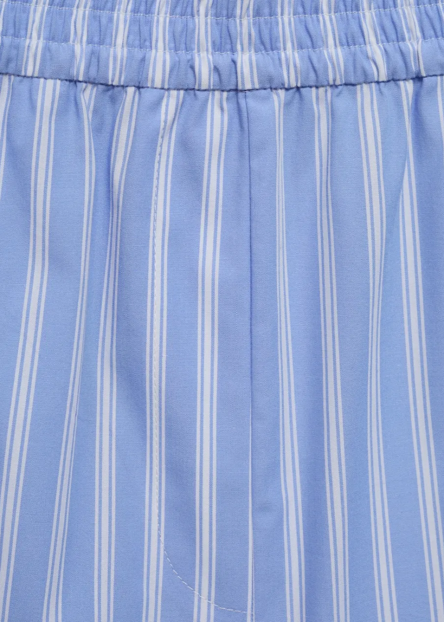 Model prosty. Krótki krój. Wzór w pasy. Dwie kieszenie boczne. Elastyczny pas. Bez zapięcia. Total look. Tkanina z 100% bawełny.