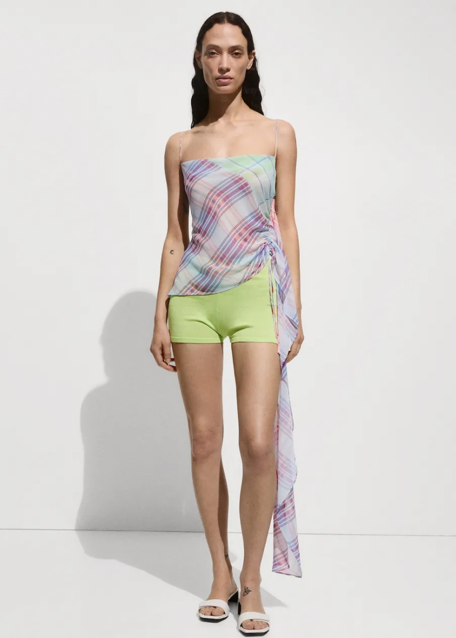 Dzianinowa tkanina. Dzianina średniej grubości. Rozmiar mini. Krój skinny. Krótki krój. Elastyczny pas.