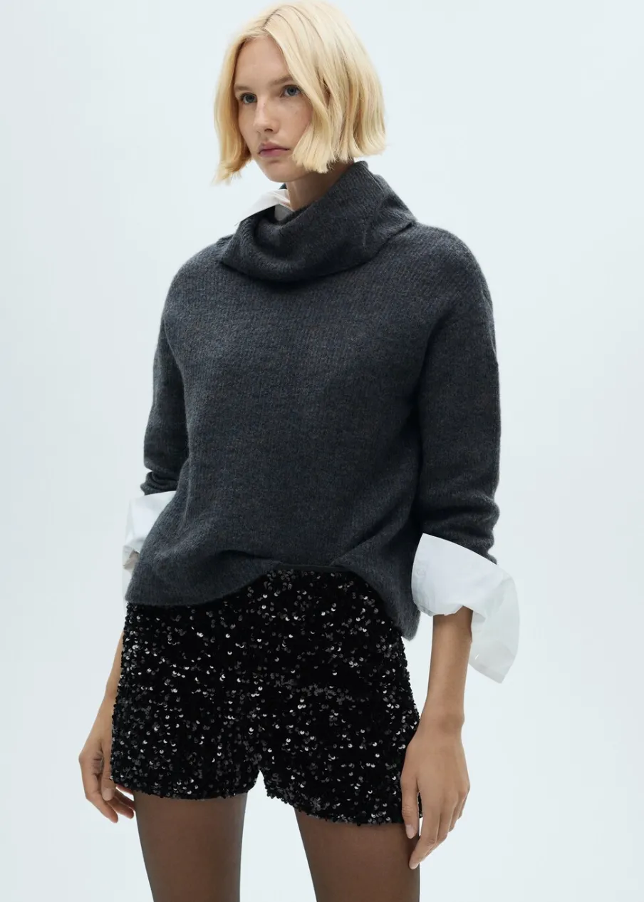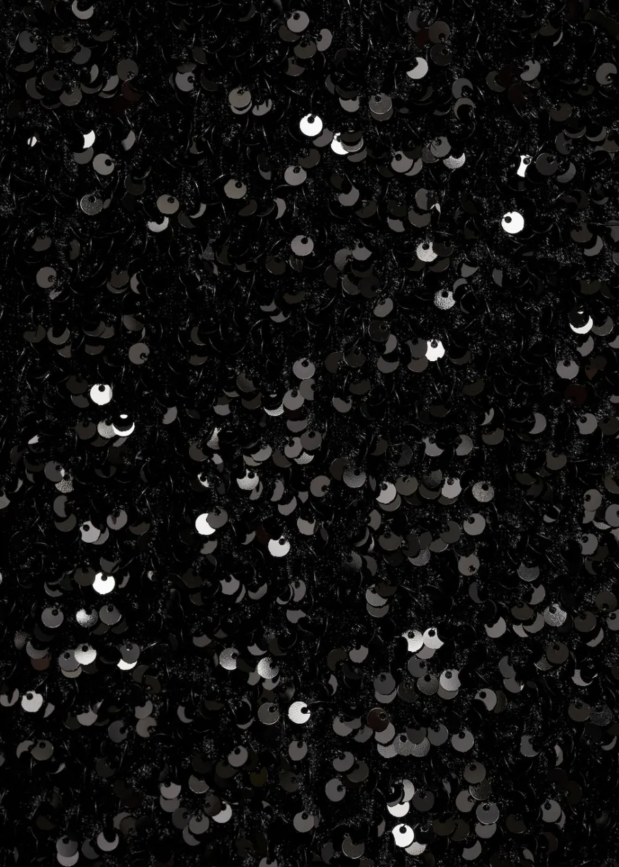 Cekinowa tkanina. Model prosty. Krótki krój. Elastyczny pas. Bez zapięcia. Total look. Kolekcja wizytowa.
