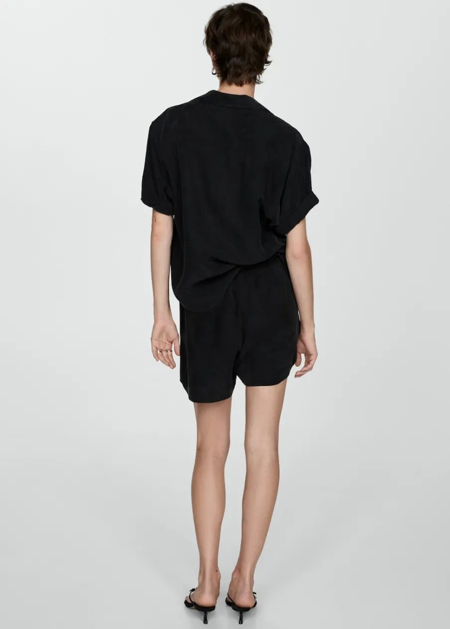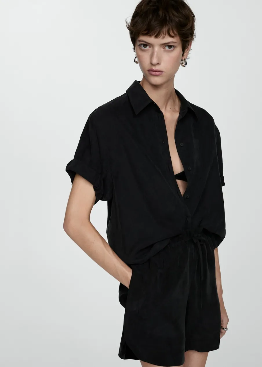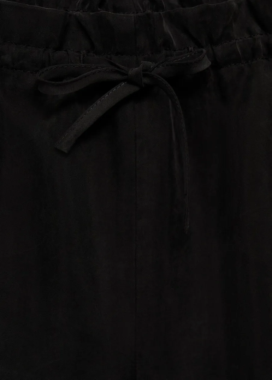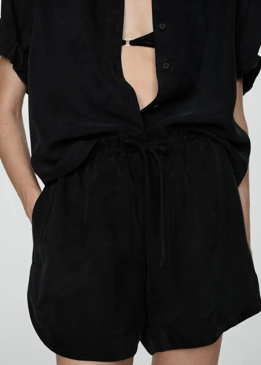 Tkanina z mieszanki włókna cupro. Krótki krój. Model prosty. Dwie kieszenie boczne. Elastyczny pas z wiązanym zapięciem. Total look.