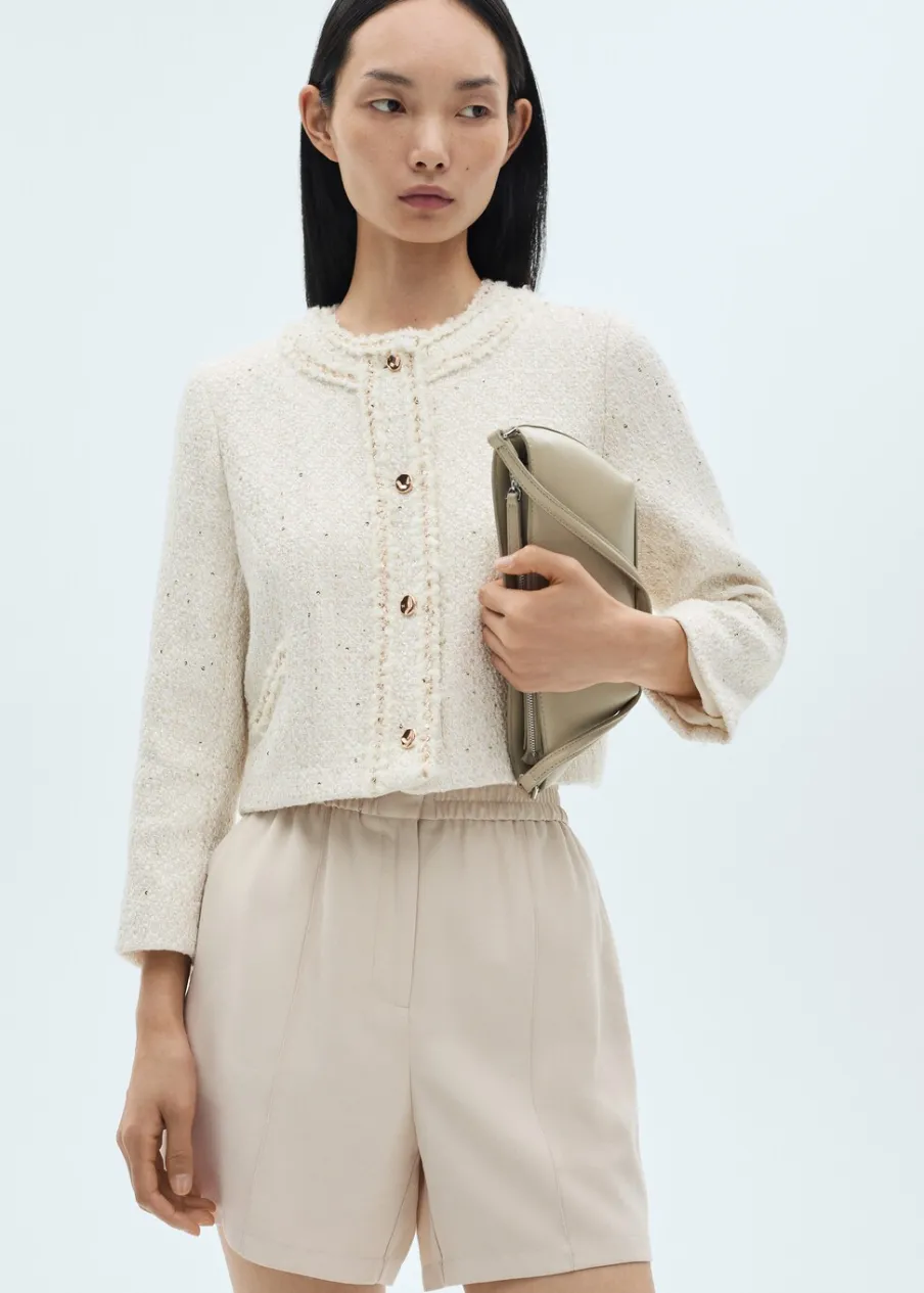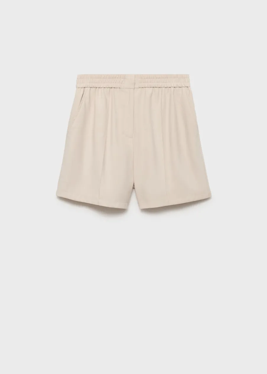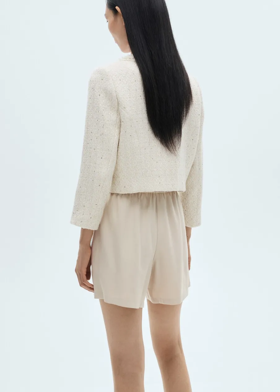 Lejąca tkanina. Model prosty. Krótki krój. Kryte zapięcie na guzik, haftkę i suwak. Elastyczny pas.