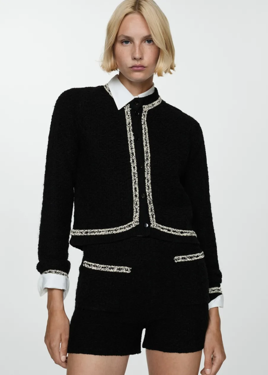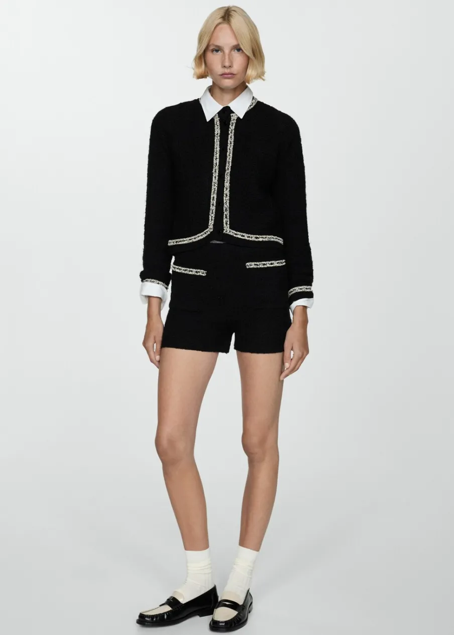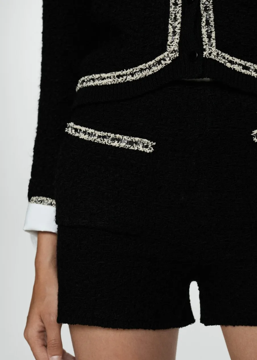 OpisTkanina tweedowa. Dzianina o średniej grubości. Krótki krój. Dwukolorowy deseń. Elastyczna gumka. Ozdobne kiesz…