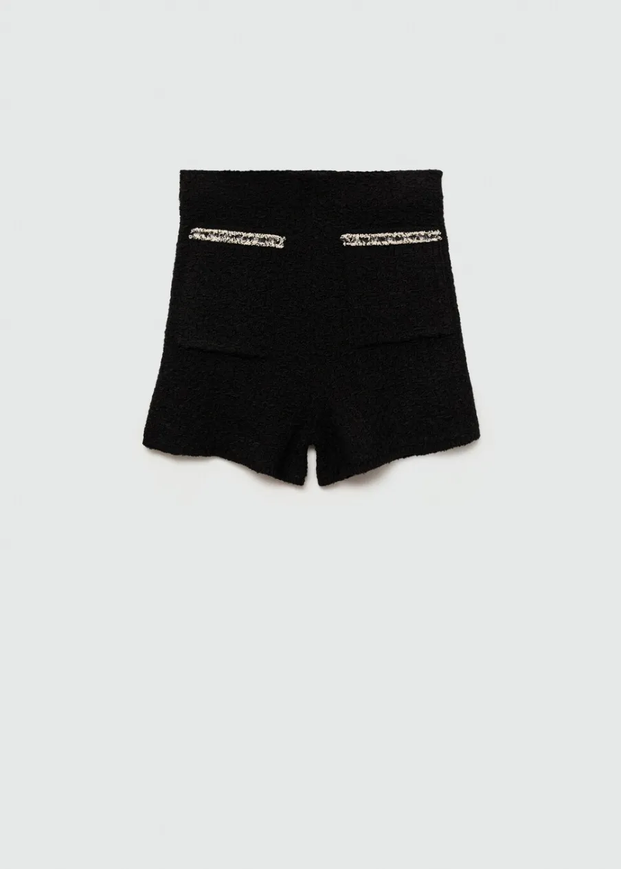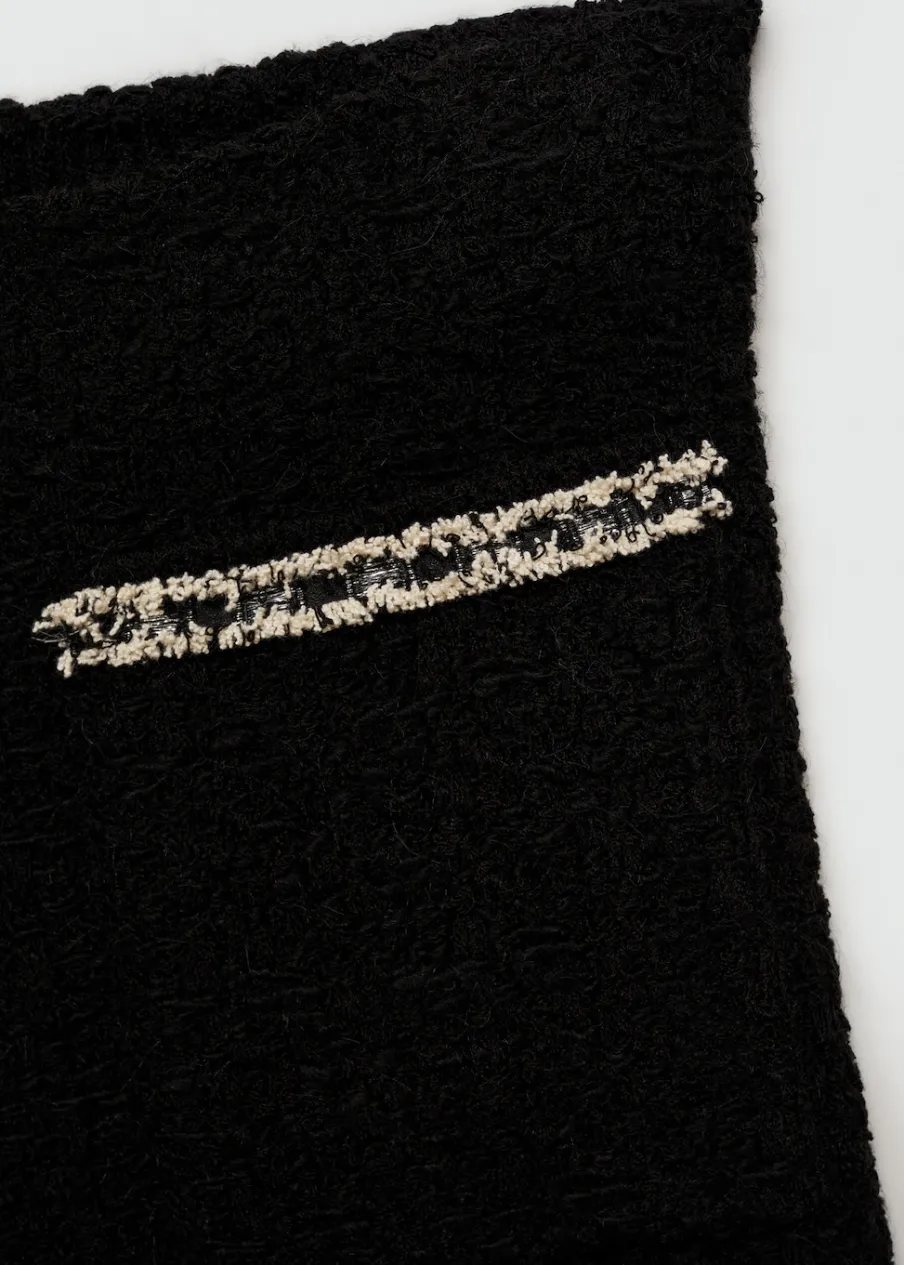 Tkanina tweedowa. Dzianina o średniej grubości. Krótki krój. Dwukolorowy deseń. Elastyczna gumka. Ozdobne kieszenie. Bez zapięcia. Model wcięty.