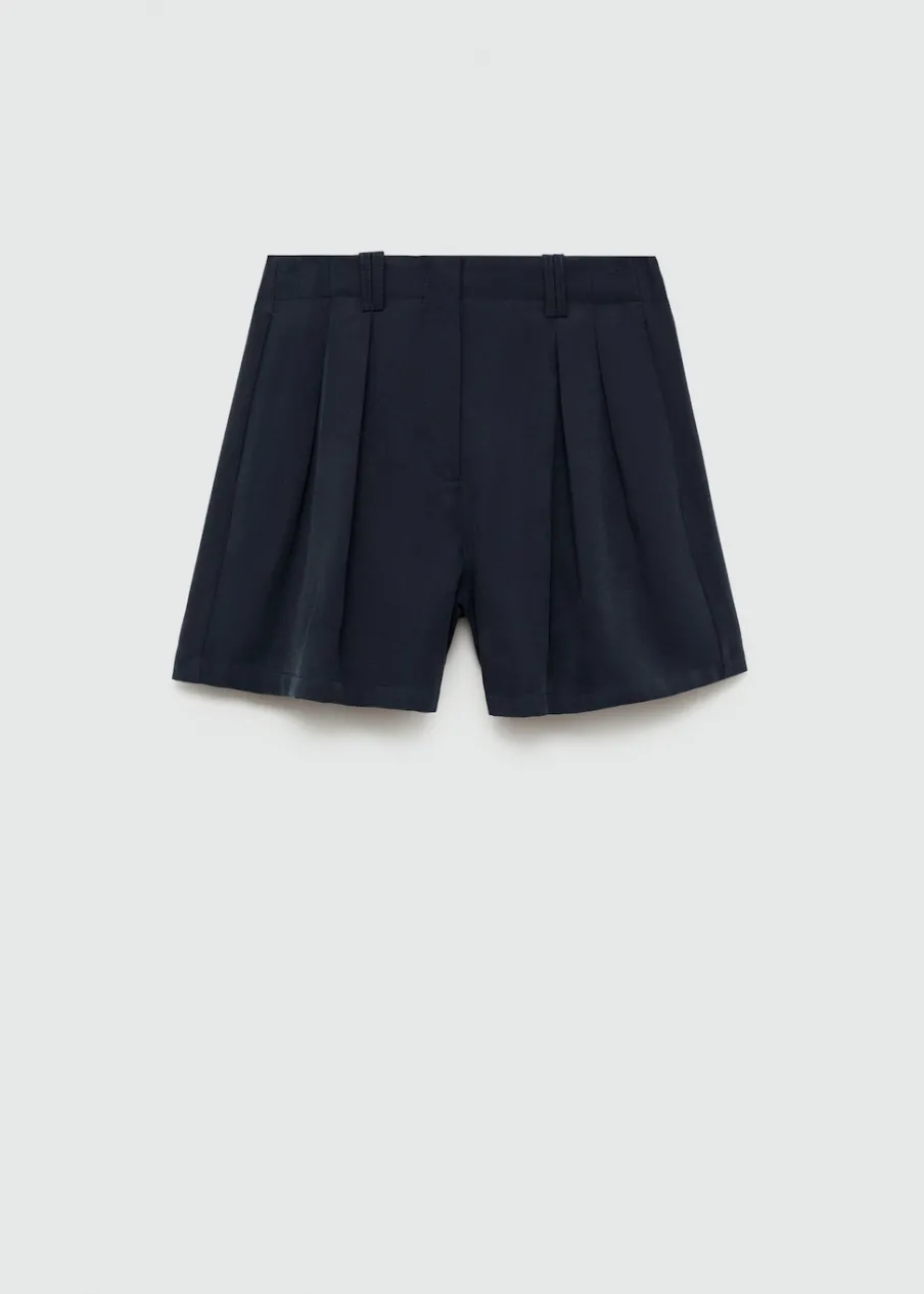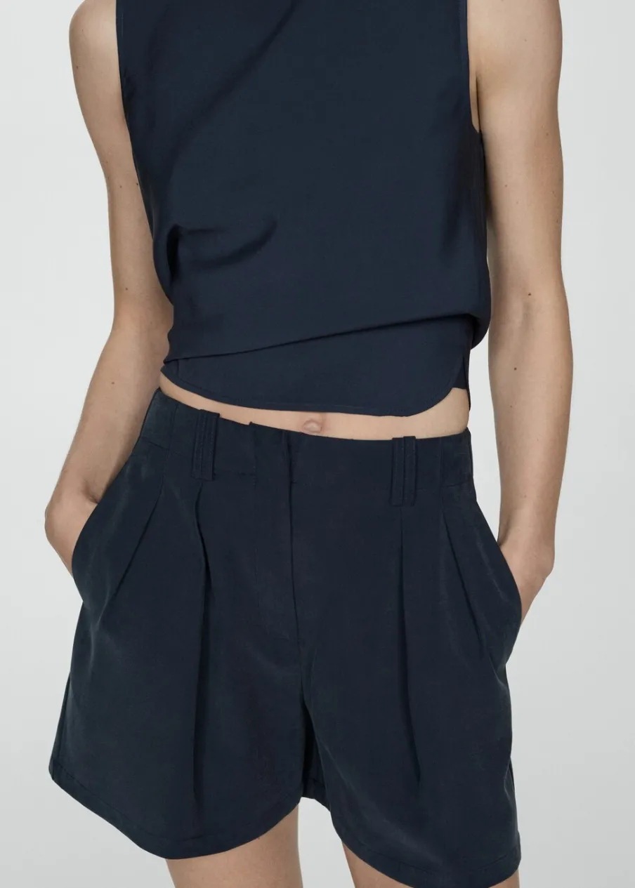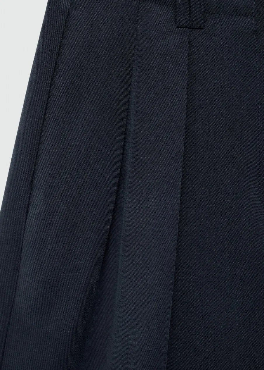 Lejąca tkanina. Model prosty. Krótki krój. Średni stan. Szlufki. Dwie kieszenie boczne. Kryte zapięcie na guzik, haftkę i suwak. Detal z zakładkami. Total look. Kieszeń z wypustkami z tyłu.