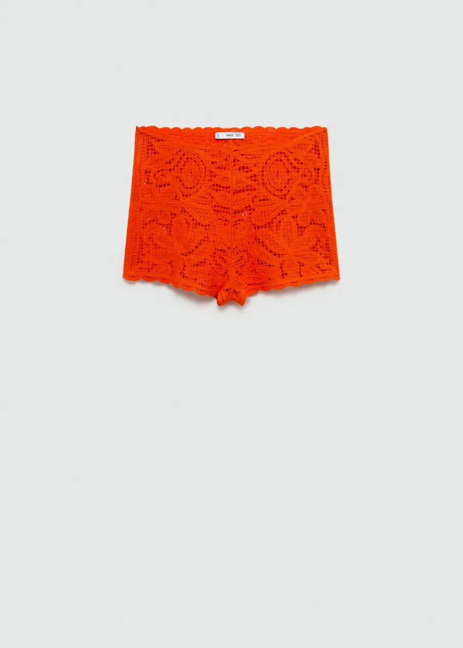 Tkanina z grubej dzianiny. Krótki krój. Model prosty. Deseń w kwiaty. Średni stan. Boczne zapięcie na suwak. Total look. Szydełkowa tkanina.