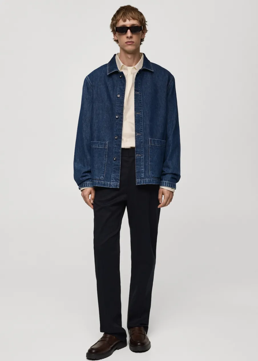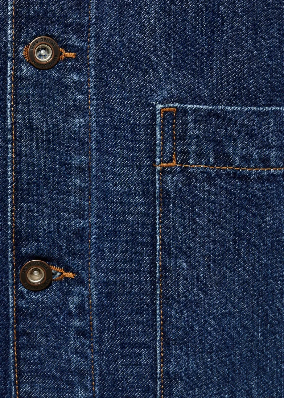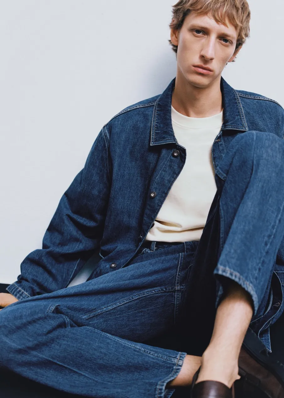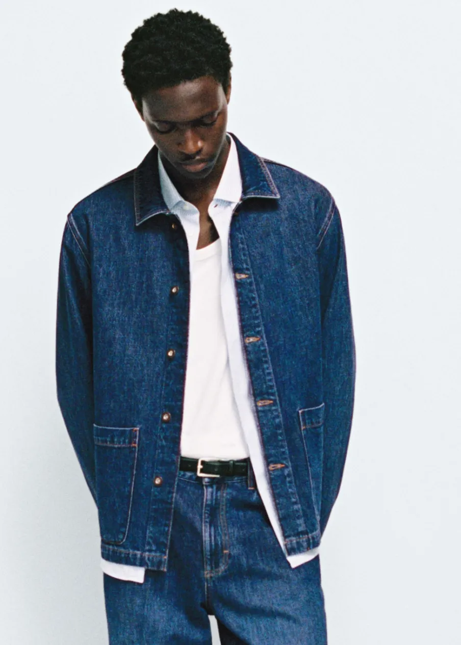 Relaxed fit. Tkanina dżinsowa. Stębnowane detale. Zapięcie na metalowe guziki z przodu. Dwie kieszenie nakładane z przodu. Długi rękaw z guzikami na mankietach. Prosty dół. Model ma 187 cm wzrostu i nosi rozmiar M. Rozcięcie z tyłu. Klasyczny kołnierzyk. Tkanina z 100% bawełny.