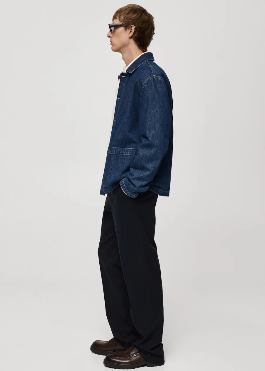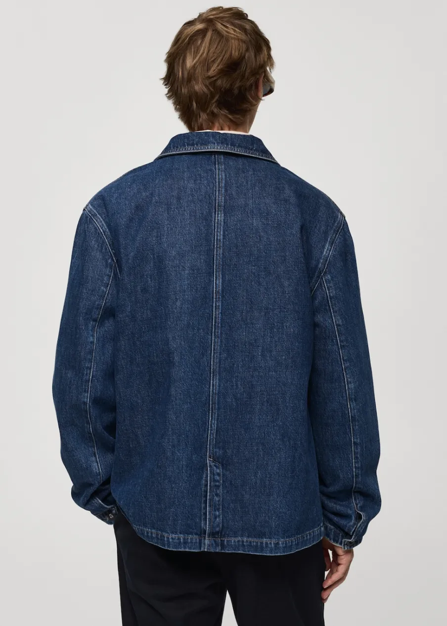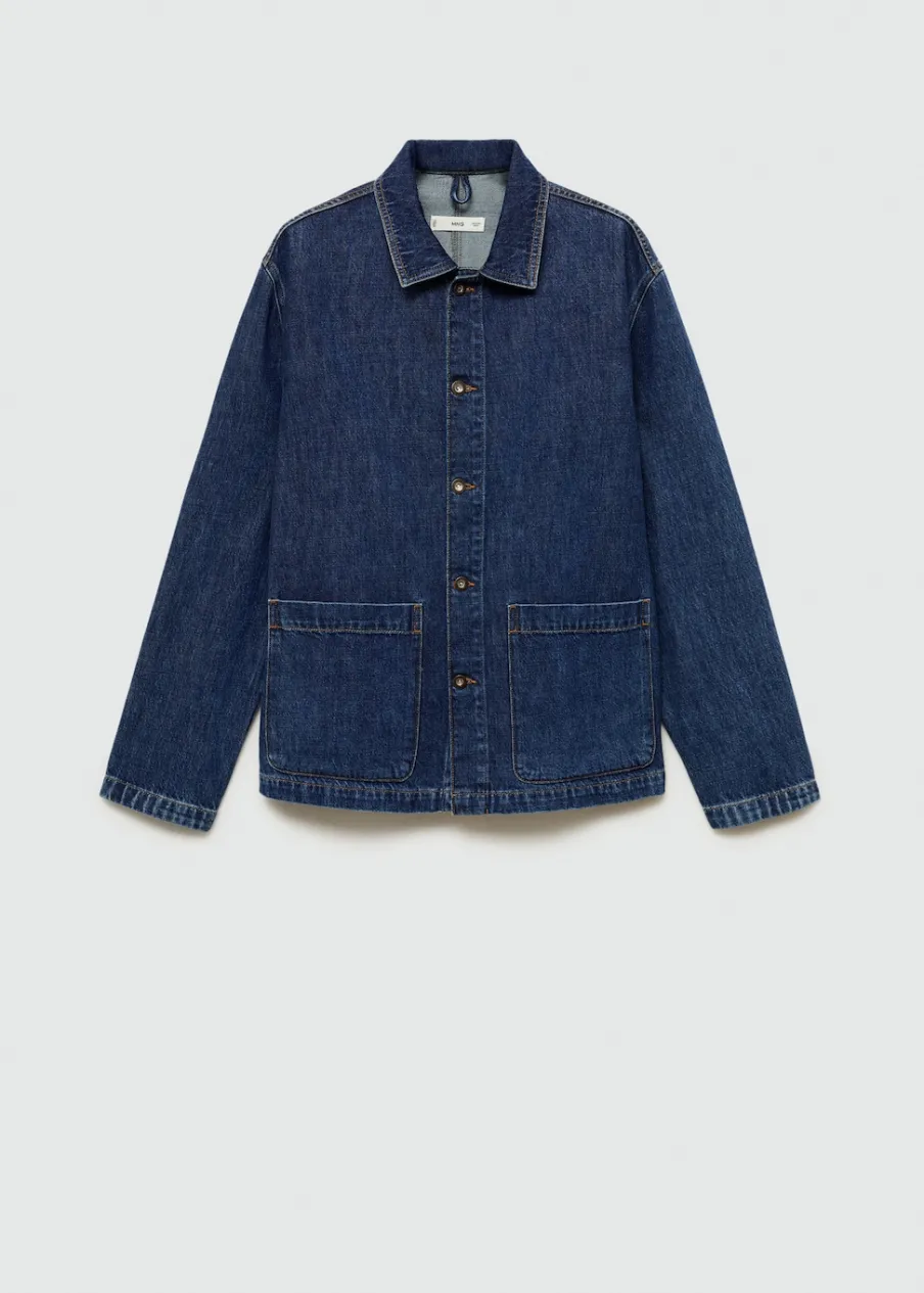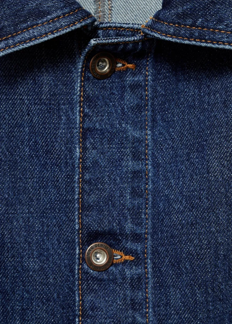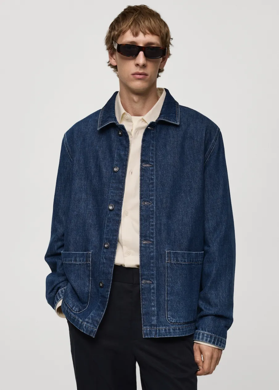 Relaxed fit. Tkanina dżinsowa. Stębnowane detale. Zapięcie na metalowe guziki z przodu. Dwie kieszenie nakładane z przodu. Długi rękaw z guzikami na mankietach. Prosty dół. Model ma 187 cm wzrostu i nosi rozmiar M. Rozcięcie z tyłu. Klasyczny kołnierzyk. Tkanina z 100% bawełny.
