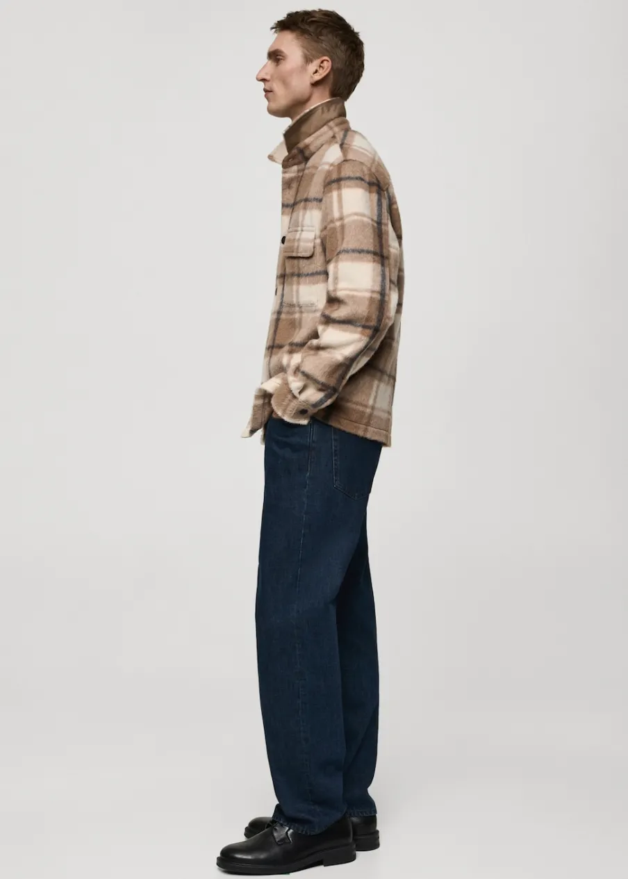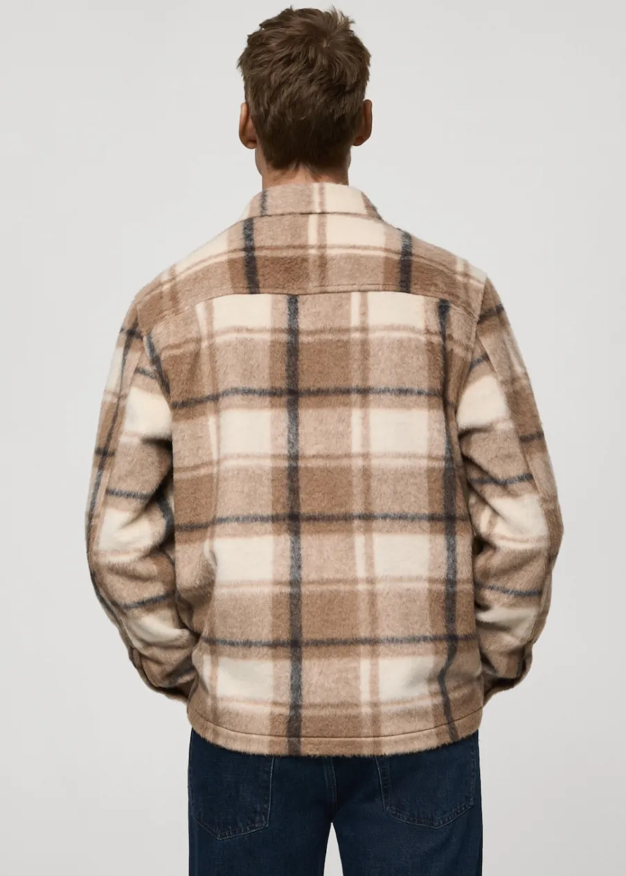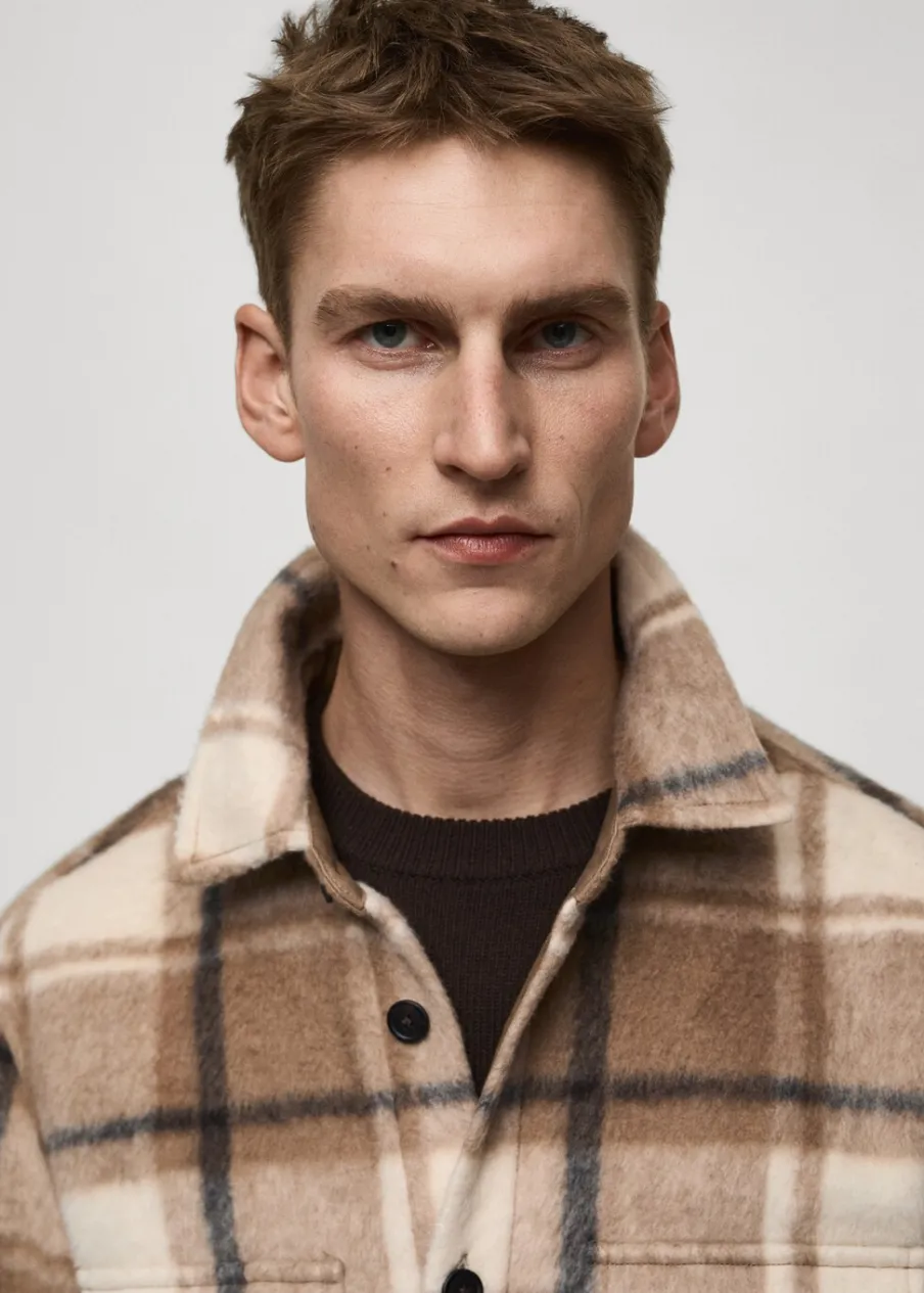 Krój regular. Tkanina flanelowa. Z teksturą. Deseń w kratę. Zapięcie na guziki. Koszulowy kołnierz. Zapinane mankiety. Dwie kieszenie z patkami z przodu. Model ma 185 cm wzrostu i nosi rozmiar M.