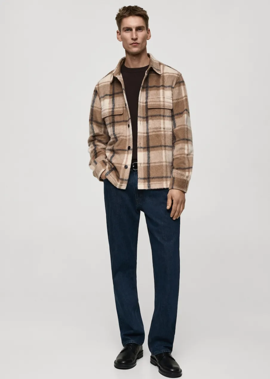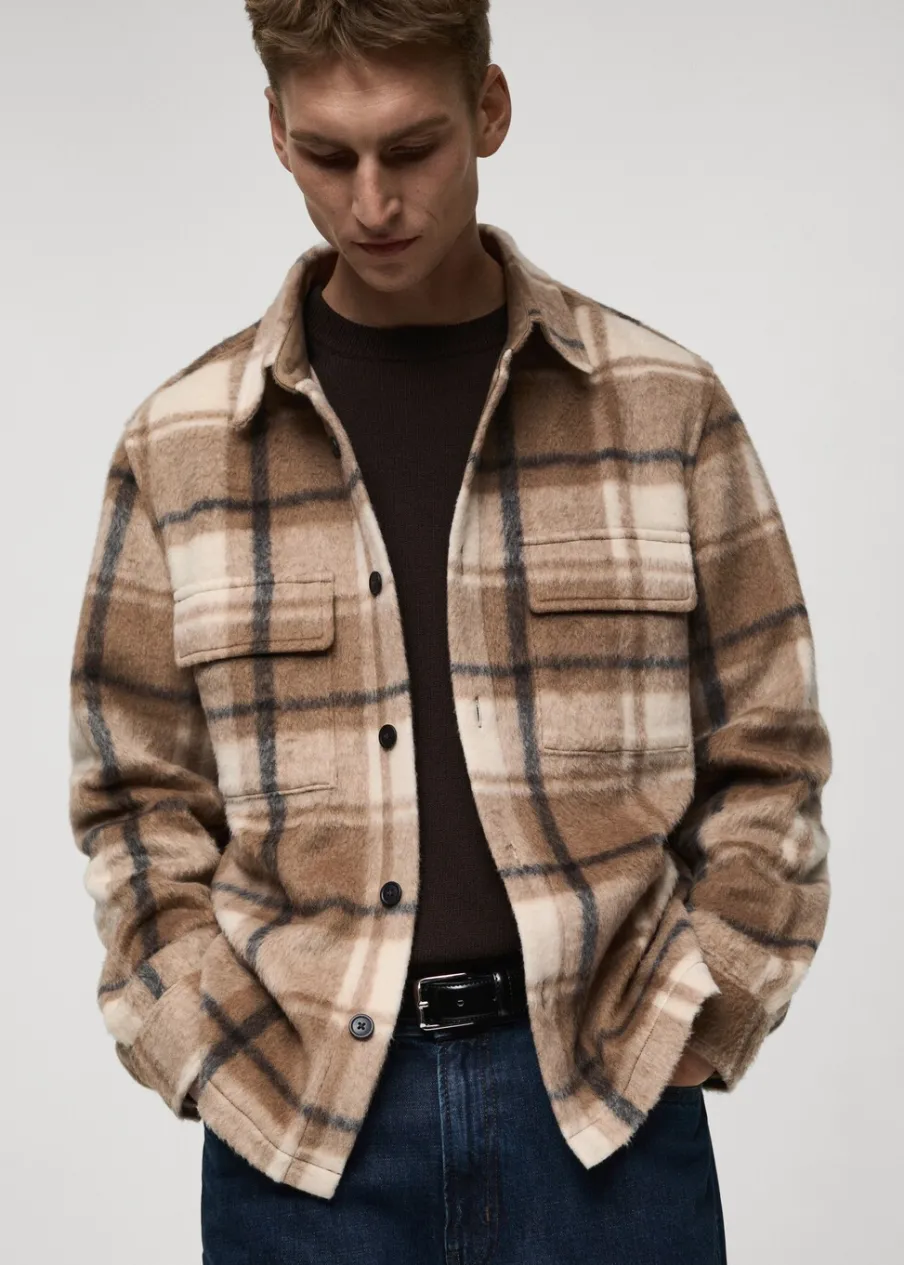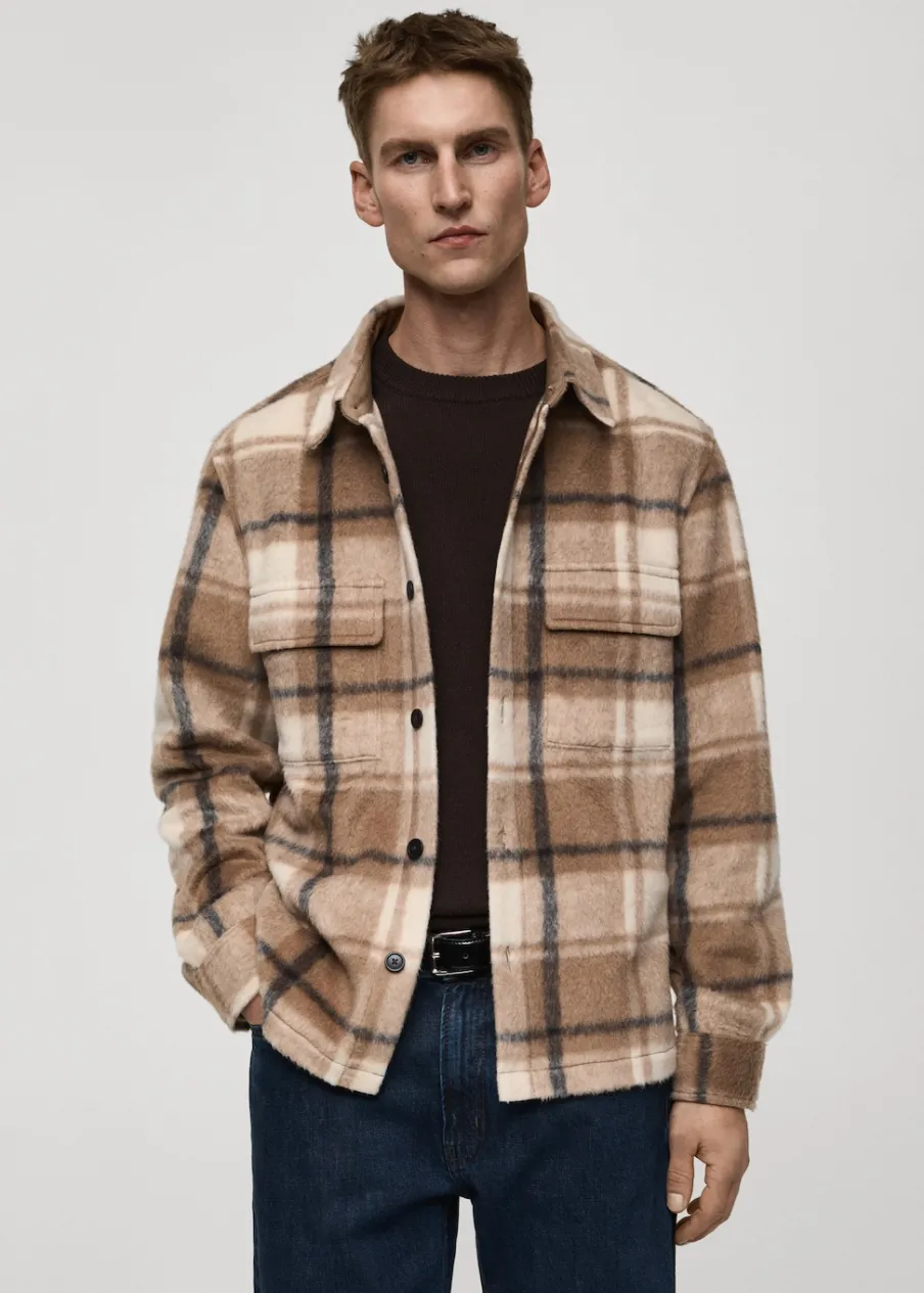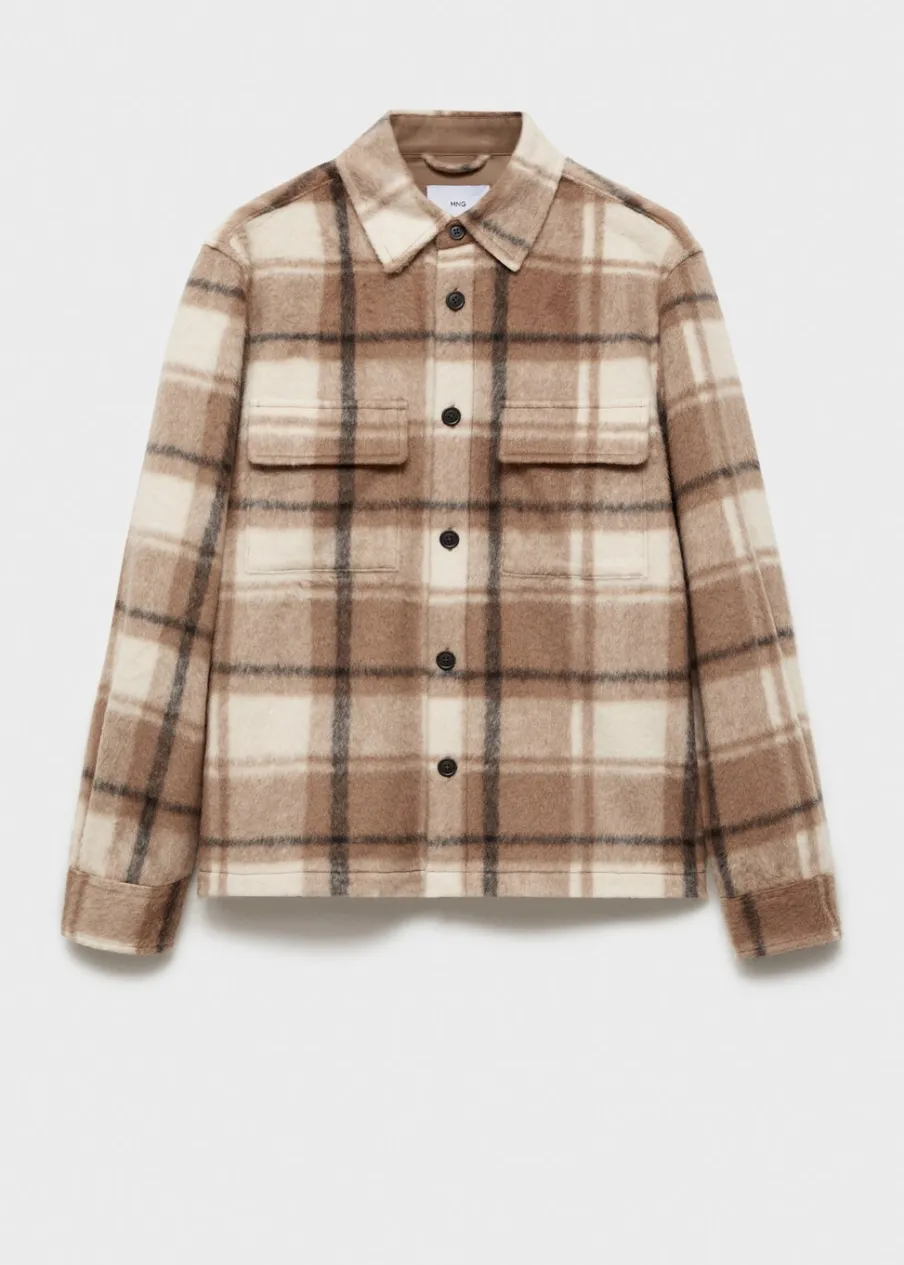 Krój regular. Tkanina flanelowa. Z teksturą. Deseń w kratę. Zapięcie na guziki. Koszulowy kołnierz. Zapinane mankiety. Dwie kieszenie z patkami z przodu. Model ma 185 cm wzrostu i nosi rozmiar M.