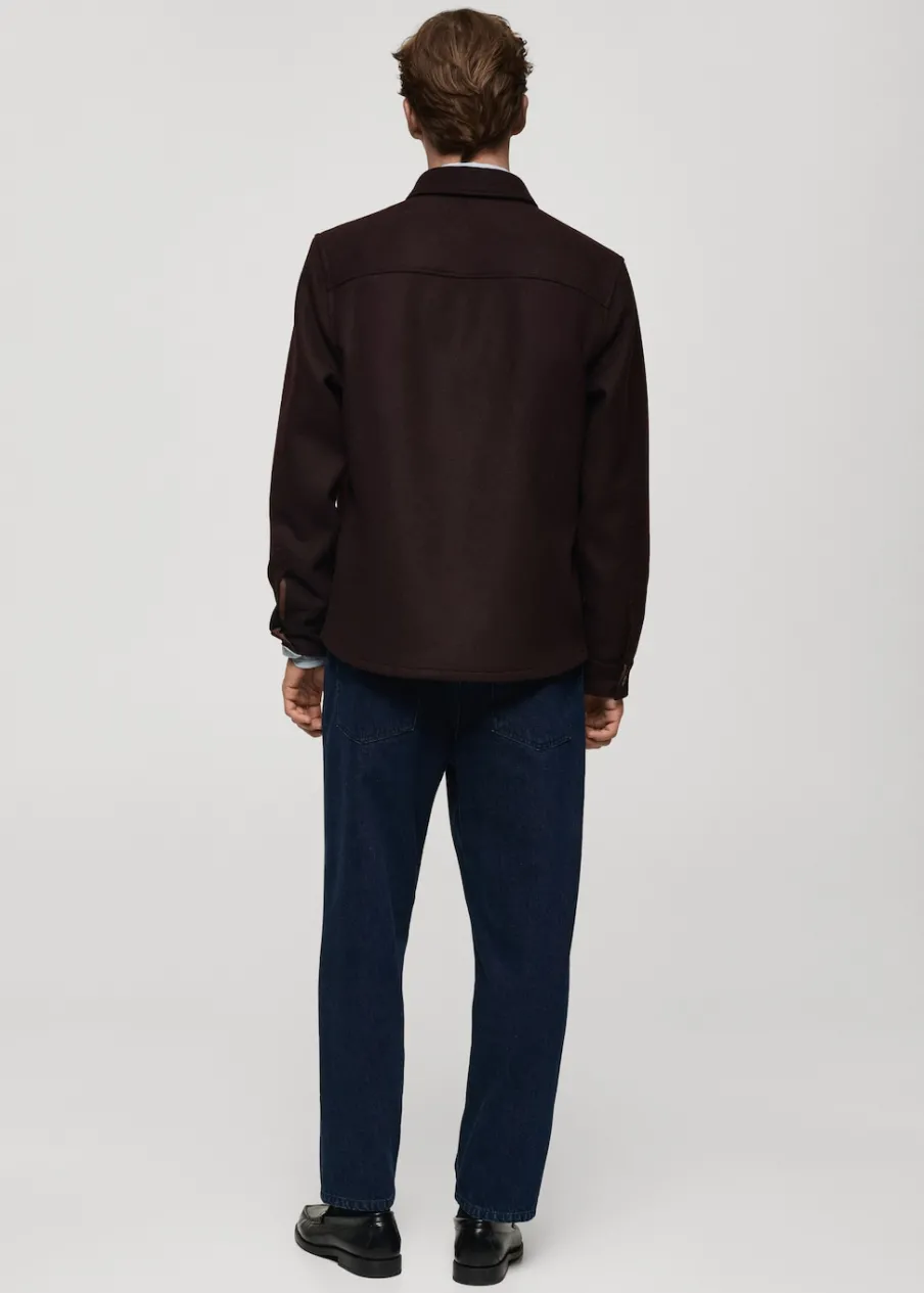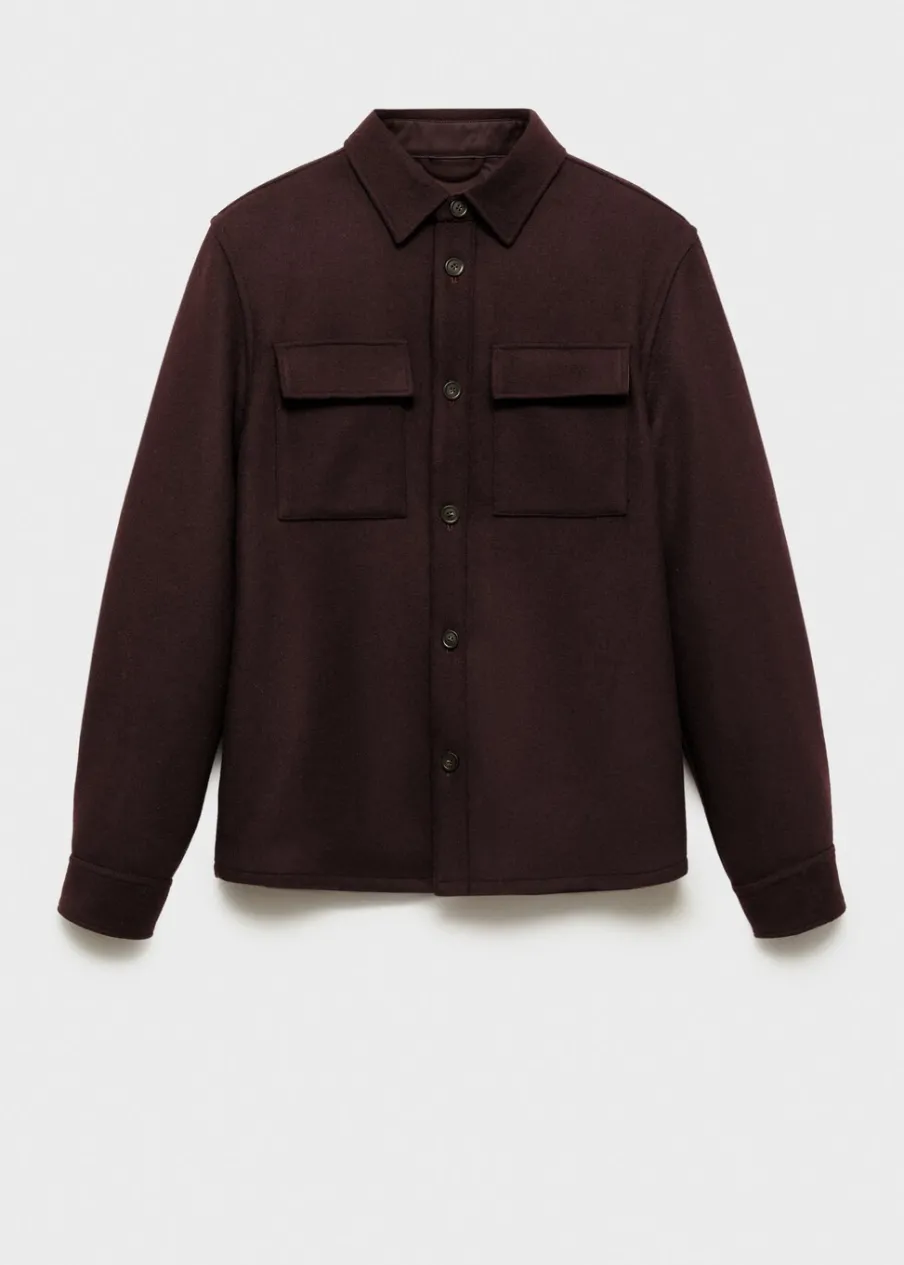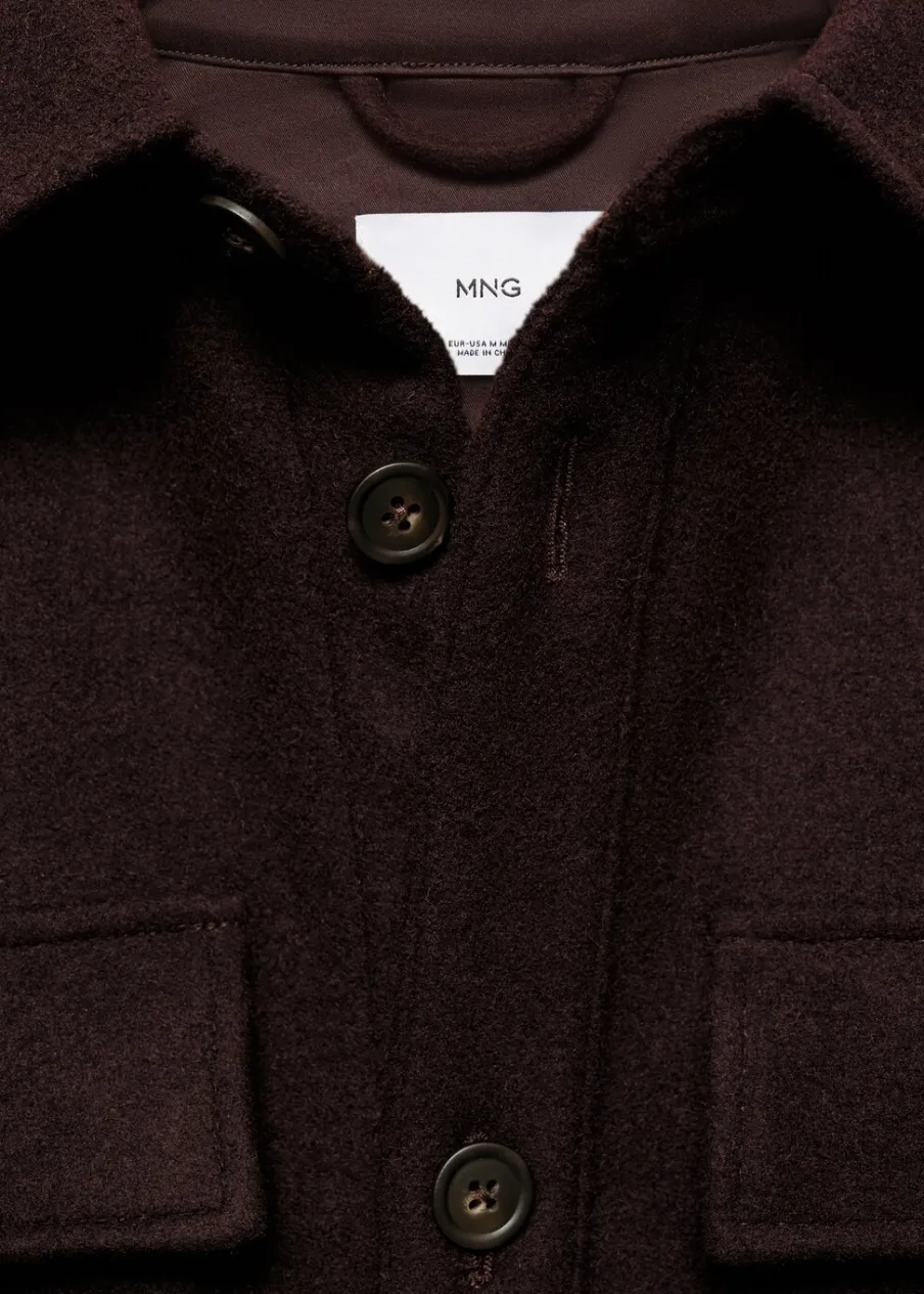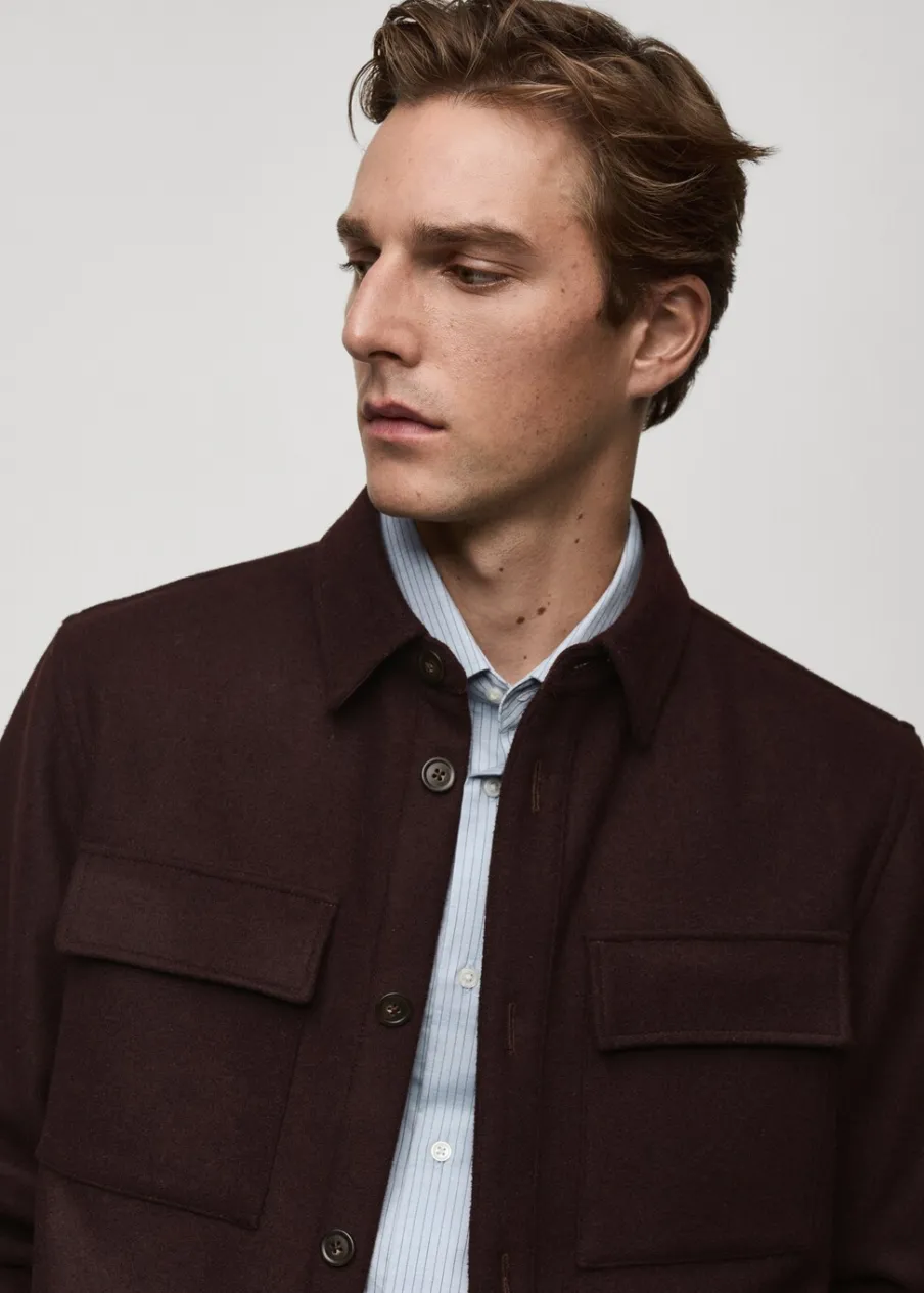 Flanela wełniana. Krój regular. Koszulowy kołnierz. Zapięcie na guziki z przodu. Długi rękaw z guzikami na mankietach. Dwie naszywane kieszenie z patką na piersi. Zaokrąglony dół. Wewnętrzna podszewka. Model ma 190 cm wzrostu i nosi rozmiar M.
