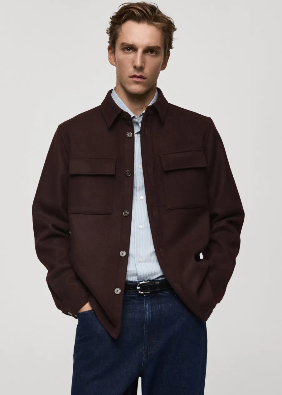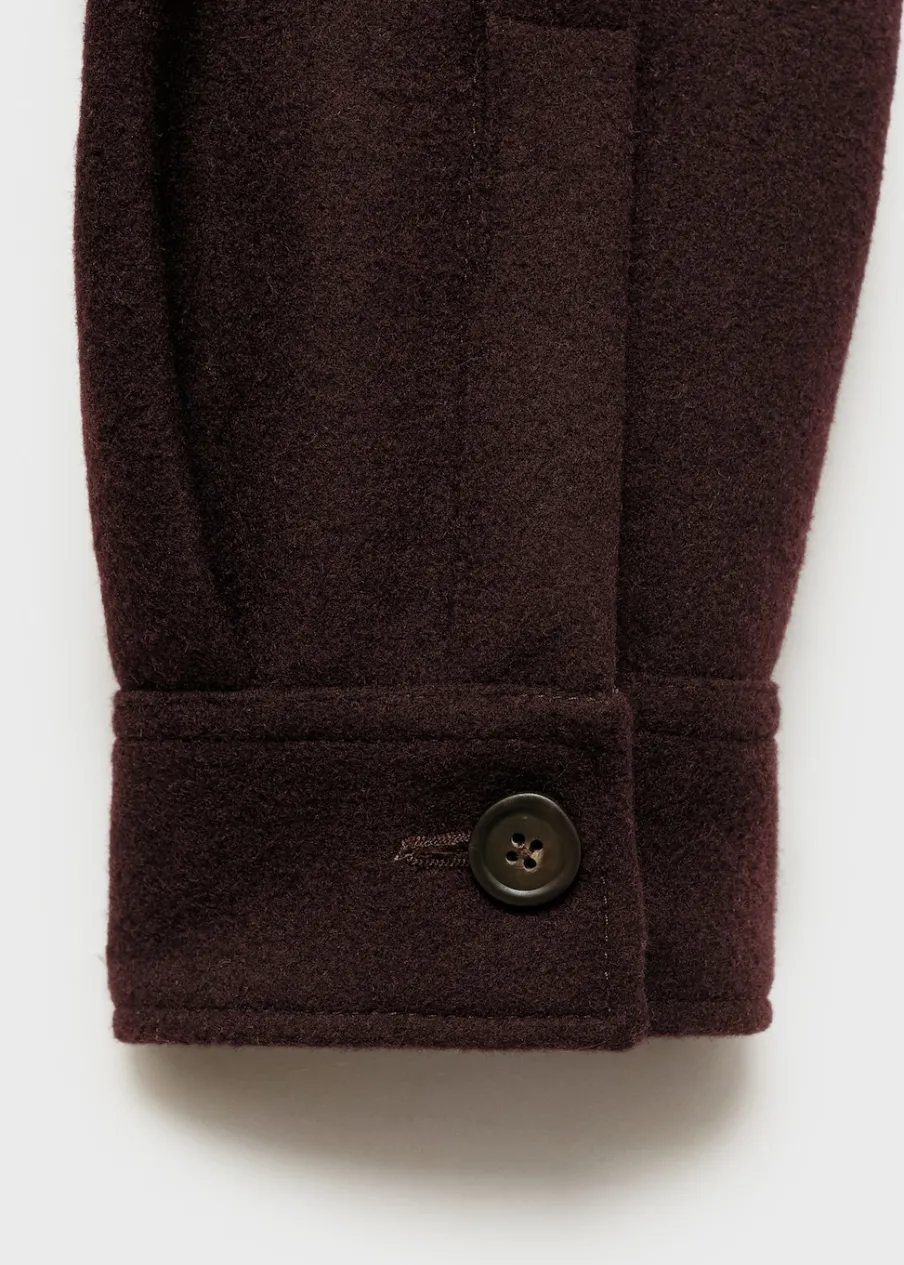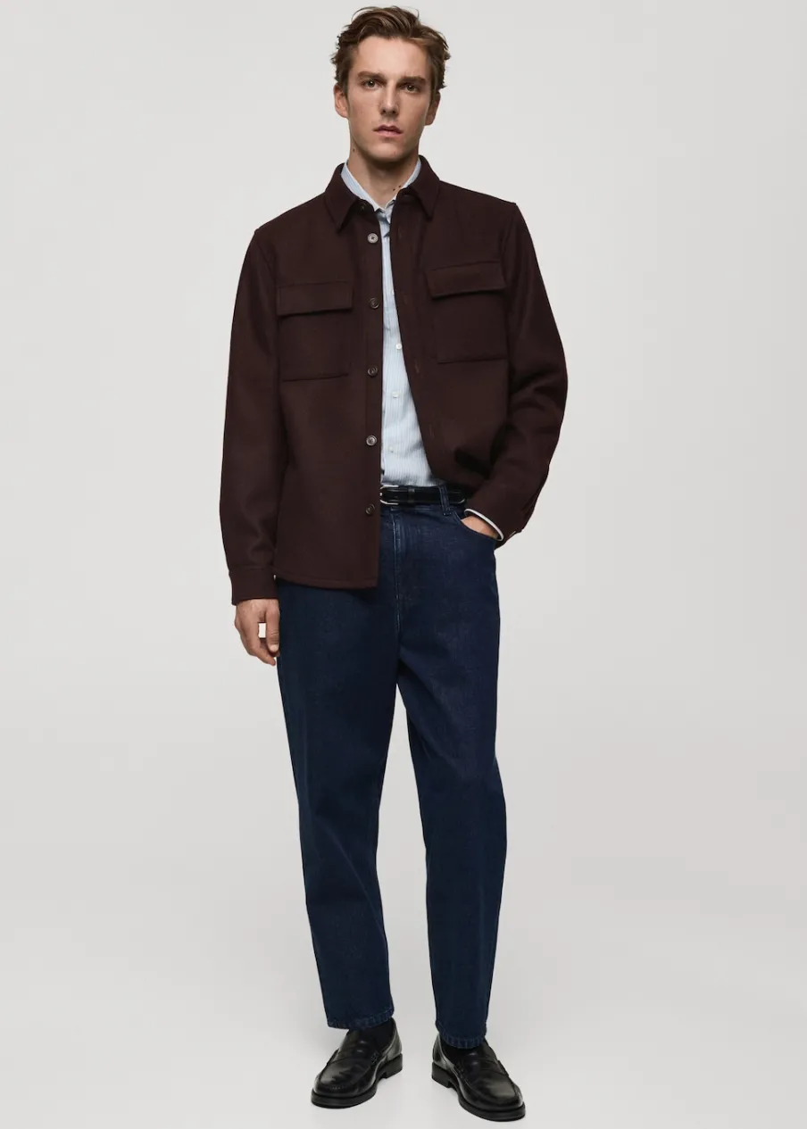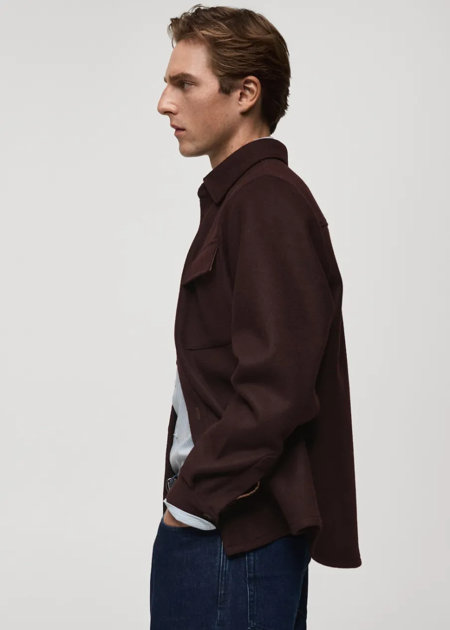 Flanela wełniana. Krój regular. Koszulowy kołnierz. Zapięcie na guziki z przodu. Długi rękaw z guzikami na mankietach. Dwie naszywane kieszenie z patką na piersi. Zaokrąglony dół. Wewnętrzna podszewka. Model ma 190 cm wzrostu i nosi rozmiar M.