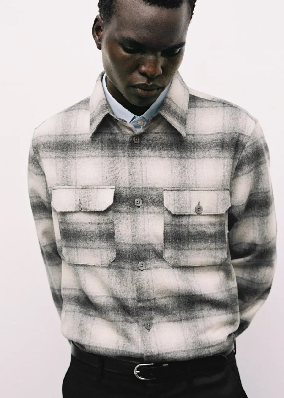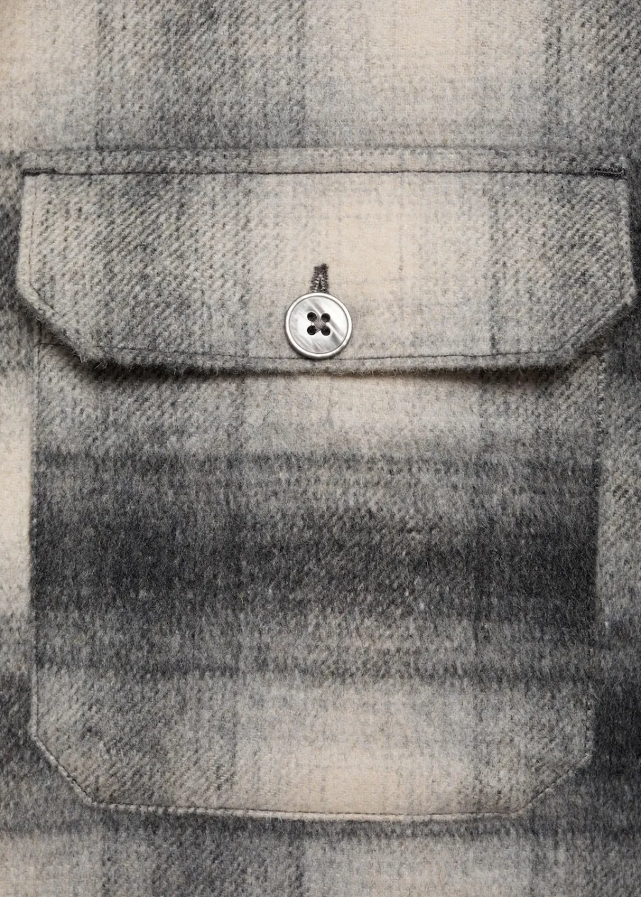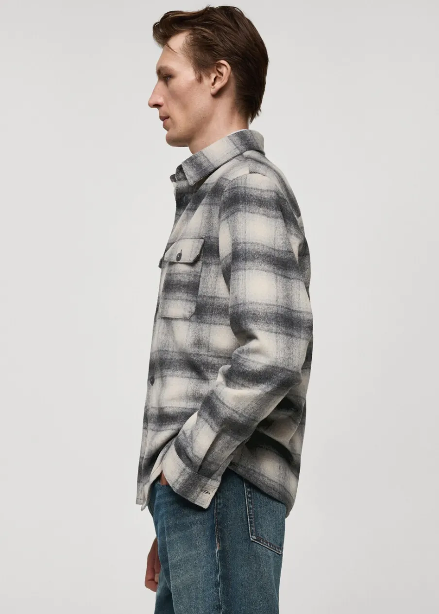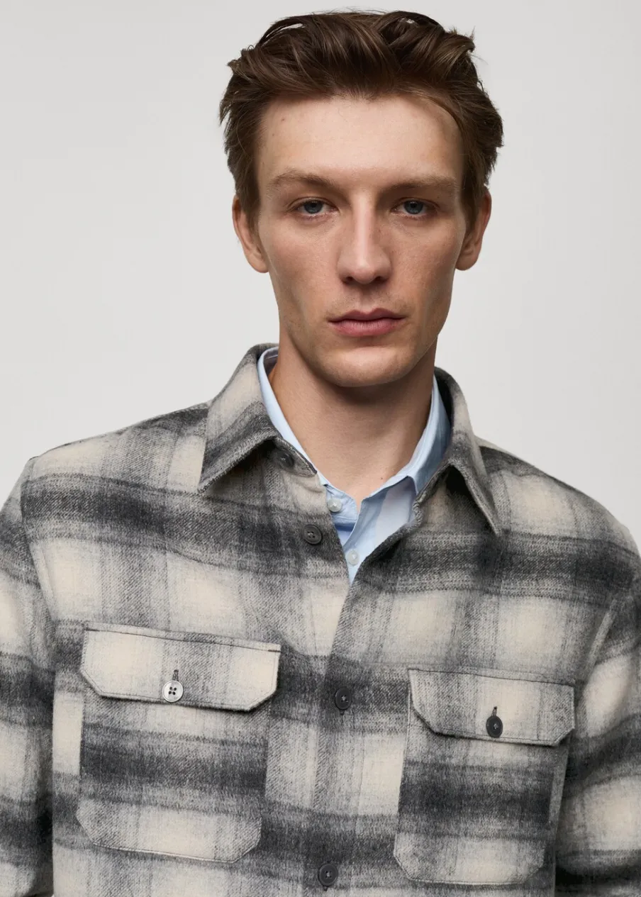 Krój regular. Wzór w kratę. Koszulowy kołnierz. Dwie naszywane kieszenie z patkami na guzik z przodu. Długi rękaw z guzikami na mankietach. Model ma 190 cm wzrostu i nosi rozmiar M. Flanela wełniana. Zaokrąglony dół. Zapięcie na guziki z przodu.