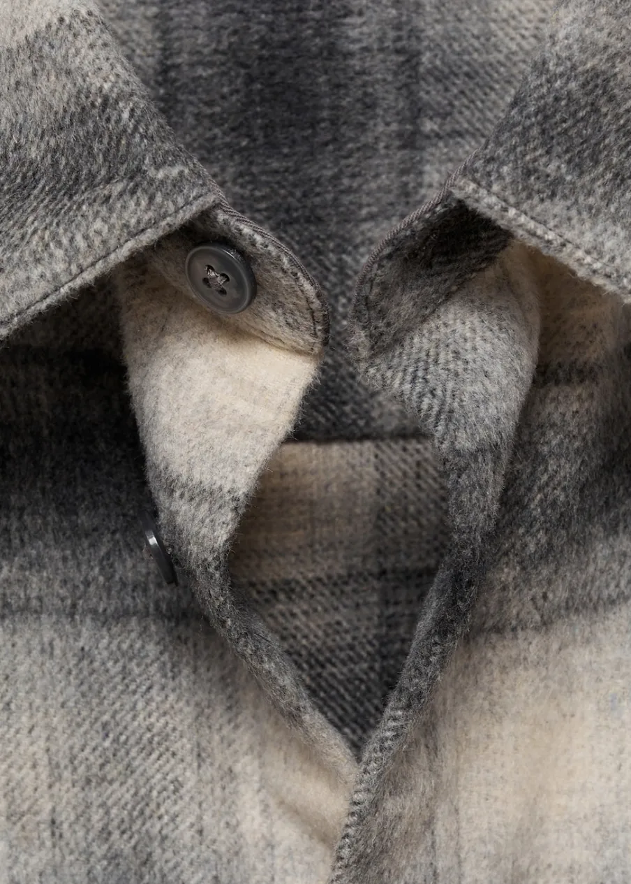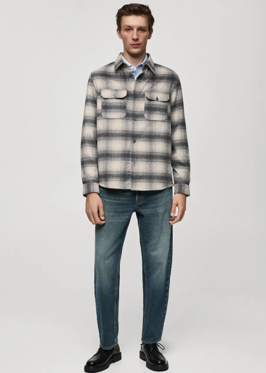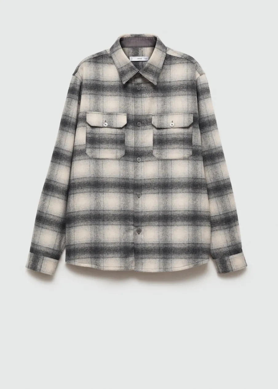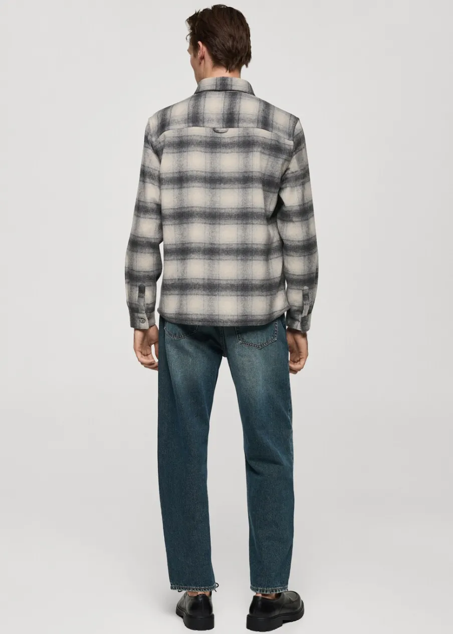 Krój regular. Wzór w kratę. Koszulowy kołnierz. Dwie naszywane kieszenie z patkami na guzik z przodu. Długi rękaw z guzikami na mankietach. Model ma 190 cm wzrostu i nosi rozmiar M. Flanela wełniana. Zaokrąglony dół. Zapięcie na guziki z przodu.