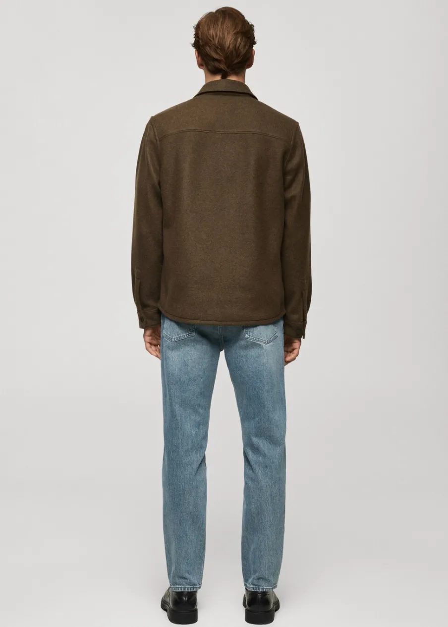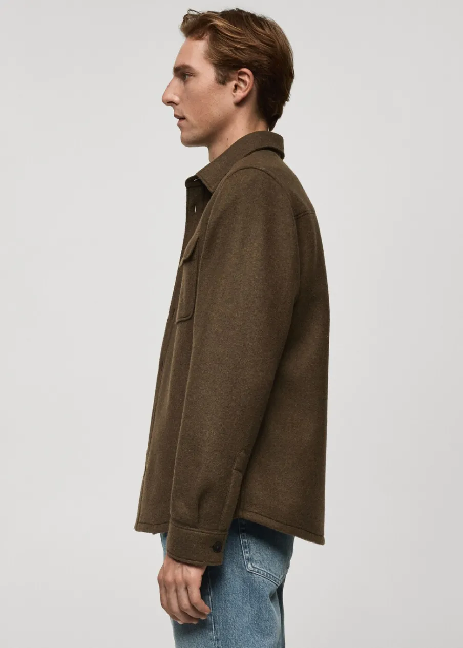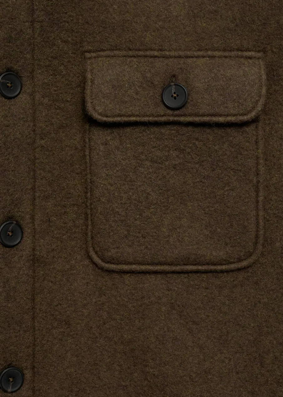 Regular fit, bekevert gyapjú anyag, gombos záródás, ing gallér, hosszú ujj gombos mandzsettával, két rávarrt hajtókás zseb és a mellrészen gomb, alul lekerekített fazon, a modell testmagassága 185 cm és M-es méretet visel.