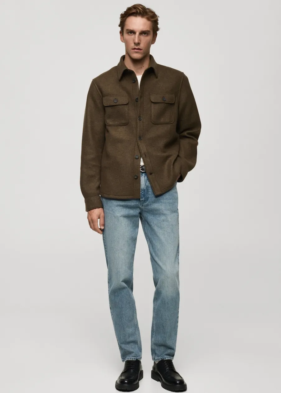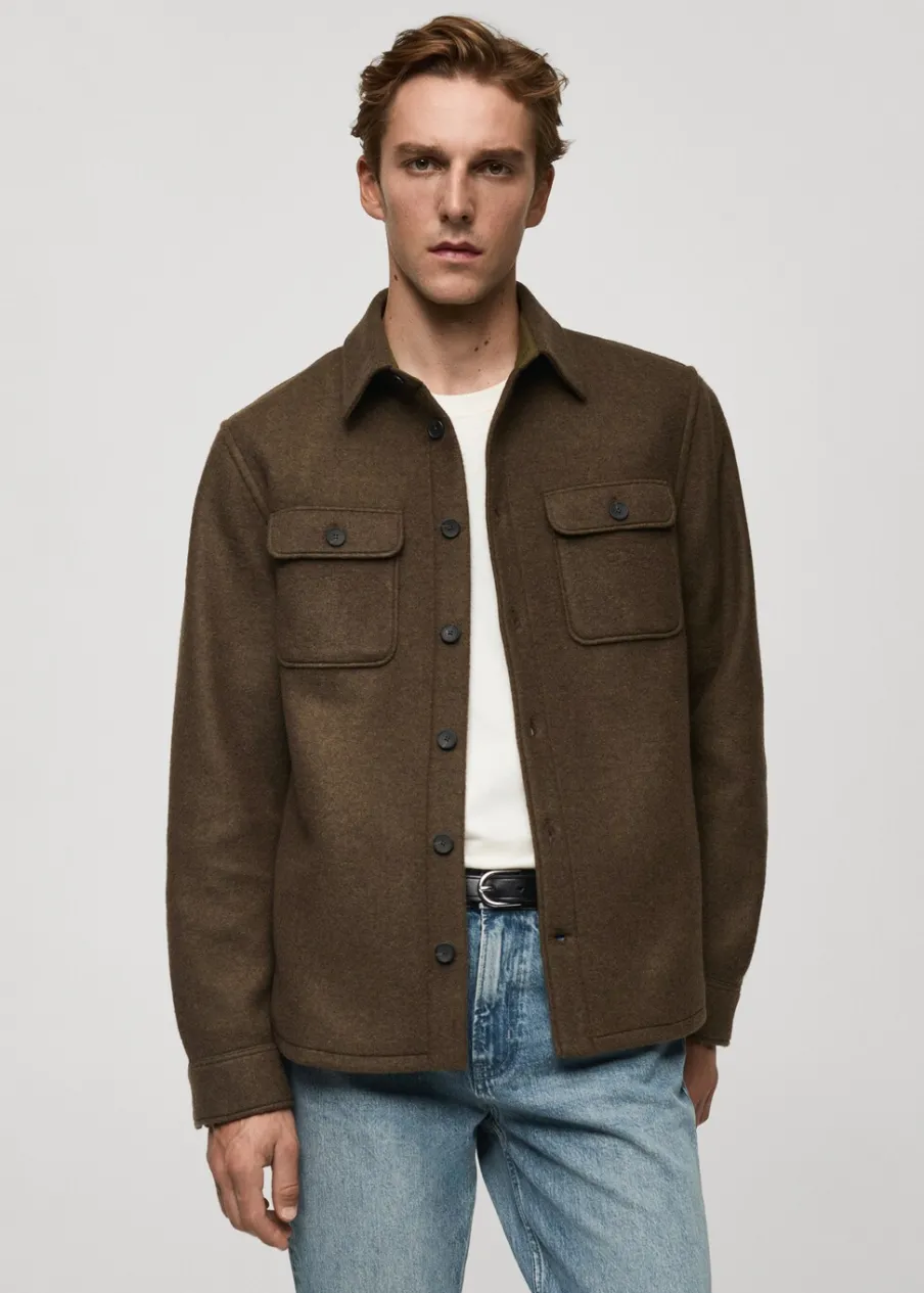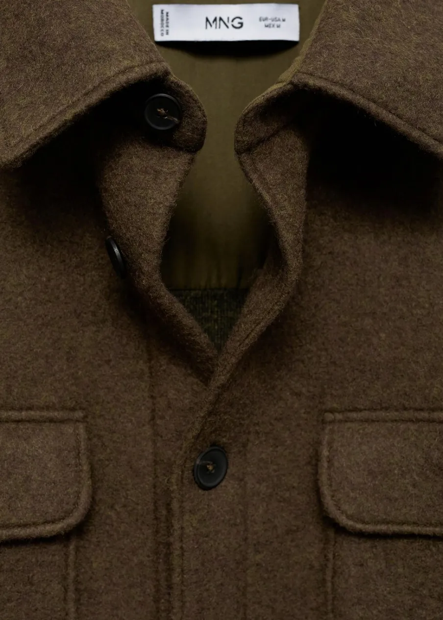 Regular fit, bekevert gyapjú anyag, gombos záródás, ing gallér, hosszú ujj gombos mandzsettával, két rávarrt hajtókás zseb és a mellrészen gomb, alul lekerekített fazon, a modell testmagassága 185 cm és M-es méretet visel.