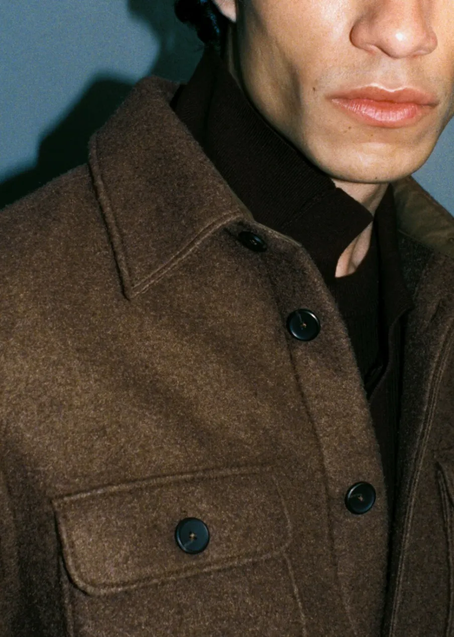 Krój regular. Tkanina mieszanka wełny. Zapięcie na guziki. Koszulowy kołnierz. Długi rękaw z guzikami na mankietach. Dwie naszywane kieszenie z patkami i guzikiem na piersi. Zaokrąglony dół. Model ma 185 cm wzrostu i nosi rozmiar M.