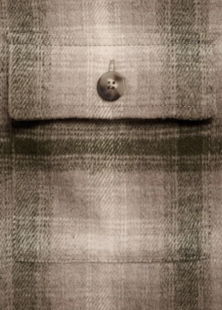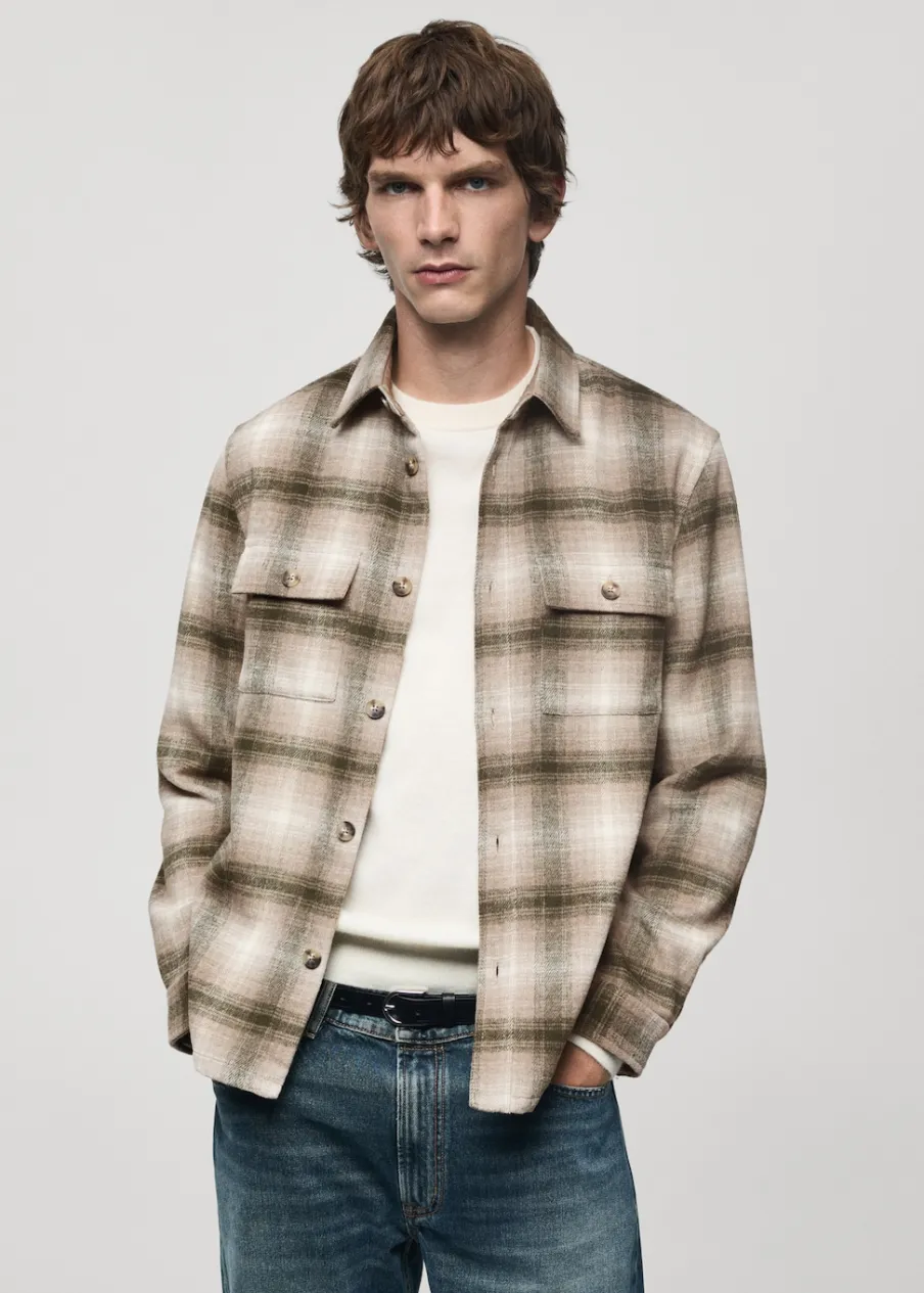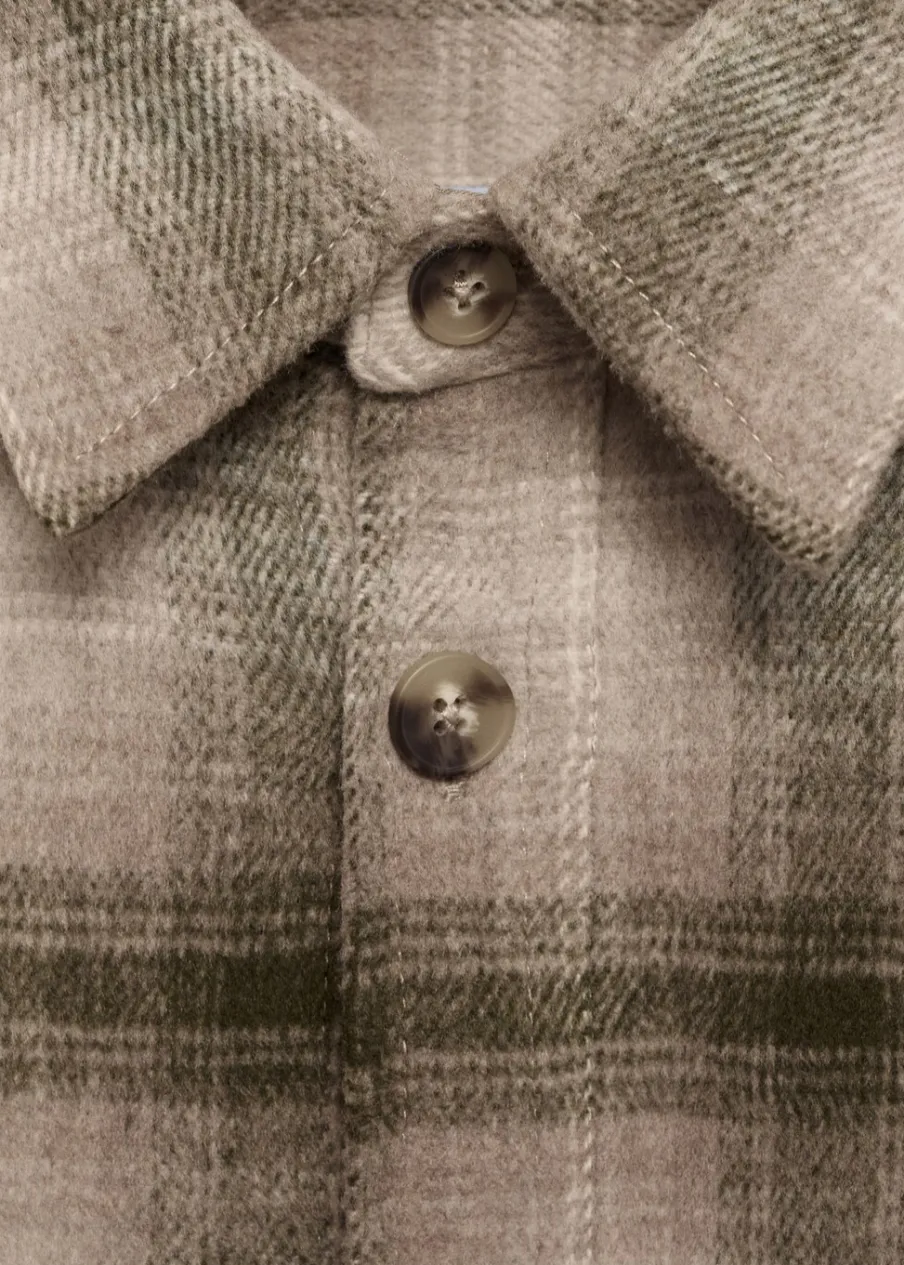 Tkanina mieszanka wełny. Tkanina flanelowa. Krój regular. Klasyczny kołnierzyk. Dwie naszywane kieszenie z patkami i guzikiem na piersi. Zapięcie na guziki z przodu. Długi rękaw z guzikami na mankietach. Zaokrąglony dół. Model ma 190 cm wzrostu i nosi rozmiar M. Deseń w kratę.