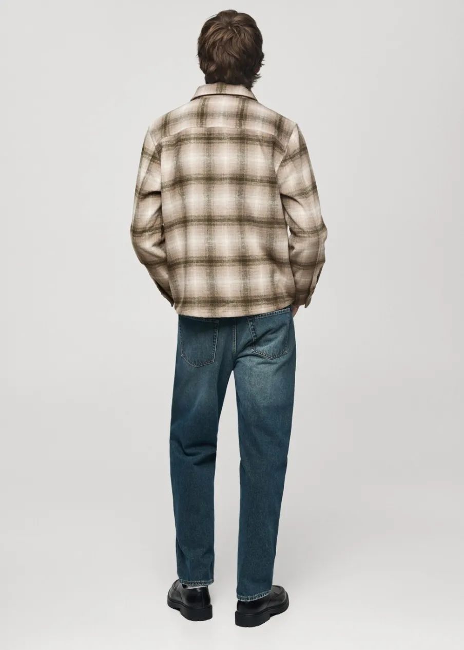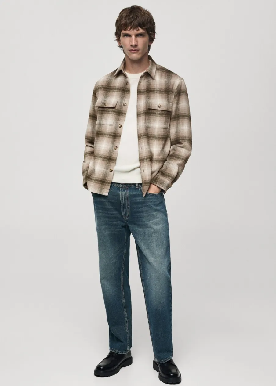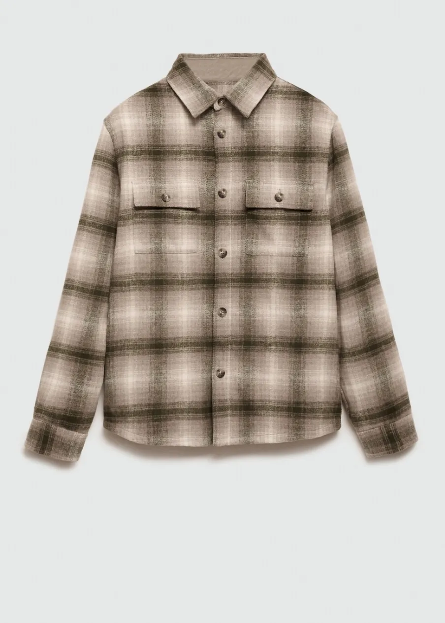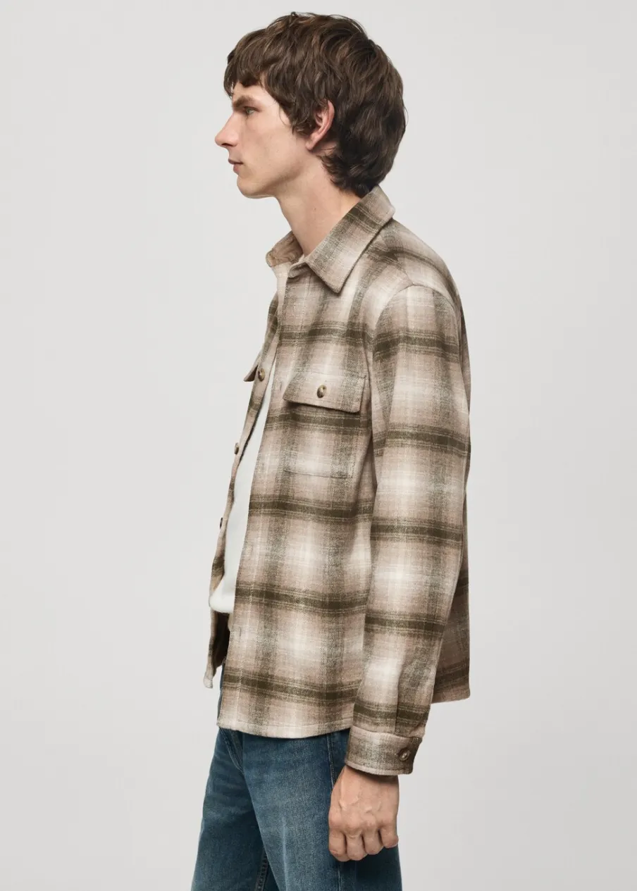 Tkanina mieszanka wełny. Tkanina flanelowa. Krój regular. Klasyczny kołnierzyk. Dwie naszywane kieszenie z patkami i guzikiem na piersi. Zapięcie na guziki z przodu. Długi rękaw z guzikami na mankietach. Zaokrąglony dół. Model ma 190 cm wzrostu i nosi rozmiar M. Deseń w kratę.