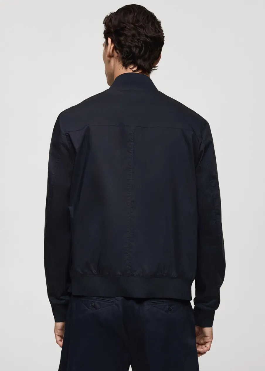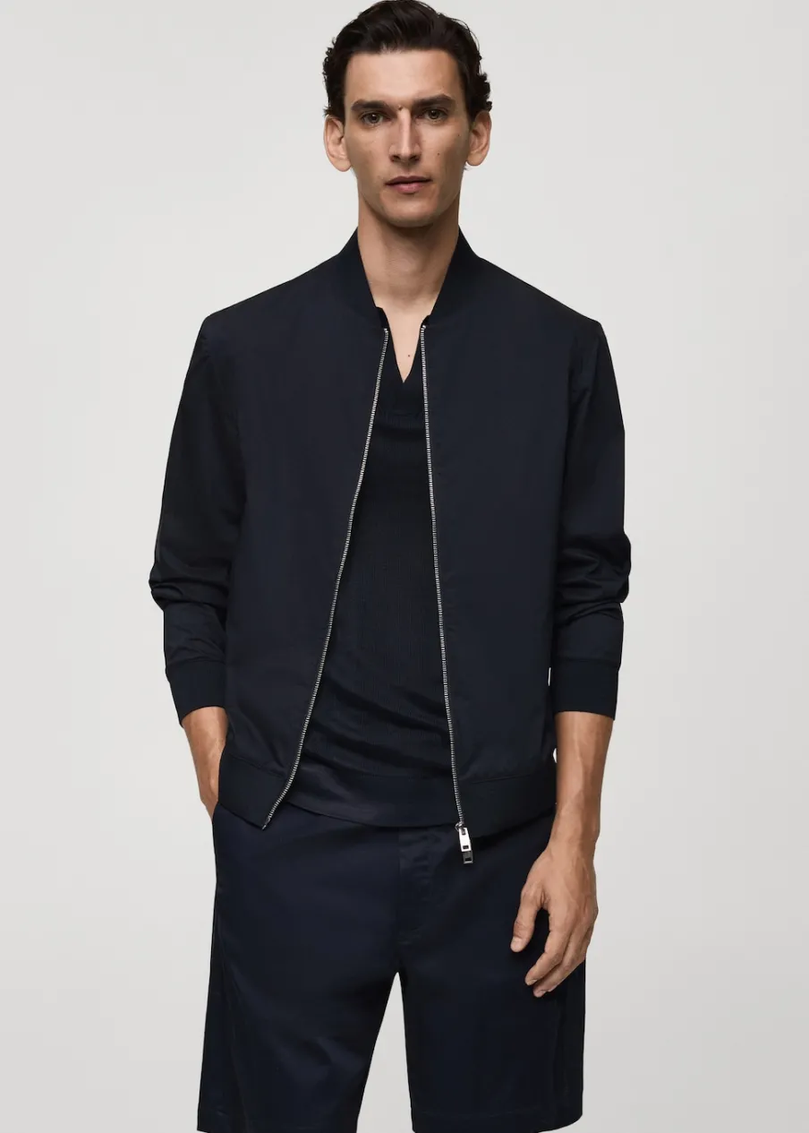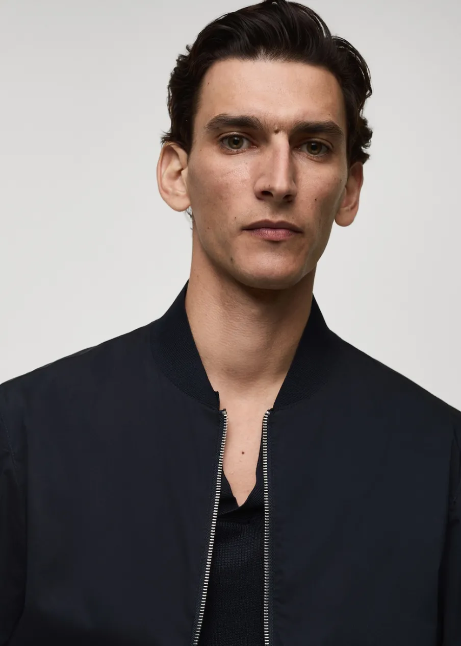 Tkanina bawełniana. Lekka tkanina w technicznym stylu. Model bomber. Prążkowany kołnierzyk typu bomber. Długi rękaw z elastycznymi mankietami. Zapięcie z przodu na suwak. Elastyczna gumka u dołu. Model ma 185 cm wzrostu i nosi rozmiar M. Prążkowane wykończenie na dekolcie, rękawach i u dołu.