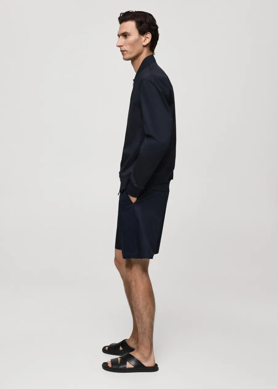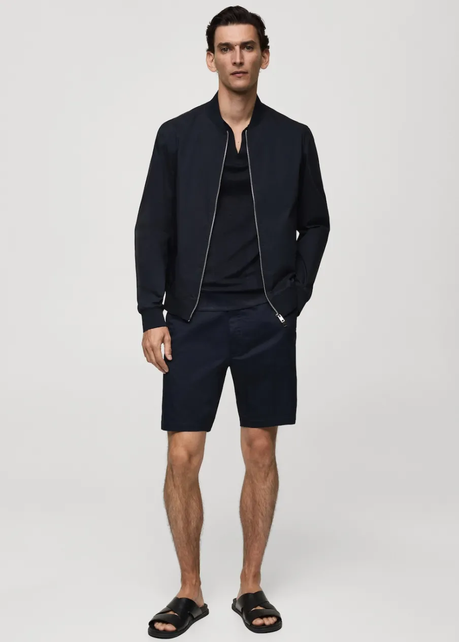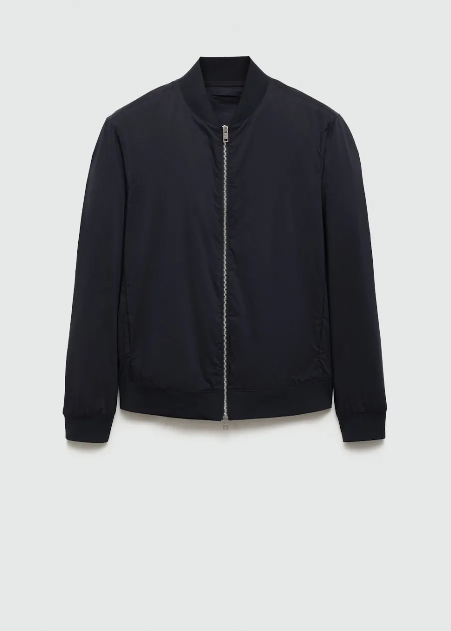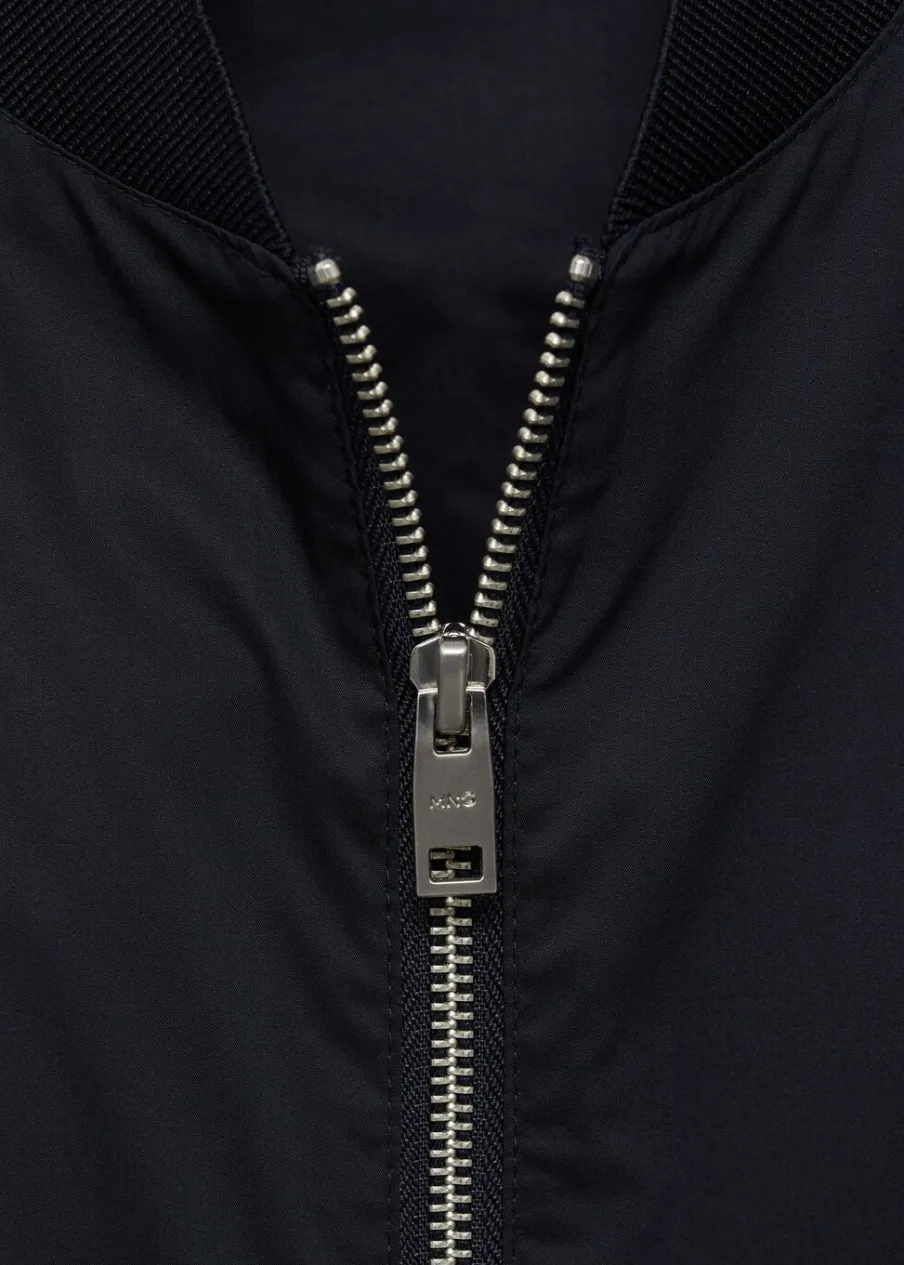 Tkanina bawełniana. Lekka tkanina w technicznym stylu. Model bomber. Prążkowany kołnierzyk typu bomber. Długi rękaw z elastycznymi mankietami. Zapięcie z przodu na suwak. Elastyczna gumka u dołu. Model ma 185 cm wzrostu i nosi rozmiar M. Prążkowane wykończenie na dekolcie, rękawach i u dołu.