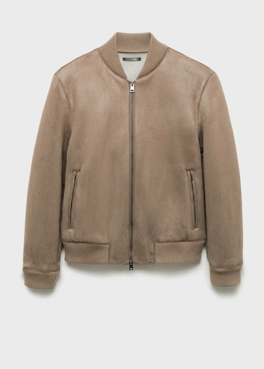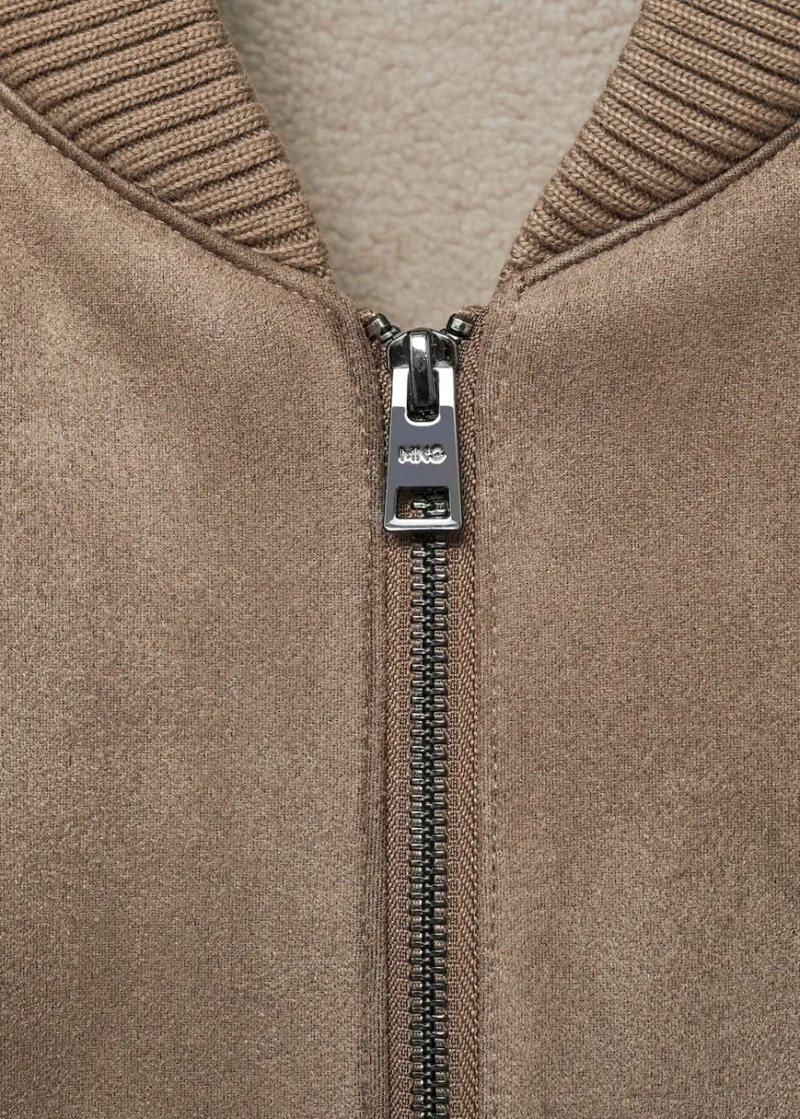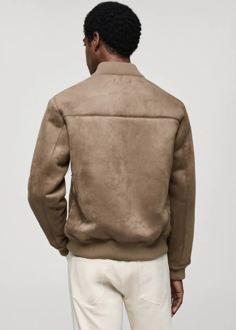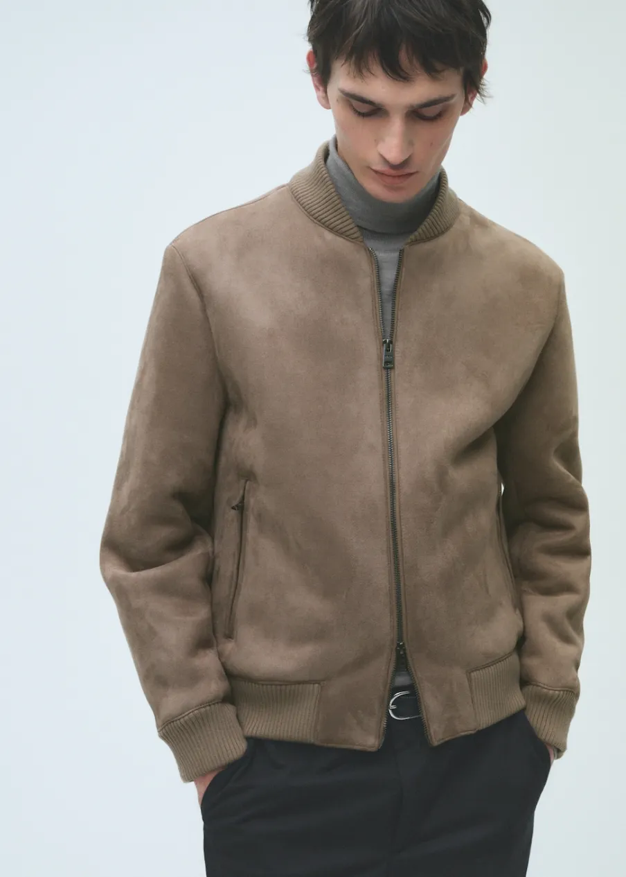Zapięcie na suwak. Dwie kieszenie na zamek z boku. Podszewka ze sztucznego baranka. Model ma 185 cm wzrostu i nosi rozmiar M. Imitacja zamszu. Model bomber. Kontrastowe prążkowane wykończenie na dekolcie, rękawach i u dołu.