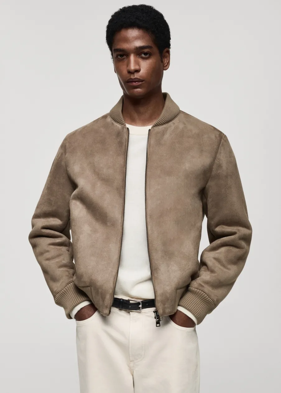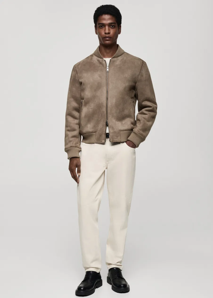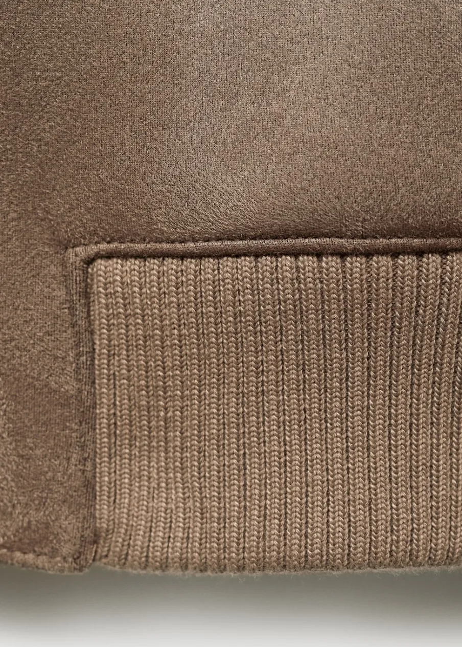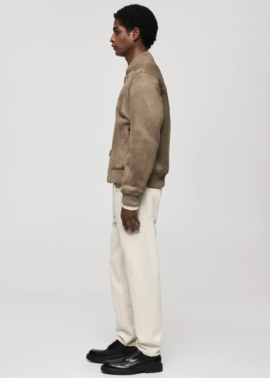 Zapięcie na suwak. Dwie kieszenie na zamek z boku. Podszewka ze sztucznego baranka. Model ma 185 cm wzrostu i nosi rozmiar M. Imitacja zamszu. Model bomber. Kontrastowe prążkowane wykończenie na dekolcie, rękawach i u dołu.