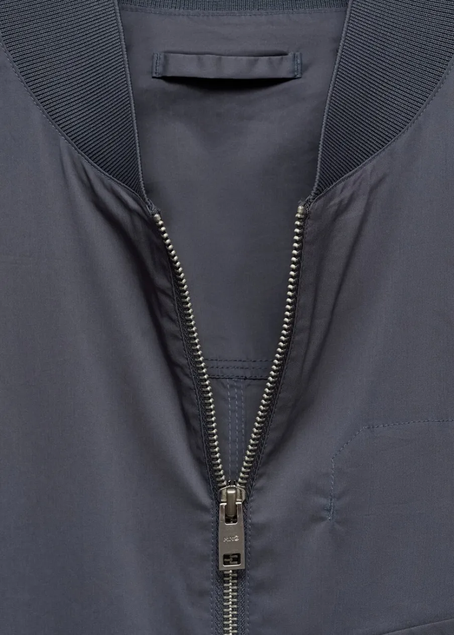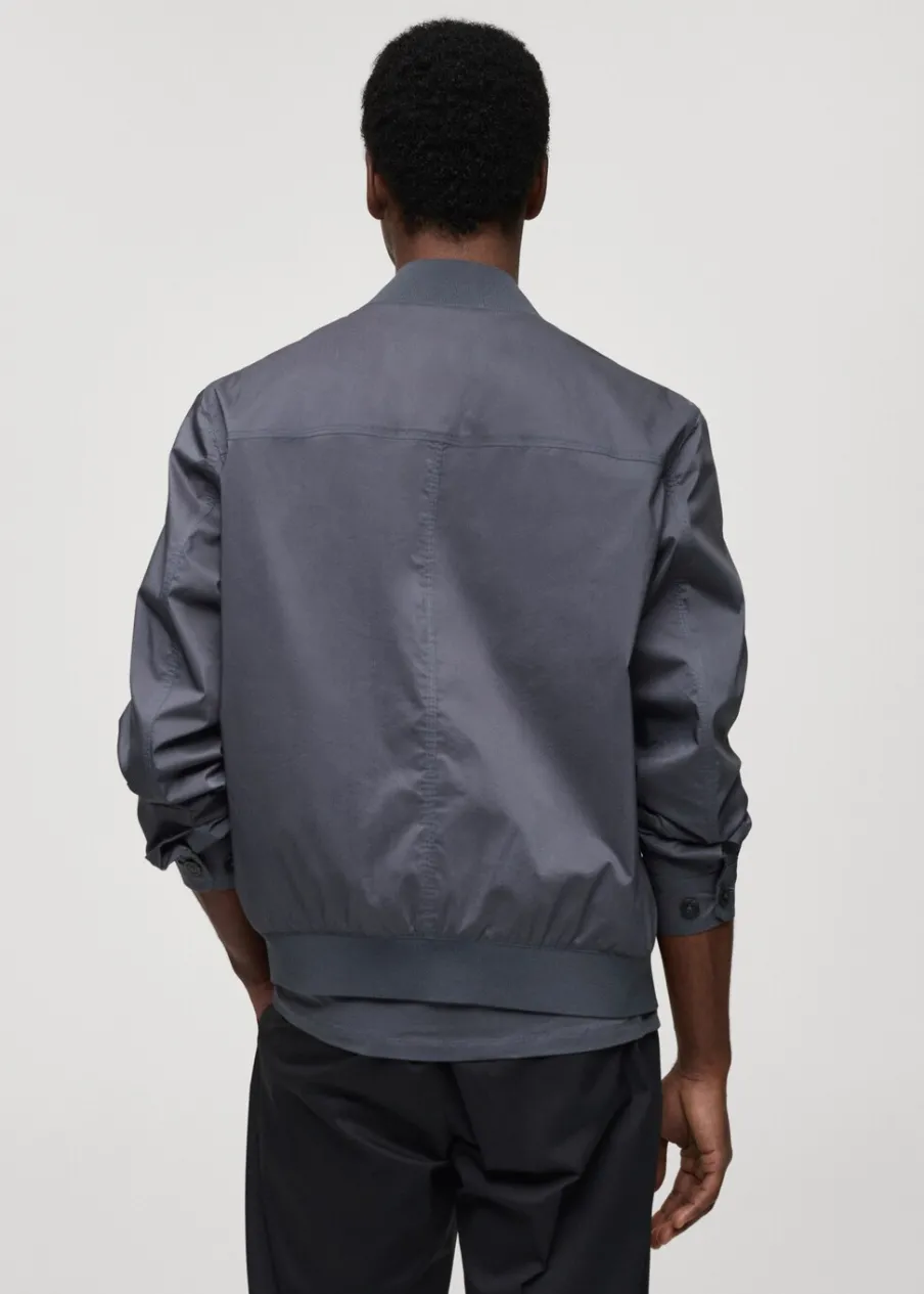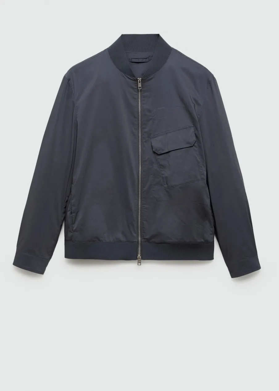 Model bomber. Prążkowany kołnierzyk typu bomber. Zapięcie na metalowy zamek z przodu. Kieszeń z patką na piersi. Długi rękaw z elastycznymi mankietami. Elastyczna gumka u dołu. Model ma 185 cm wzrostu i nosi rozmiar M. Prążkowane wykończenie na dekolcie, rękawach i u dołu.