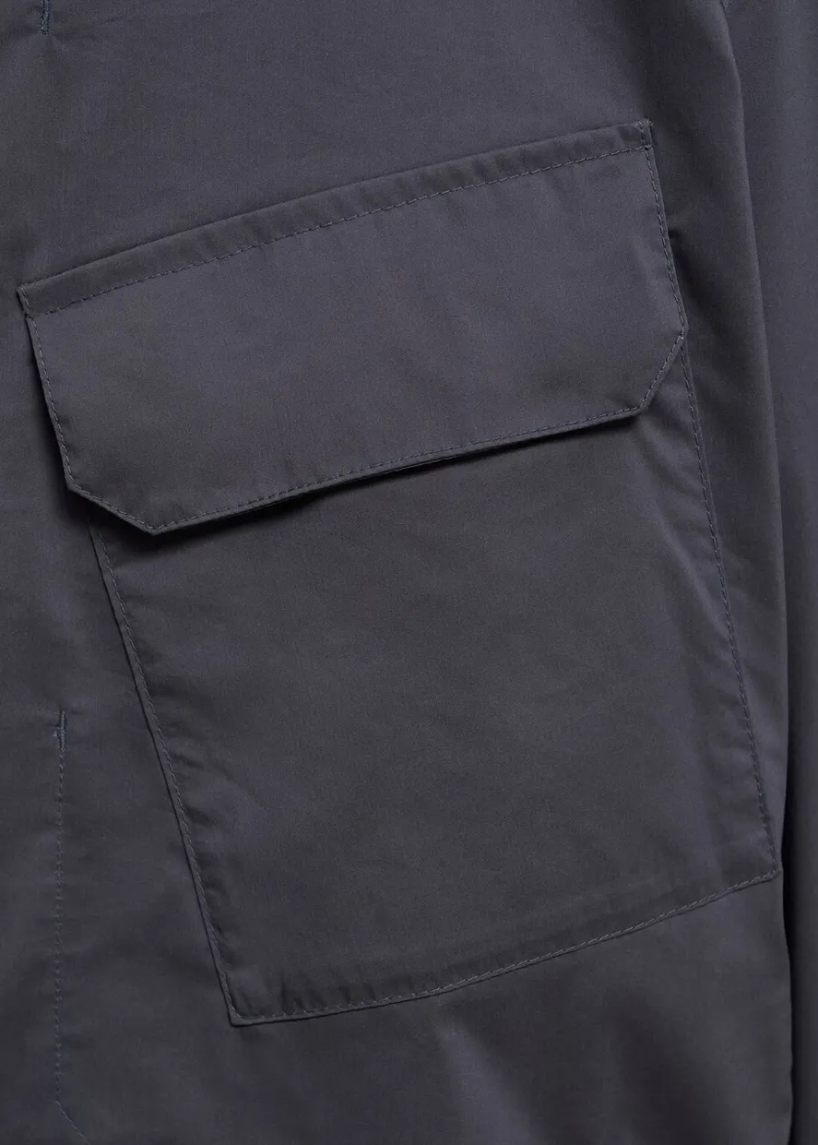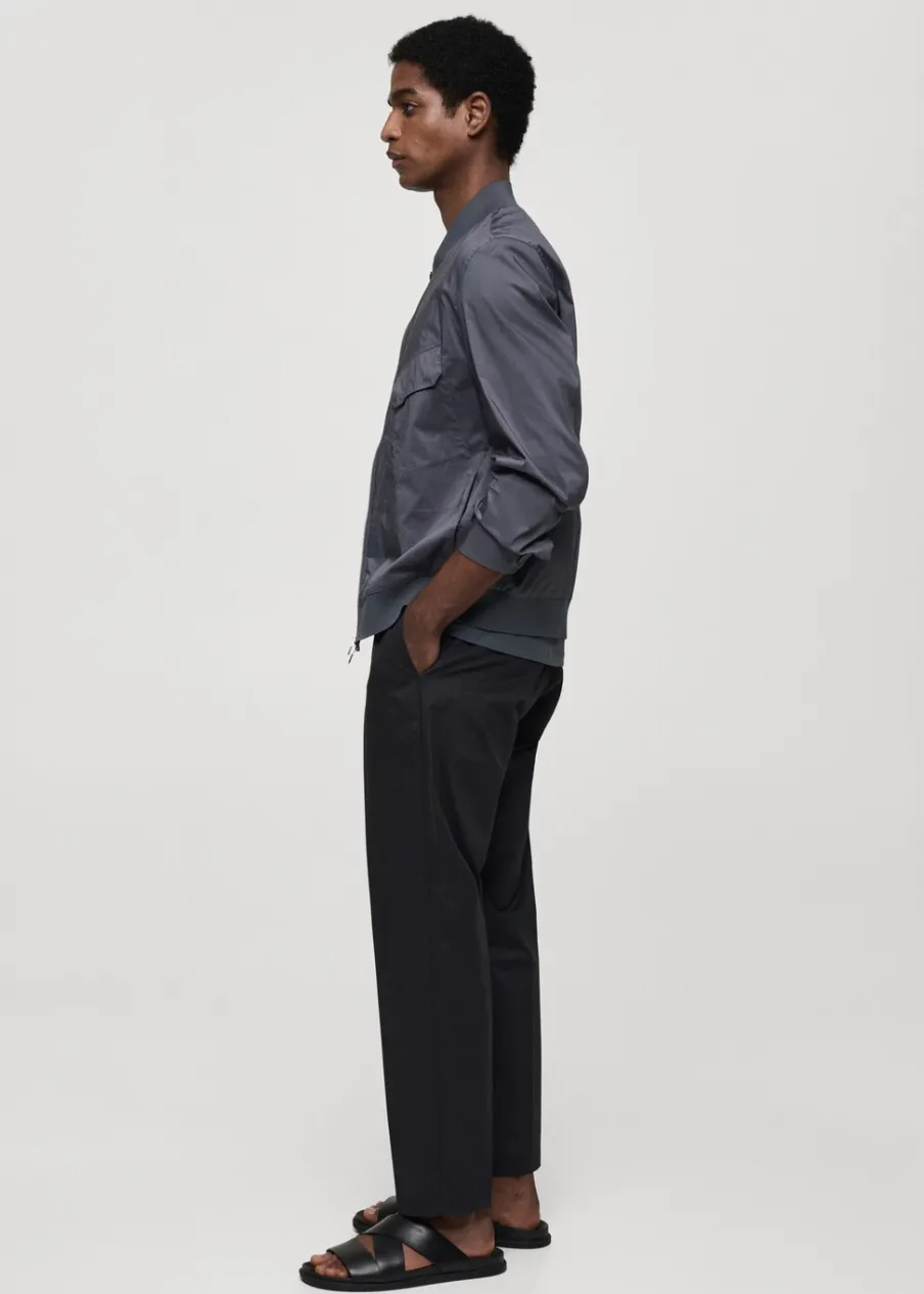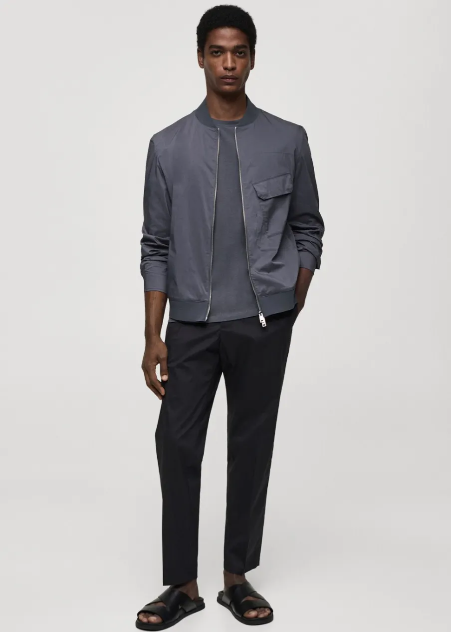 Model bomber. Prążkowany kołnierzyk typu bomber. Zapięcie na metalowy zamek z przodu. Kieszeń z patką na piersi. Długi rękaw z elastycznymi mankietami. Elastyczna gumka u dołu. Model ma 185 cm wzrostu i nosi rozmiar M. Prążkowane wykończenie na dekolcie, rękawach i u dołu.