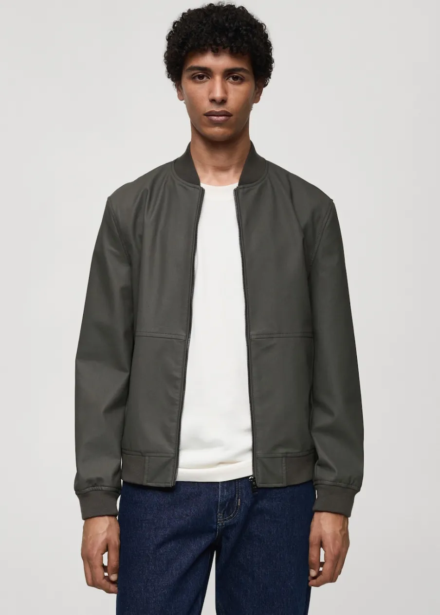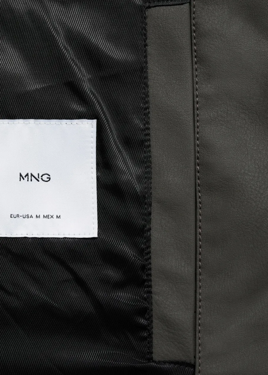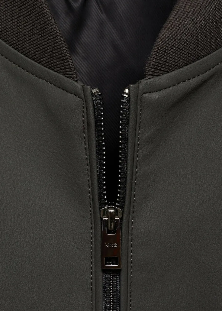 Model bomber. Efekt skóry. Prążkowany kołnierzyk typu bomber. Zapięcie z przodu na suwak. Z przodu dwie kieszenie z zapięciem na zatrzask. Długi rękaw z elastycznymi mankietami. Elastyczna gumka u dołu. Wewnętrzna podszewka. Model ma 185 cm wzrostu i nosi rozmiar M.