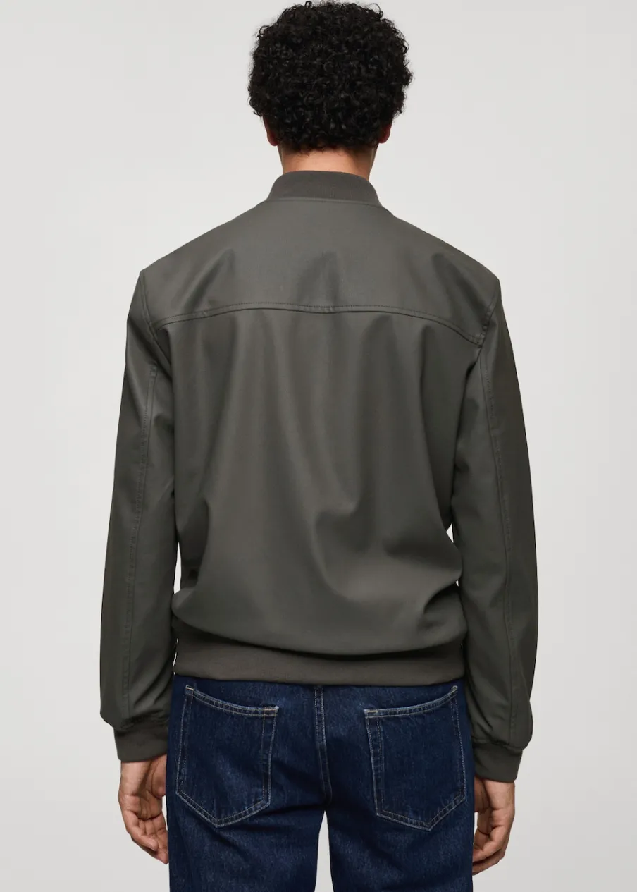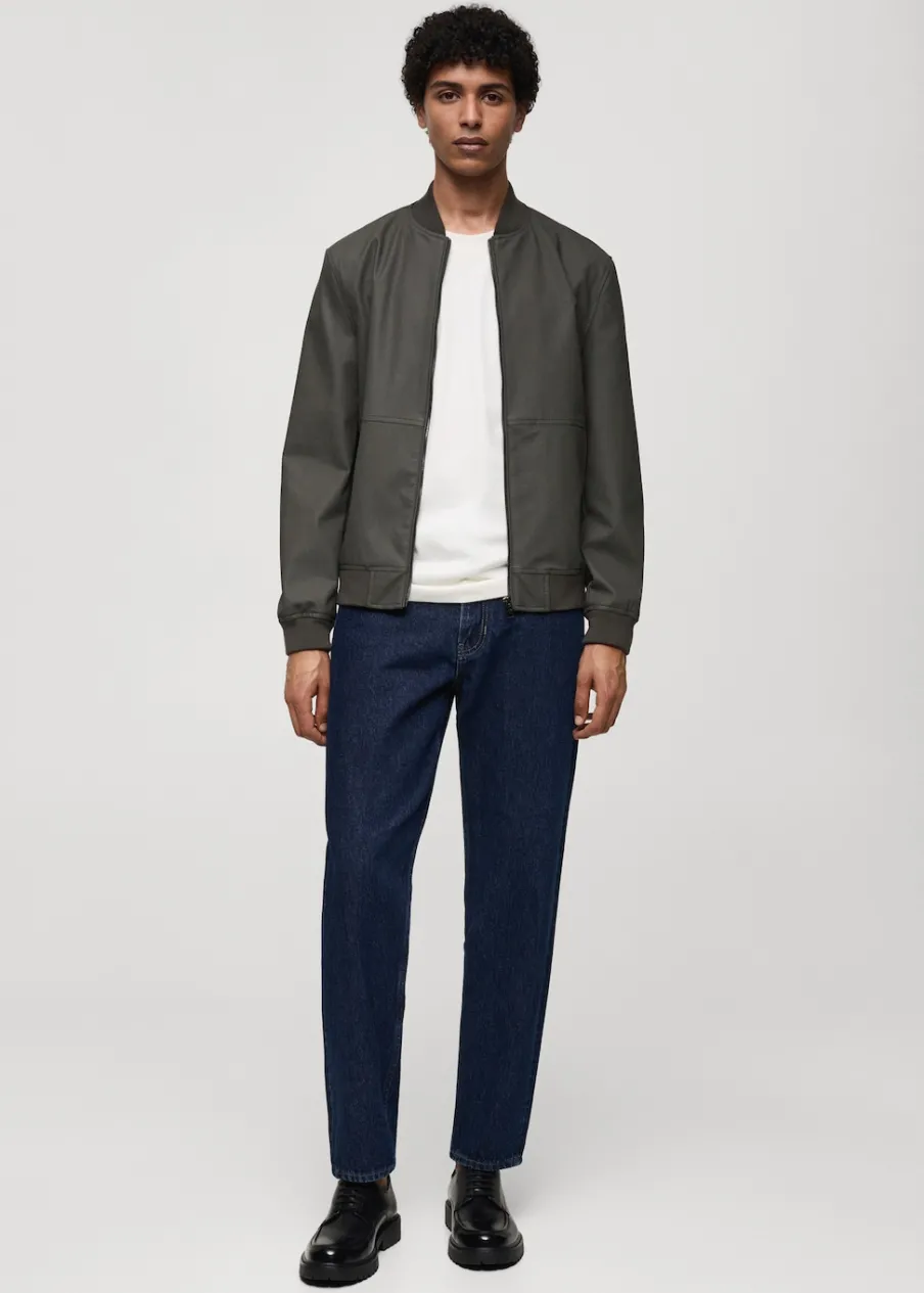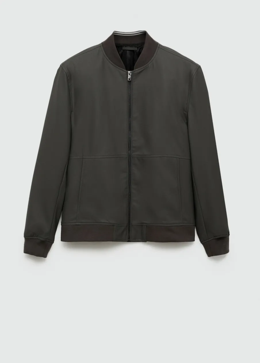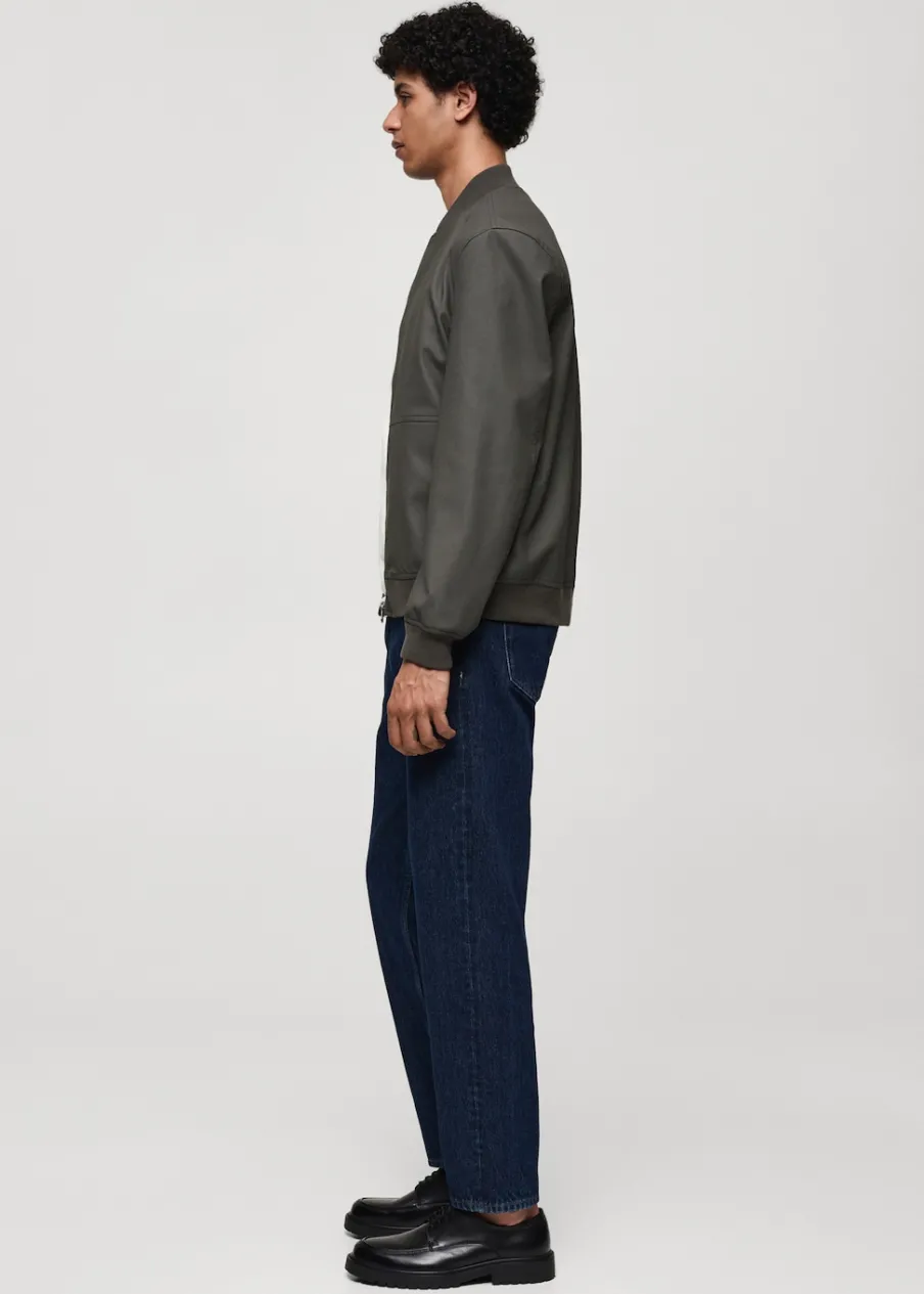 Model bomber. Efekt skóry. Prążkowany kołnierzyk typu bomber. Zapięcie z przodu na suwak. Z przodu dwie kieszenie z zapięciem na zatrzask. Długi rękaw z elastycznymi mankietami. Elastyczna gumka u dołu. Wewnętrzna podszewka. Model ma 185 cm wzrostu i nosi rozmiar M.