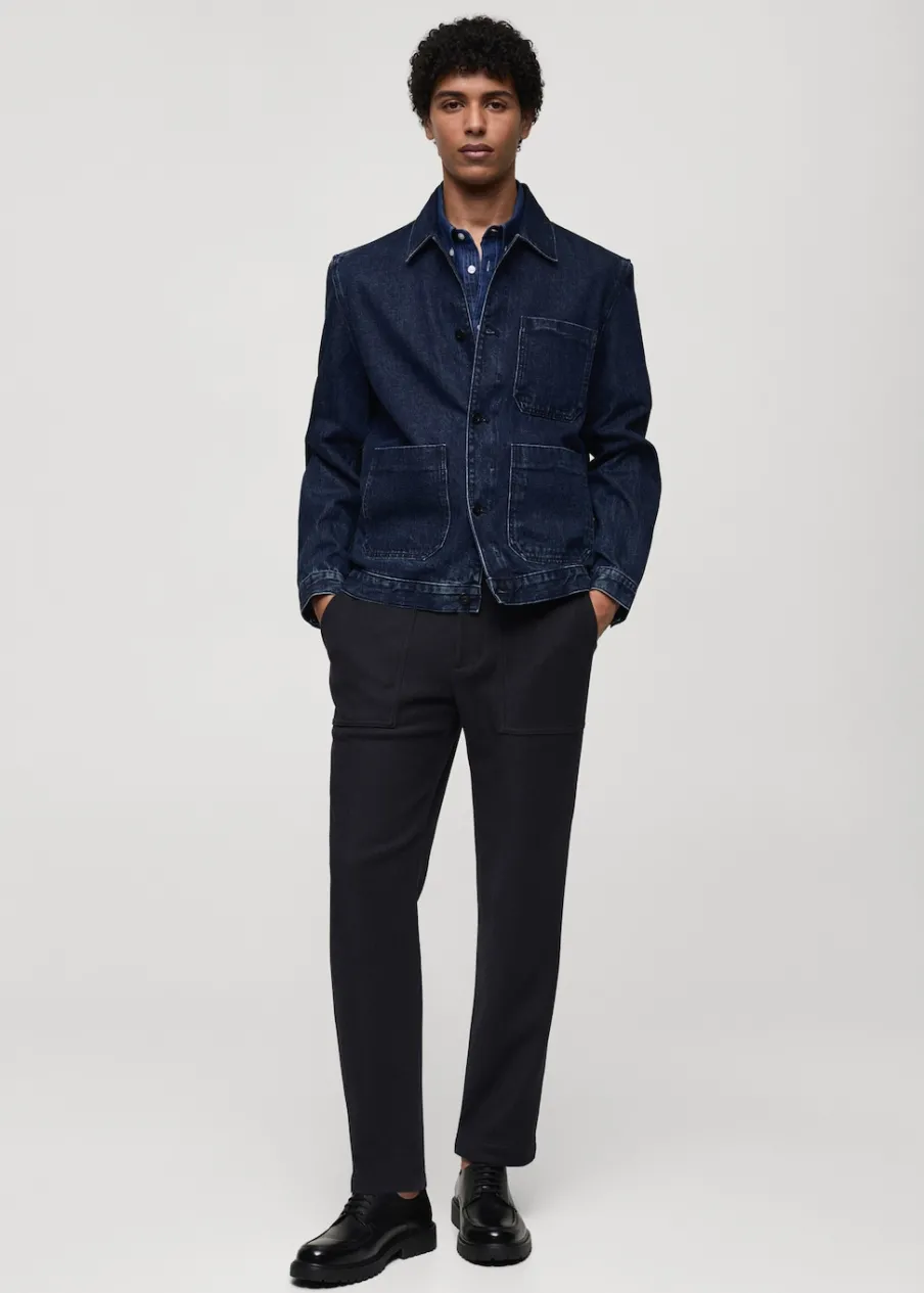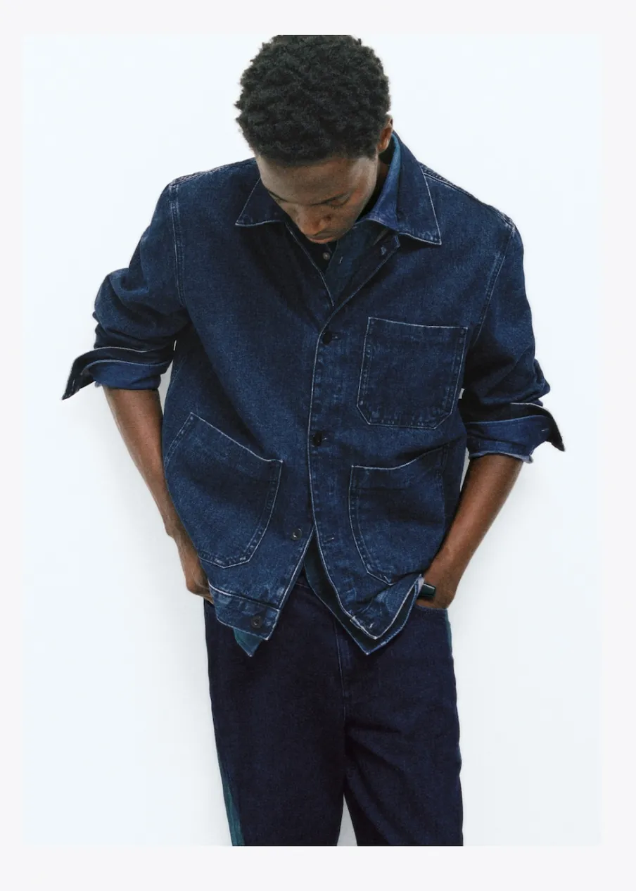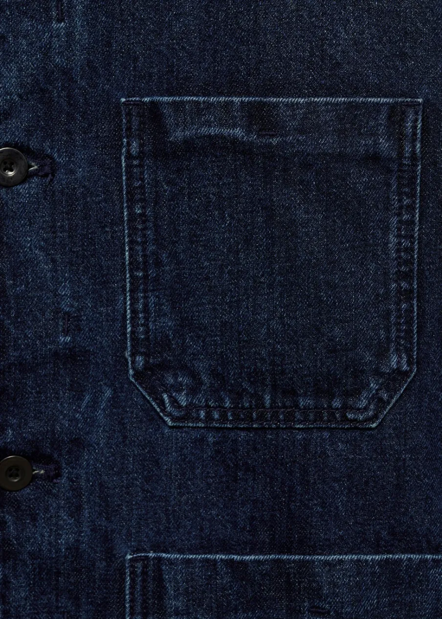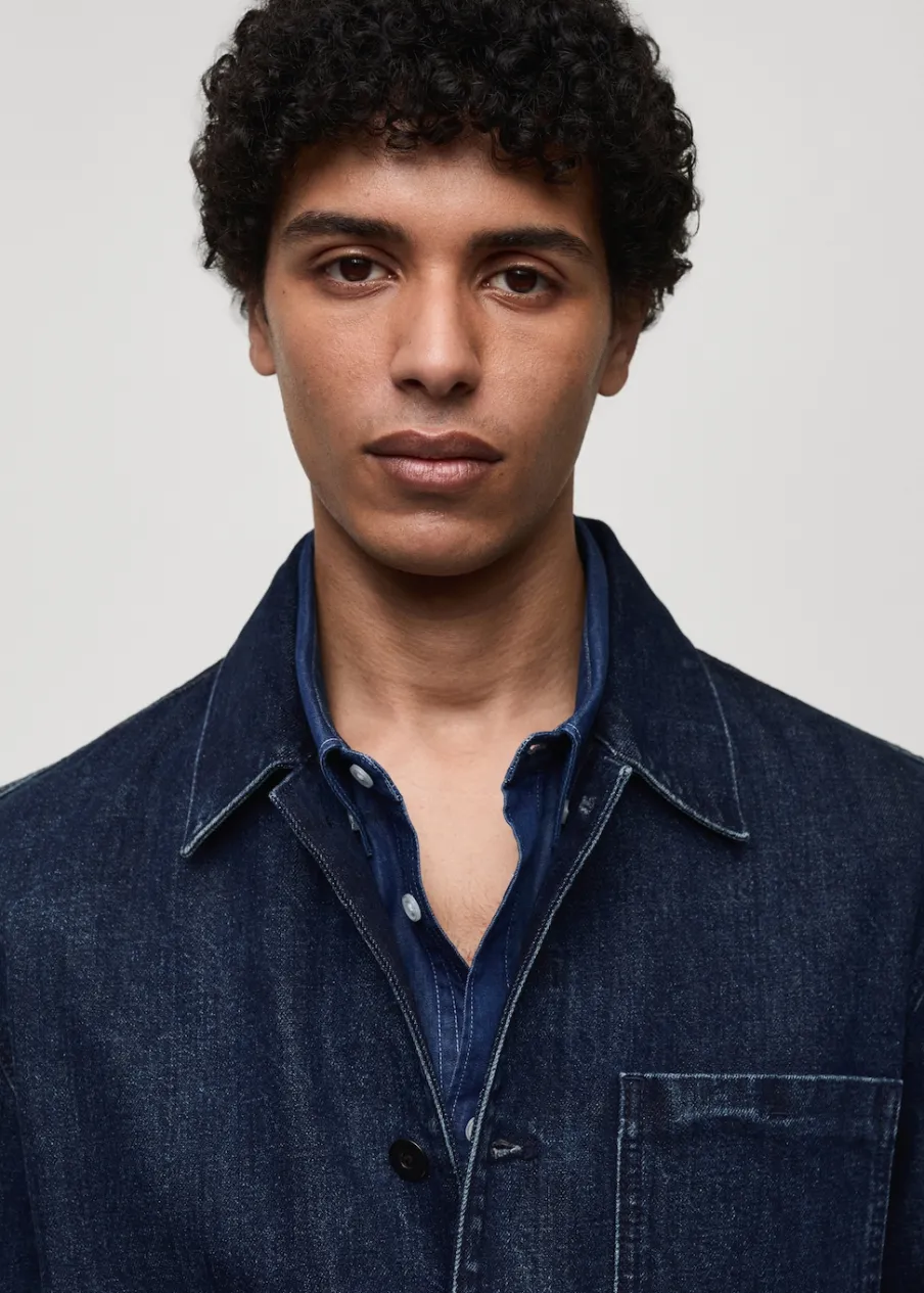 Model dżinsowy. Koszulowy kołnierz. Zapięcie z przodu na guziki. Długi rękaw z guzikami na mankietach. Kieszeń nakładana na piersi. Dwie kieszenie nakładane z przodu. Naszywa kieszeń po wewnętrznej stronie. Prosty dół. Model ma 185 cm wzrostu i nosi rozmiar M. Tkanina z 100% bawełny.